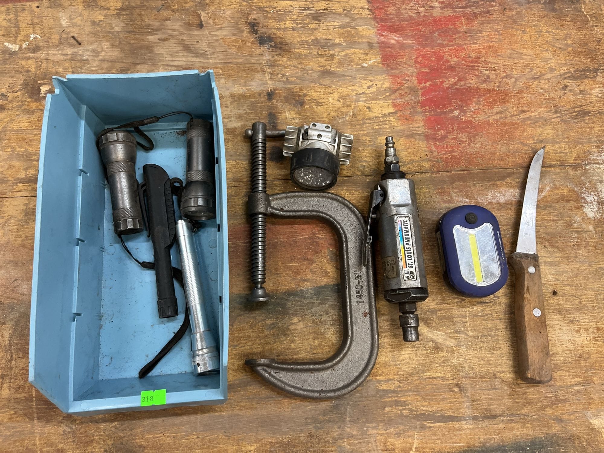 318 CM Air Die Grinder, C Clamp, Flashlights, Misc.