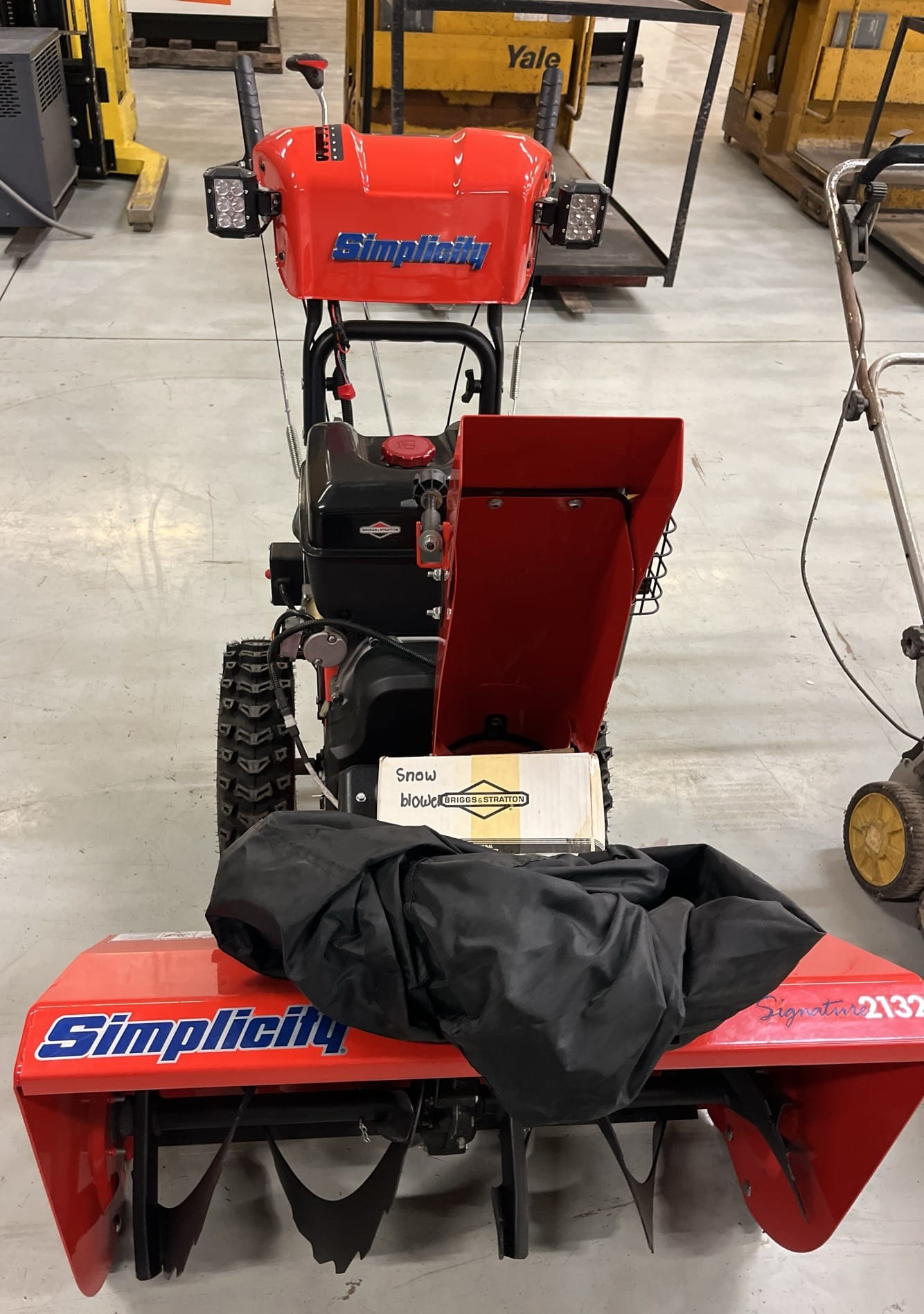 5 2019 Simplicity Signature 2132 Snow Blower, Dual Stage, Tire Chains Kit, Storage Cover, Electric Chute, Light Kit, Electric Start, Hand Warmers, Skid Shoes, Clear Out Tool. Purchased New Was Used Once, Like New!