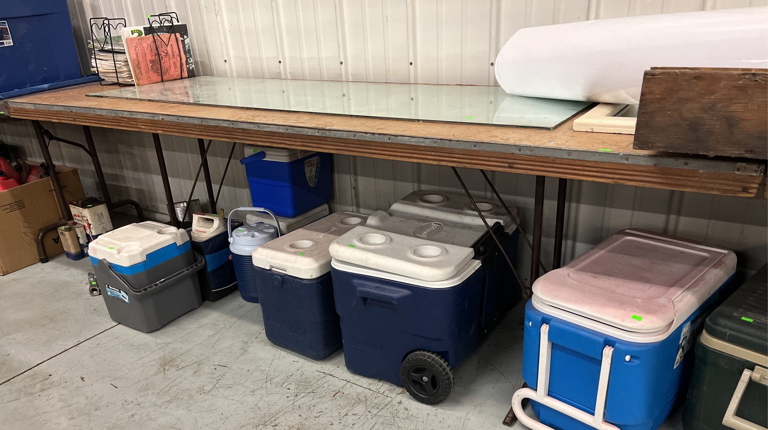 601 Wood Table - No Contents Included 8’x30” - PICK UP AT THE END OF LOAD OUT ONLY, BEING USED FOR AUCTION