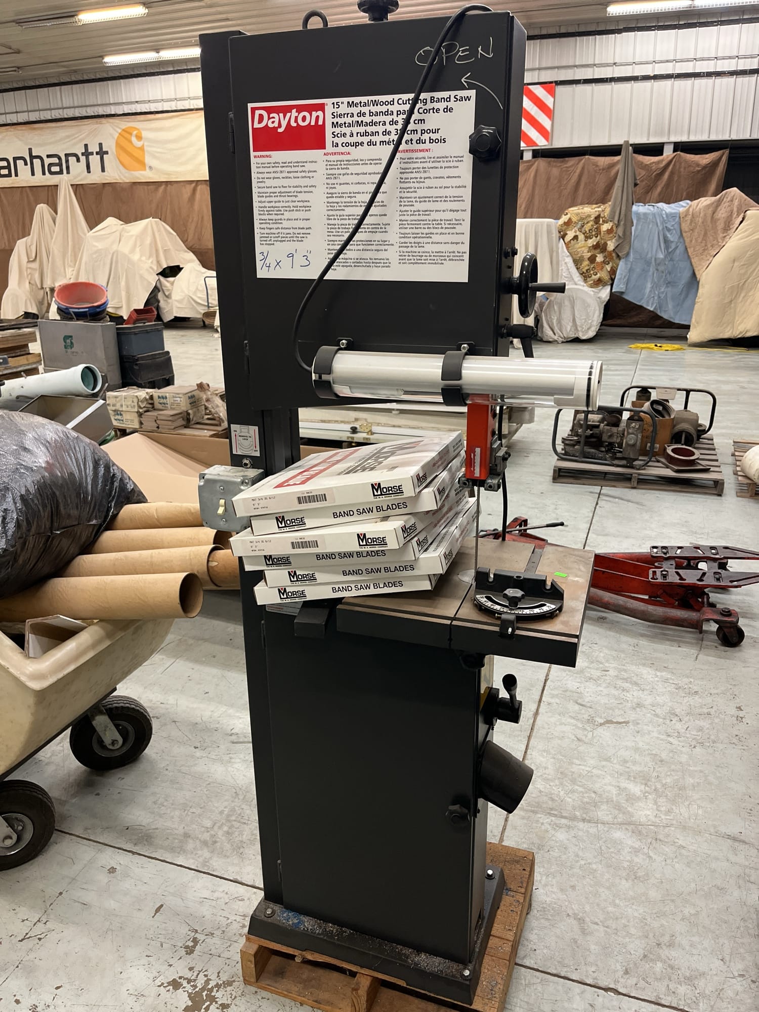 9 Dayton 15" Vertical Band Saw Wood Or Metal, Working Condition, 4 Inch Dust Collection Port, Rotation Table, Three Blade Speed, Tool Kit, Instruction Manual, Six Extra Blades, Very Low Use