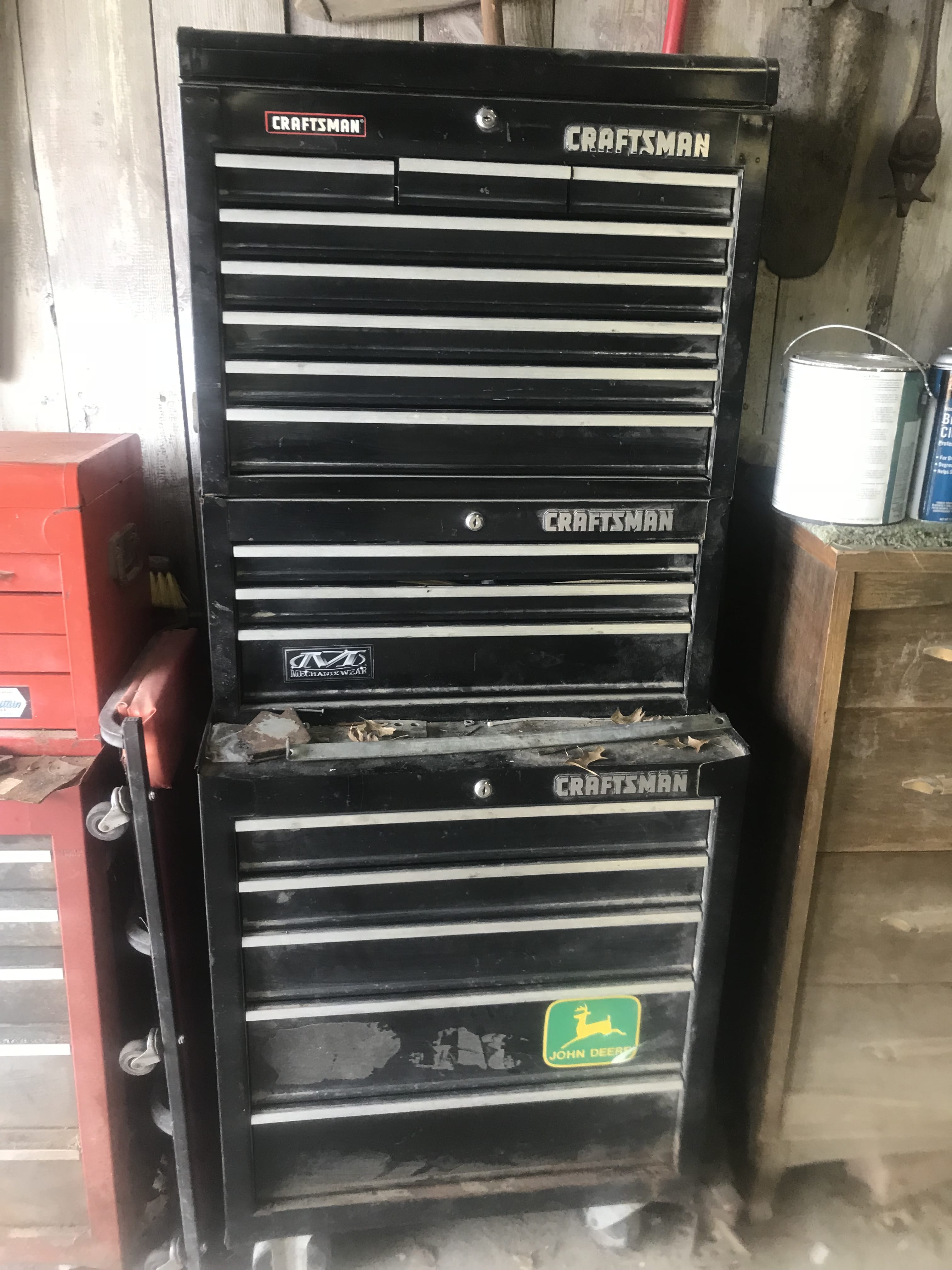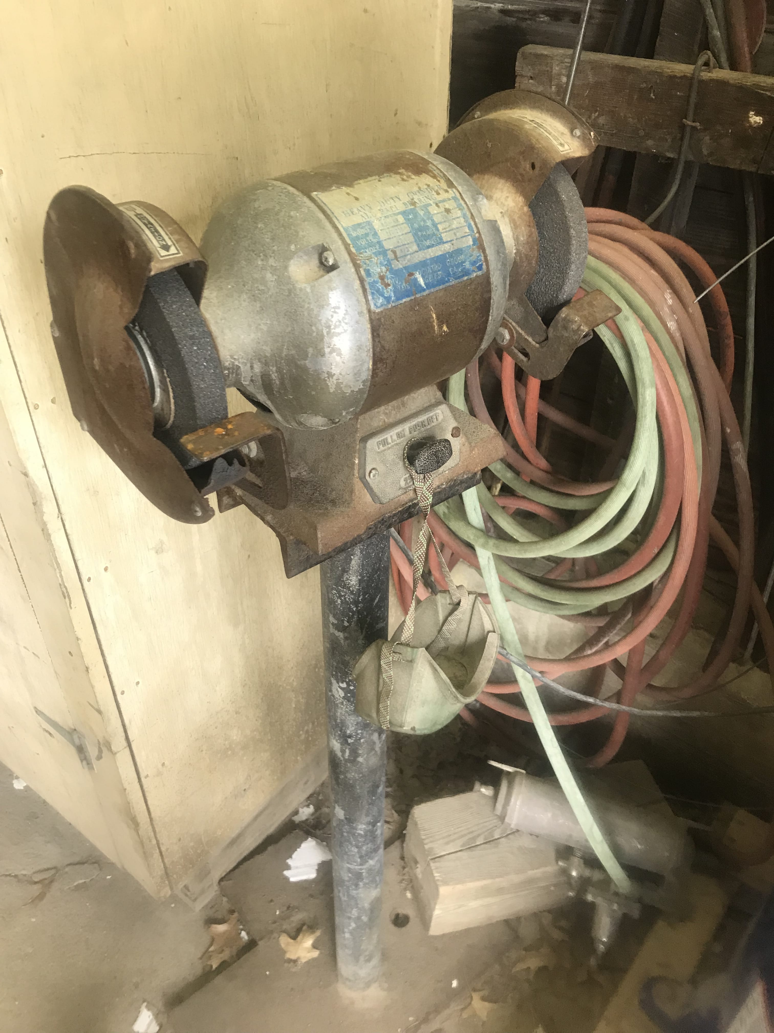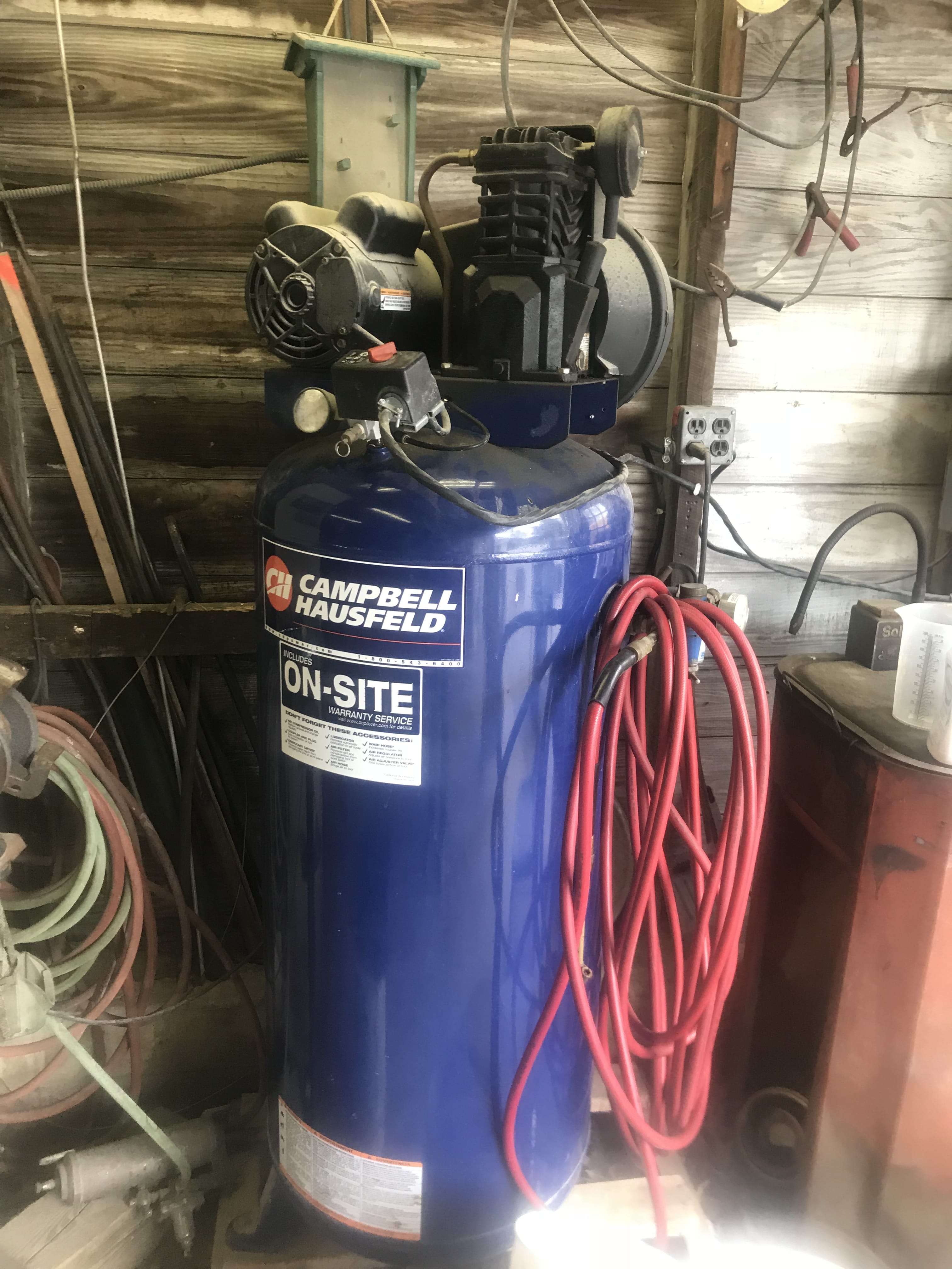 Campbell Hausfeld Upright Air Compressor; Power Back 5250-watt Generator, 10hp; Torch Cart; Gates Parts Washer; Lincoln AC225 Welder; Troybilt 5HP Power Washer; Table Saw; Drill Press; Pedestal Grinder; Battery Chargers; Campbells Airless Paint Sprayer; Wagoner Paint Sprayer; Jawsaw; Power & Hand Tools; Sockets; Wrenches; Asst. Hardware; New Britain Roll-Around Toolbox; Craftsman Roll-Around Toolbox; O Ring Index; Extendable Scaffold Planks; Car Ramps; Alum. Ext. Ladder; Ladders; Come-Along; Chain Binders; Fence Stretchers; Log Chains; Floor Jacks; Jack Stands; Ladder Jacks; Garden Hoses; Dehumidifiers; Fans; Shop Vac; Space Heater; AC Unit, 110 Volt; Coolers; Wabash Valley Picnic Table; Patio Bench; Charbroil Gas Grill; Lawn Chairs; Tennis Rackets;