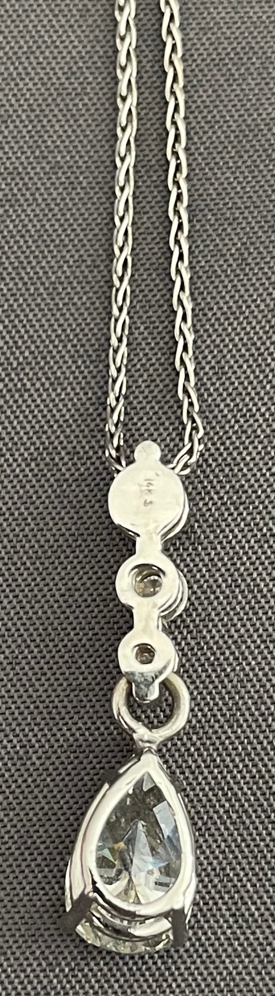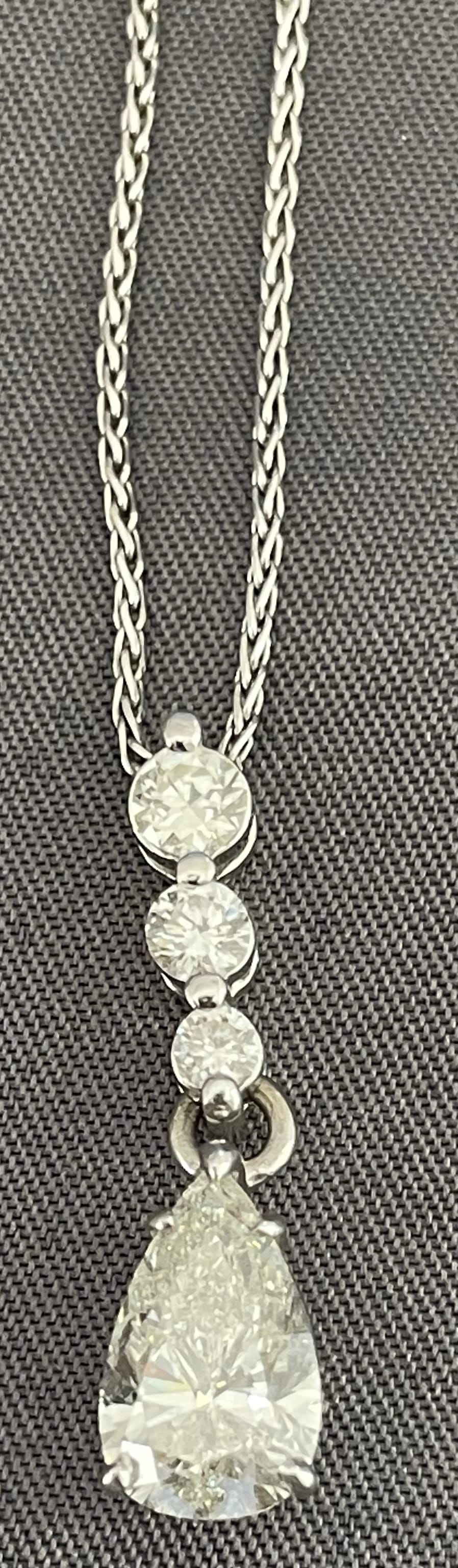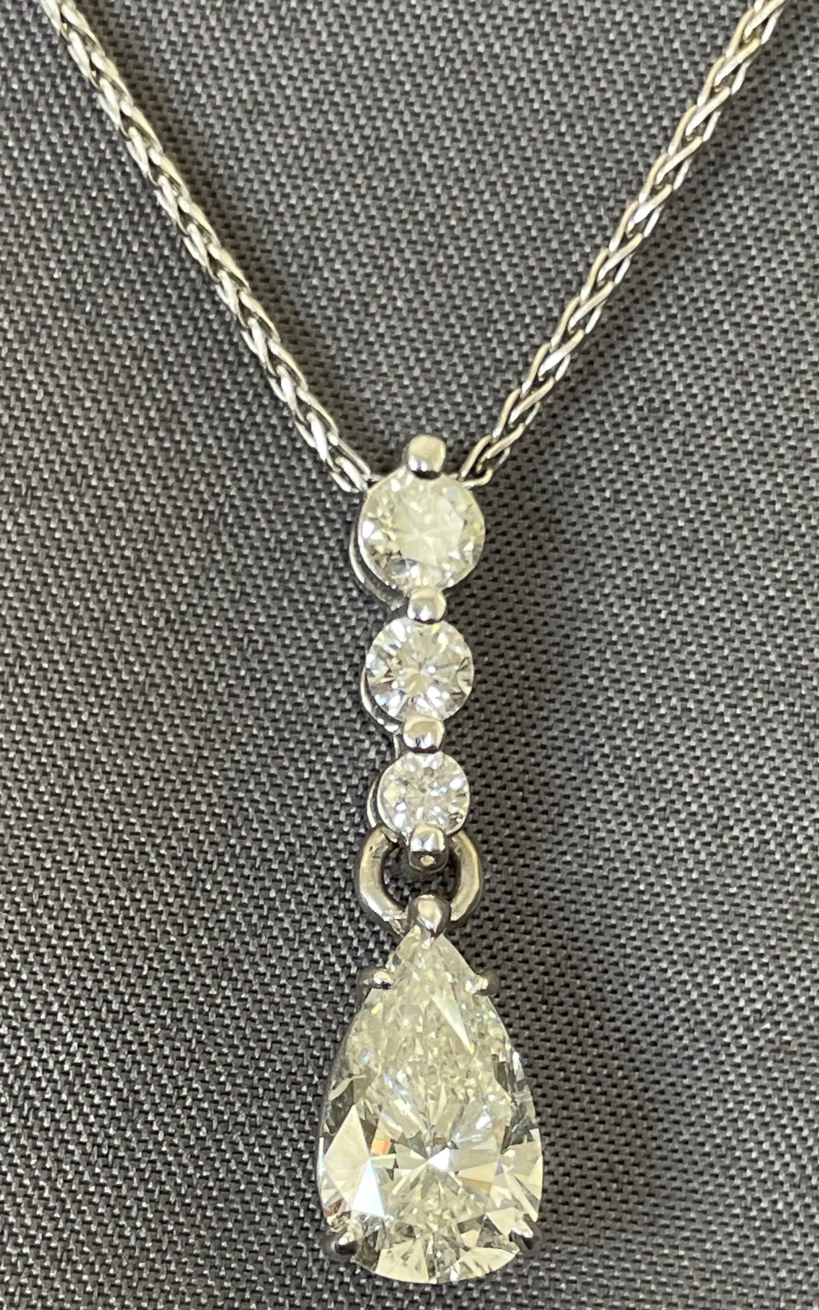 1003 2.02 carat Pear Shaped Diamond Necklace with w/ 14K White Gold 18” Wheat Chain – Pear, 11.4x6.91x4.39 approx. 2.20 ct., SI2, I Color – 3 Round Diamonds: .20 Round Single Cut, .15 Round Brilliant Cut, .07 Round Brilliant Cut, 4.96 Grams, with Box