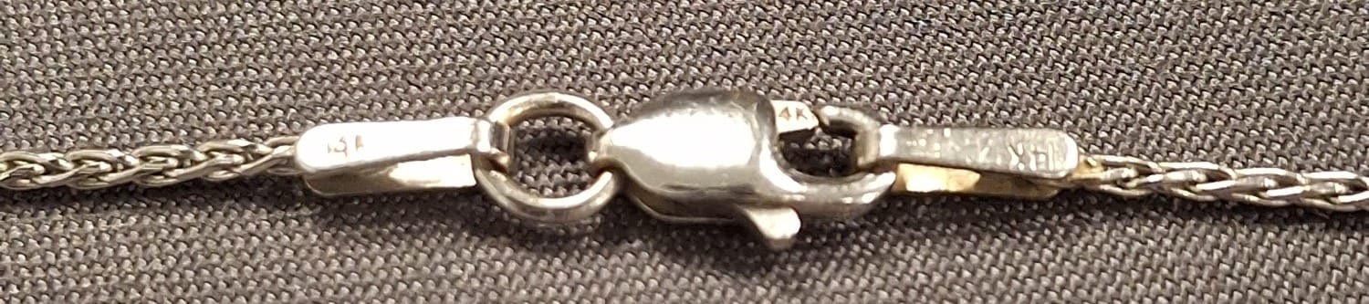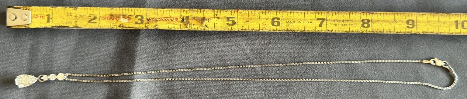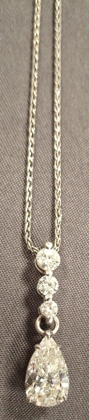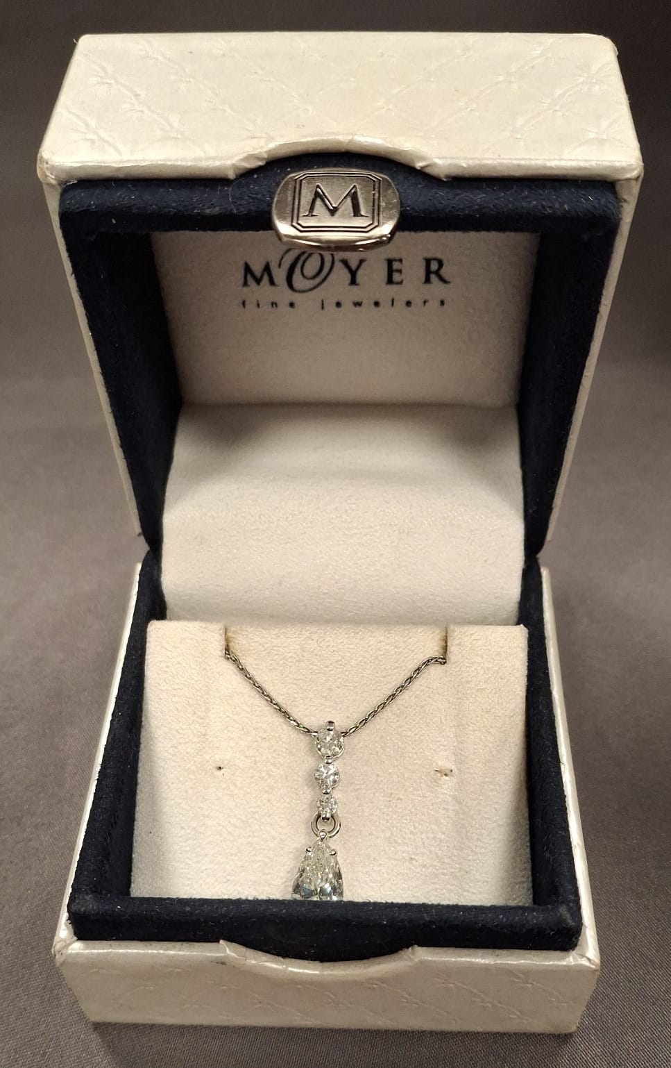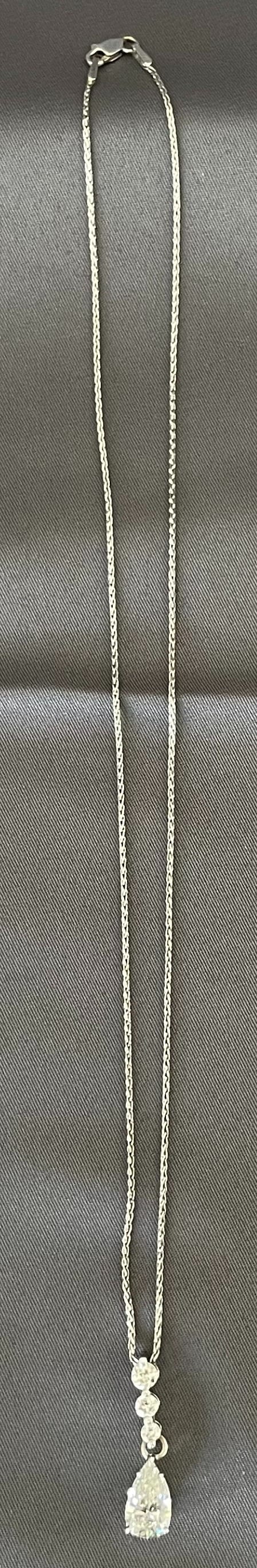 1003 2.02 carat Pear Shaped Diamond Necklace with w/ 14K White Gold 18” Wheat Chain – Pear, 11.4x6.91x4.39 approx. 2.20 ct., SI2, I Color – 3 Round Diamonds: .20 Round Single Cut, .15 Round Brilliant Cut, .07 Round Brilliant Cut, 4.96 Grams, with Box