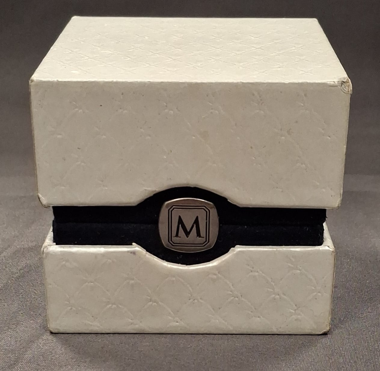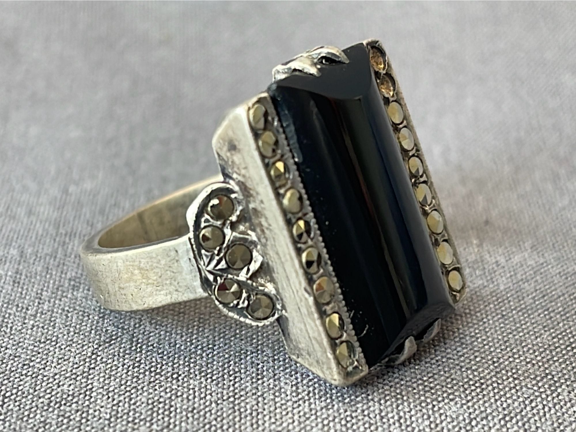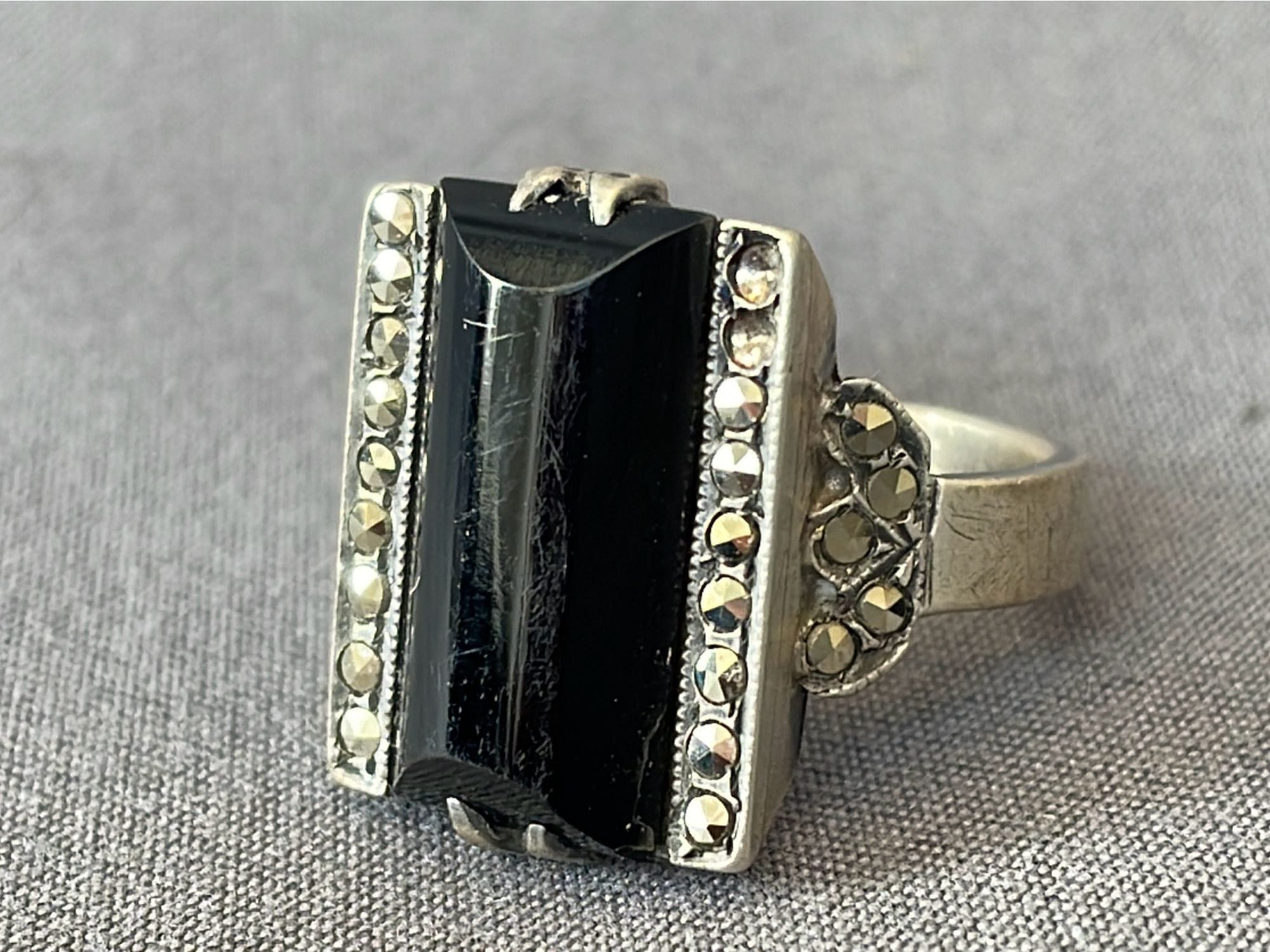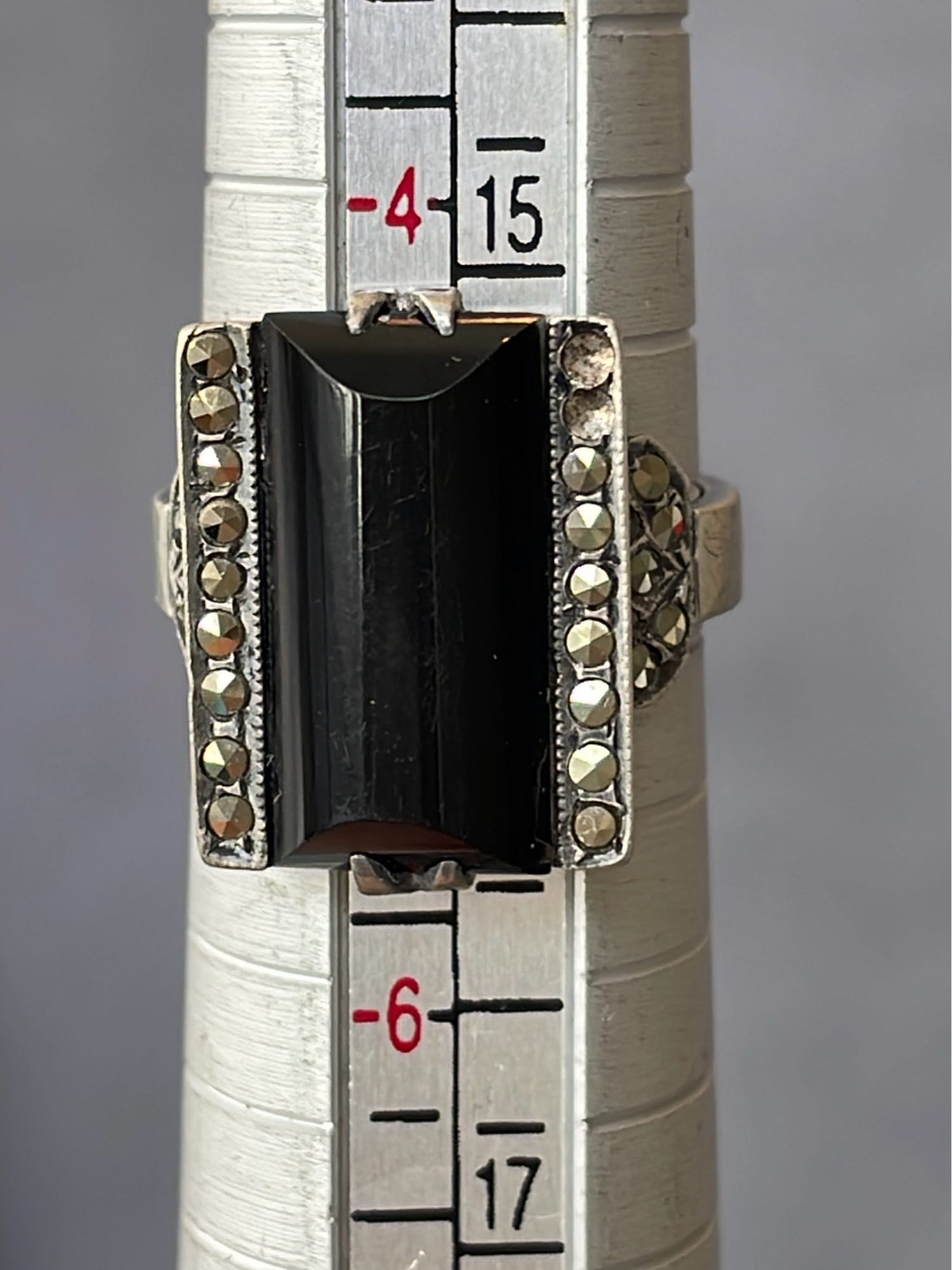 1102 1930s Sterling Silver Ring with Black Onyx and Marcasite with Box