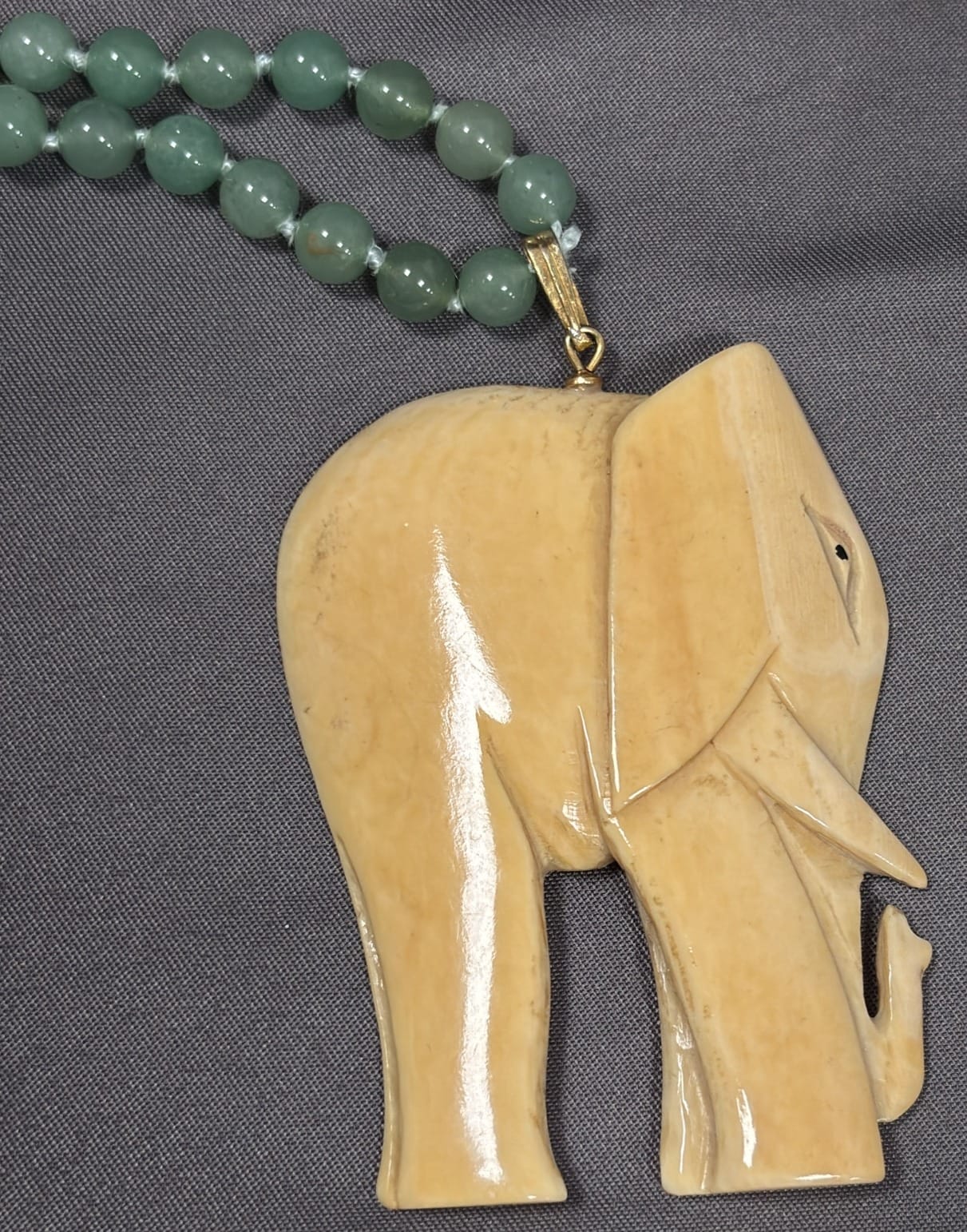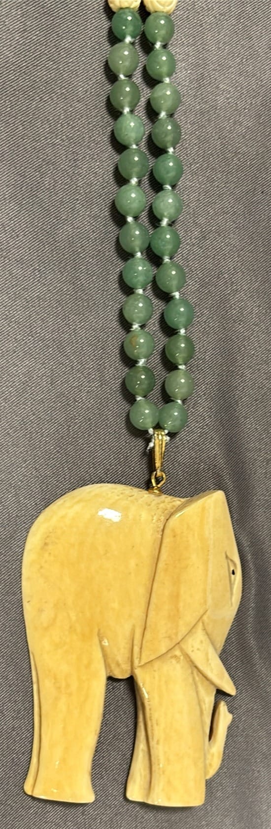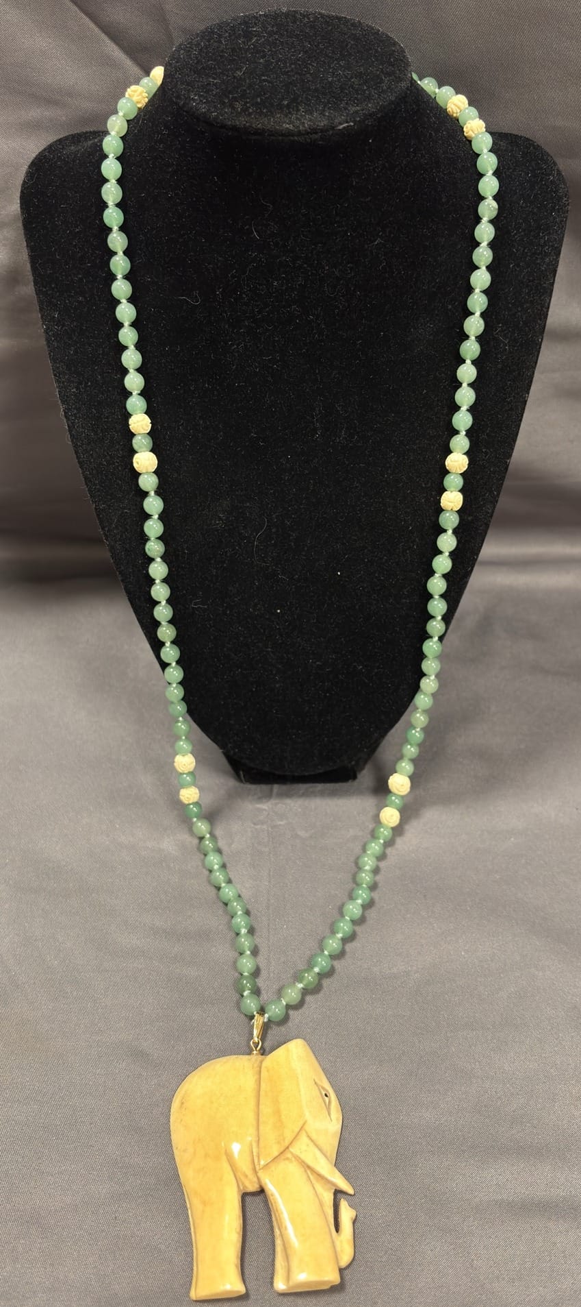 1004 Carved African Style Elephant with Jade Necklace in Box- 30 inch