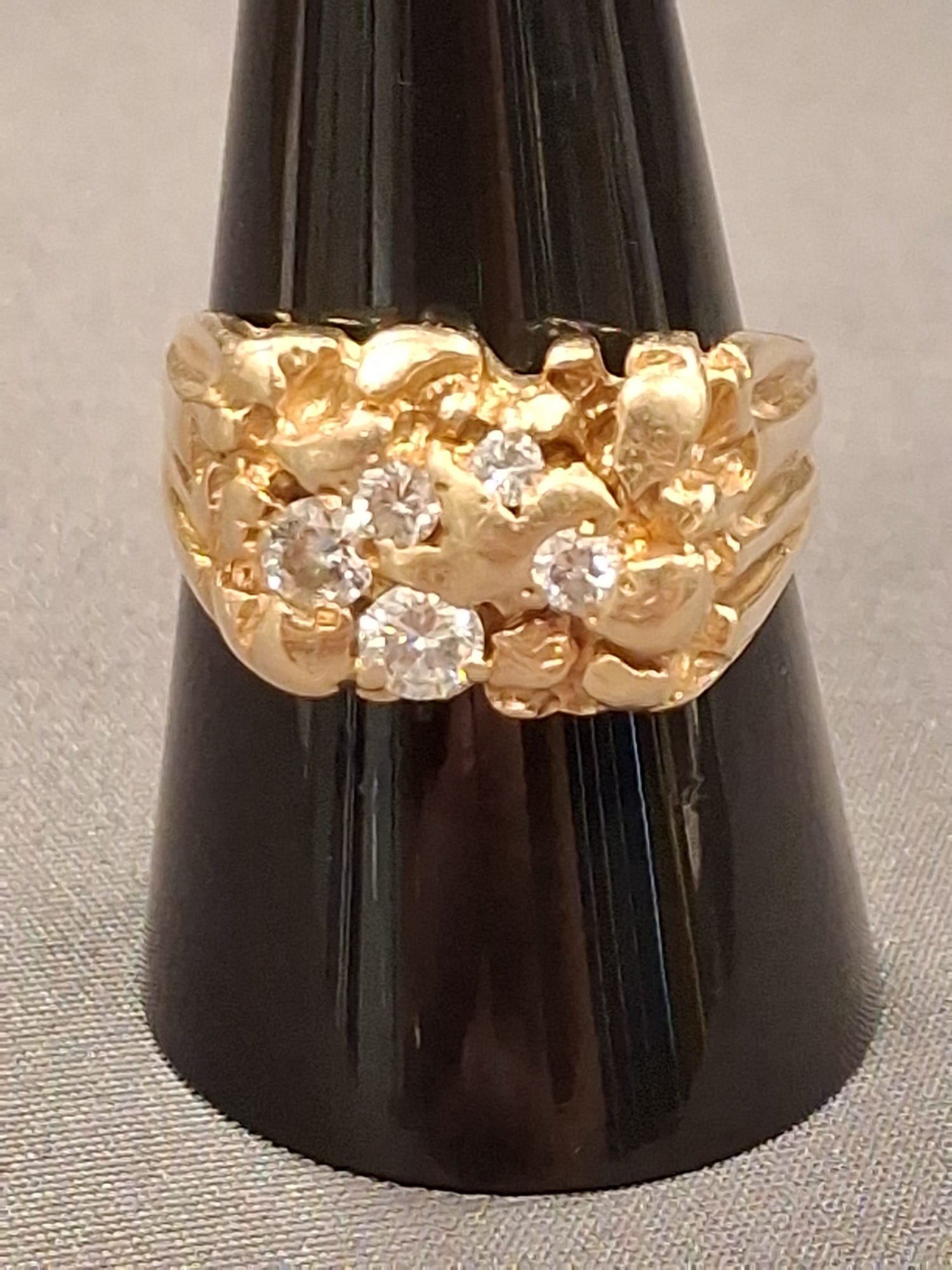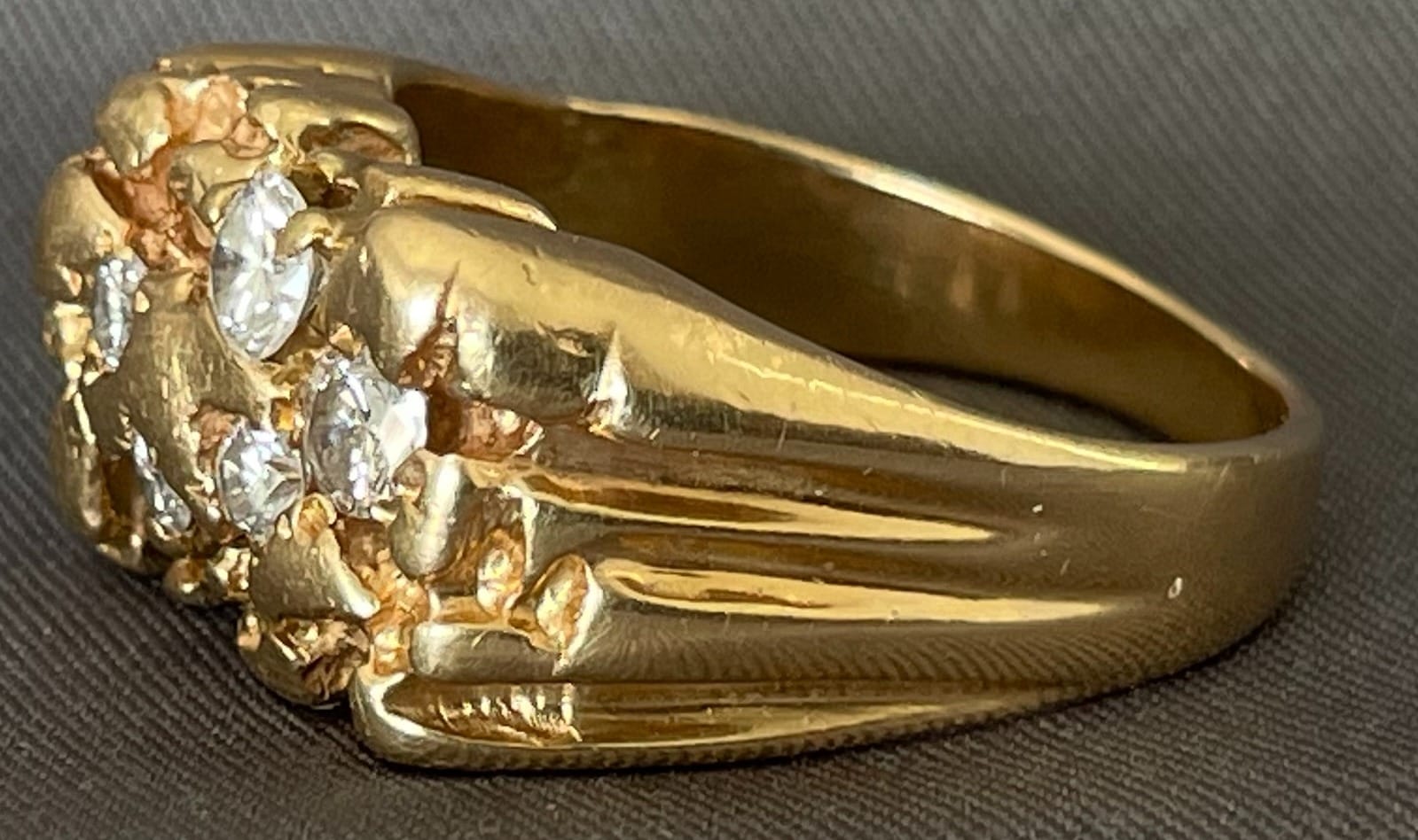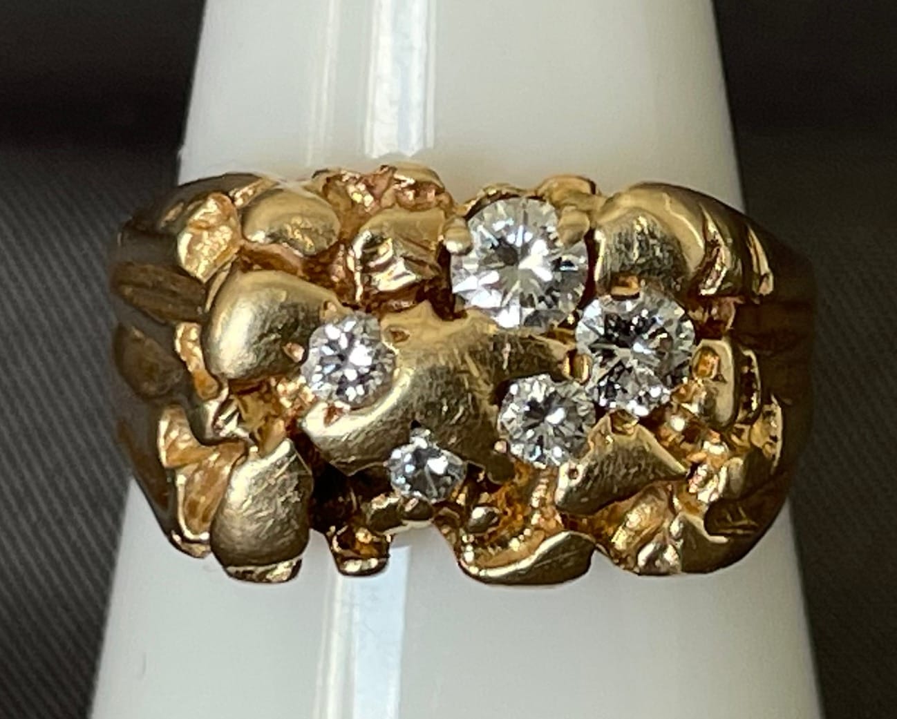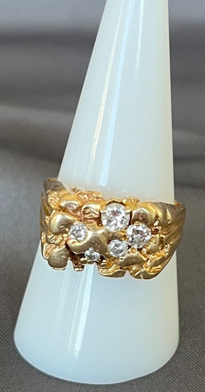 1006 Men’s Diamond & Gold Nugget Ring, 14K Gold, 11.1 grams, Diamonds: SI2, G Color, .22, .18, .08, .07, .04 = .59 TDW, no stamp from when resized, with Box