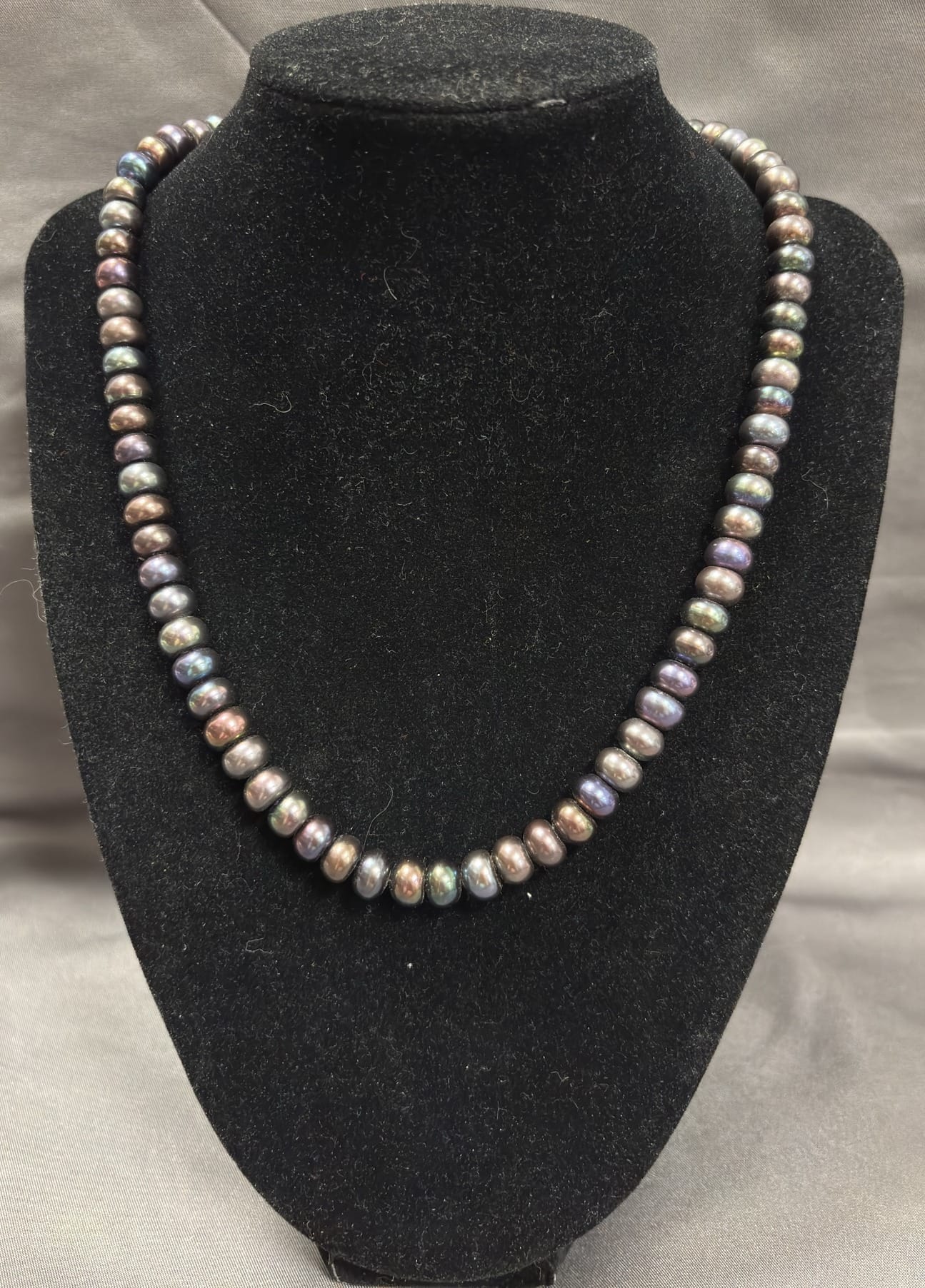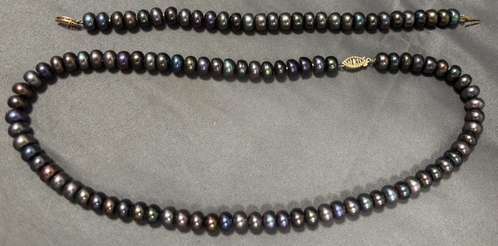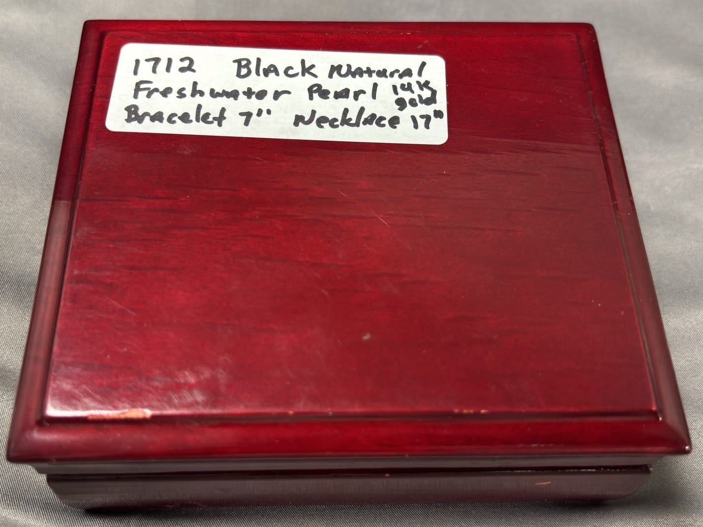 1011 Natural Freshwater Black Pearl 17 inch Necklace, 7 inch Bracelet Set with 14k Gold Clasps and Box