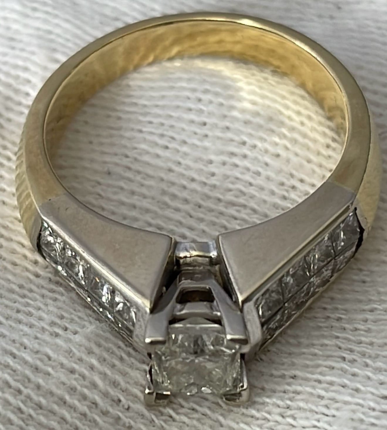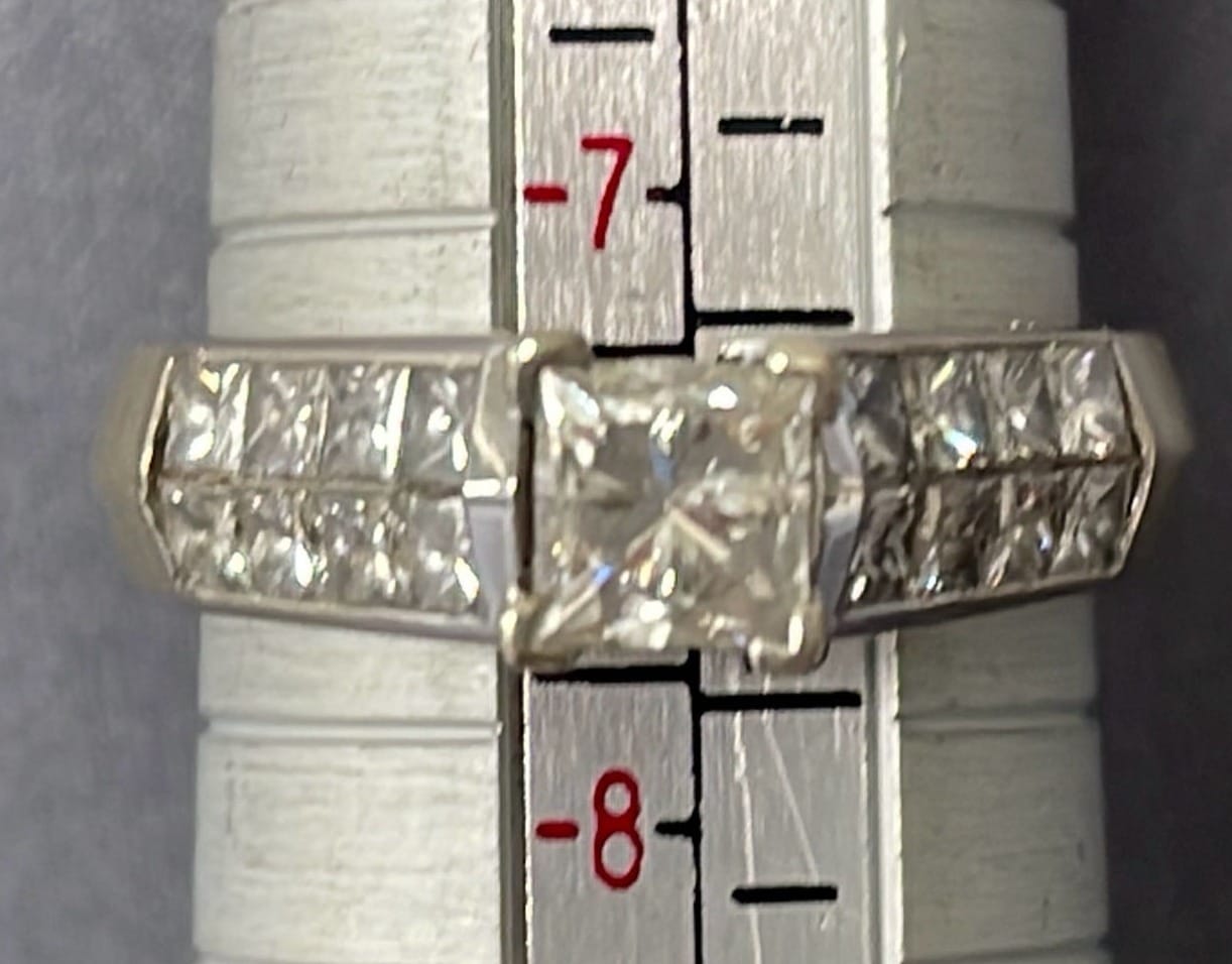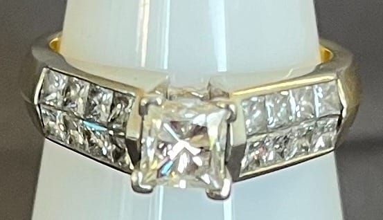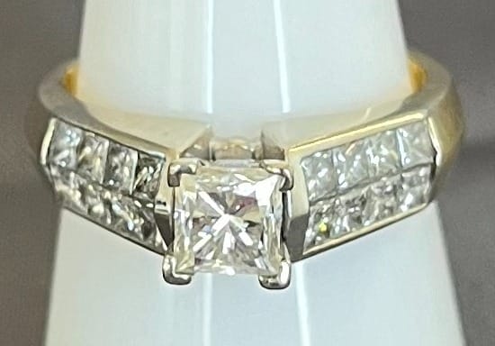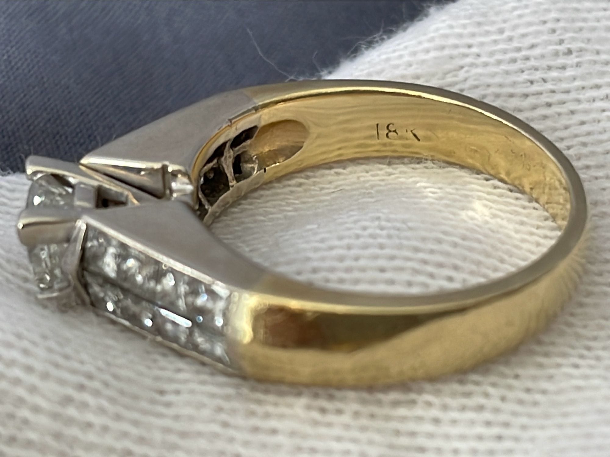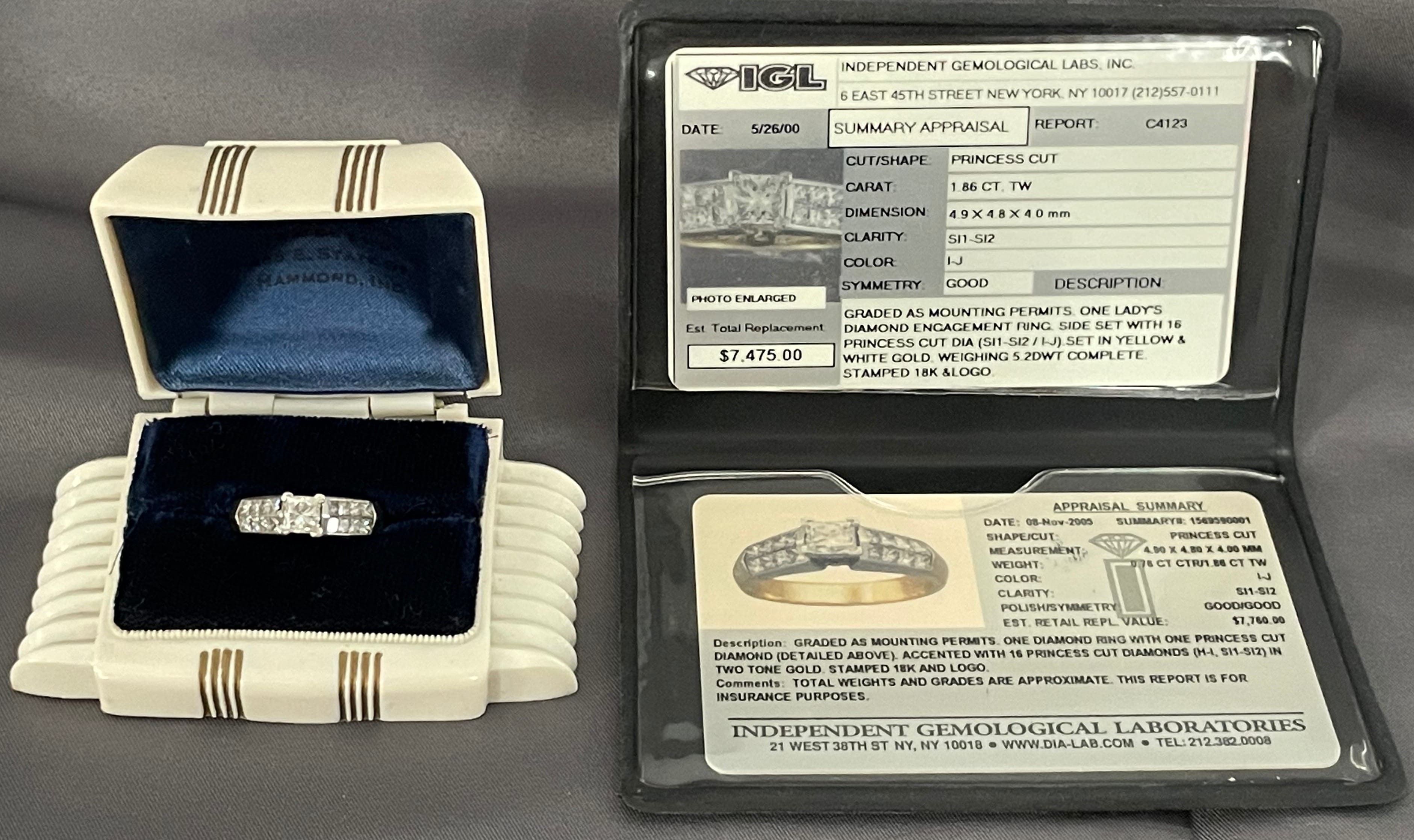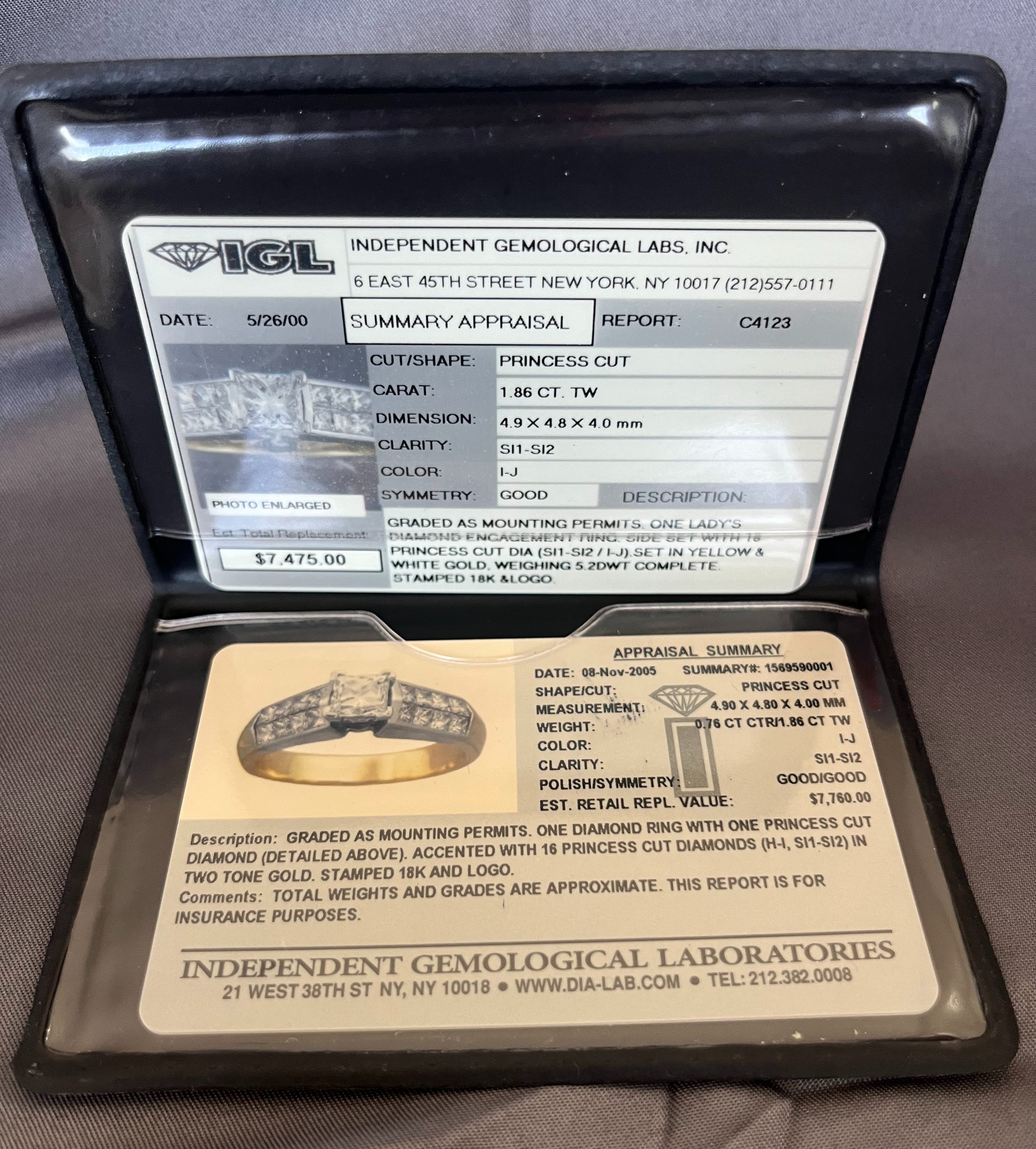 1014 Princess Cut 1.86 Carat Total Weight Diamond, 18 Karat Gold Ring with Box and Appraisal