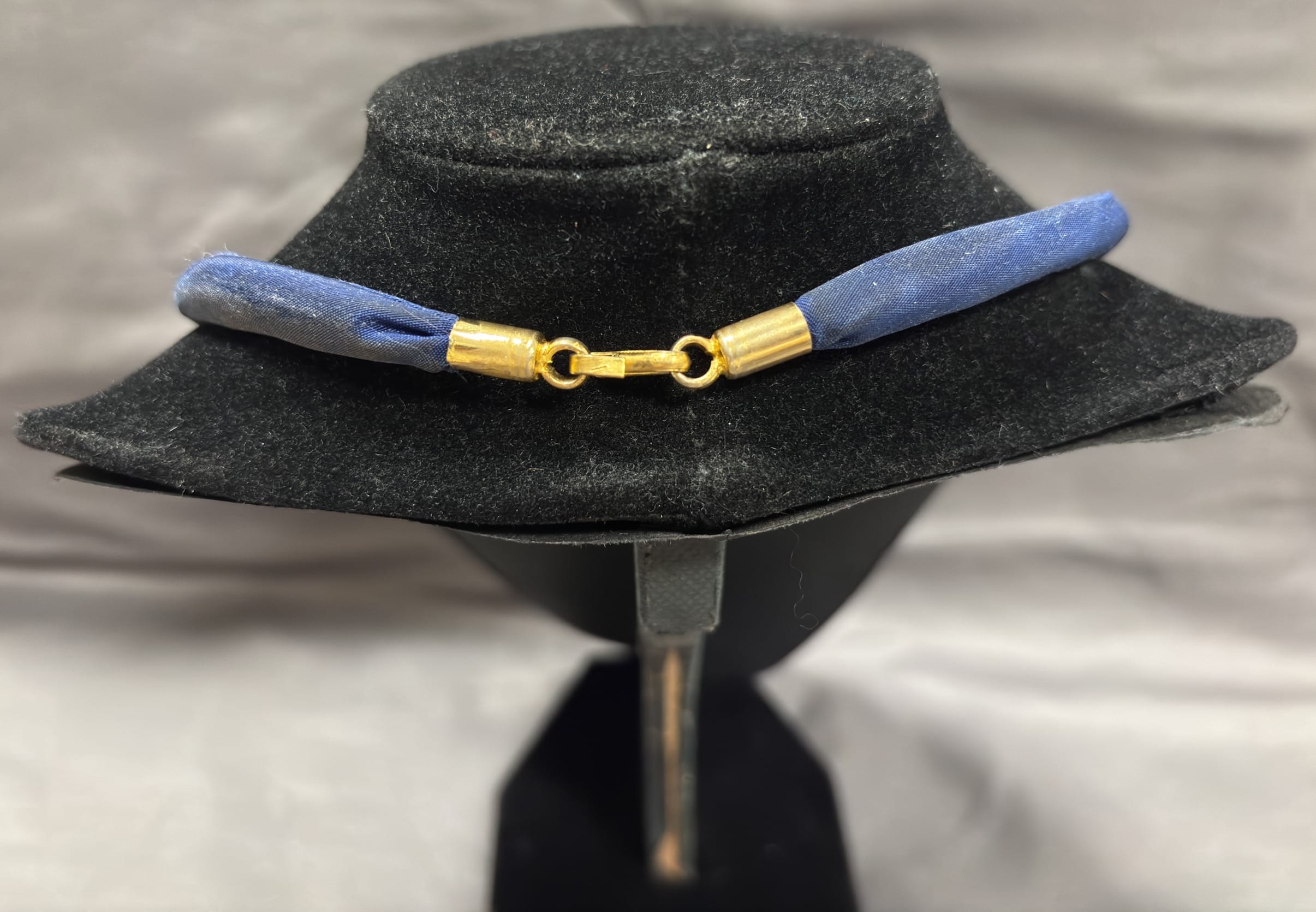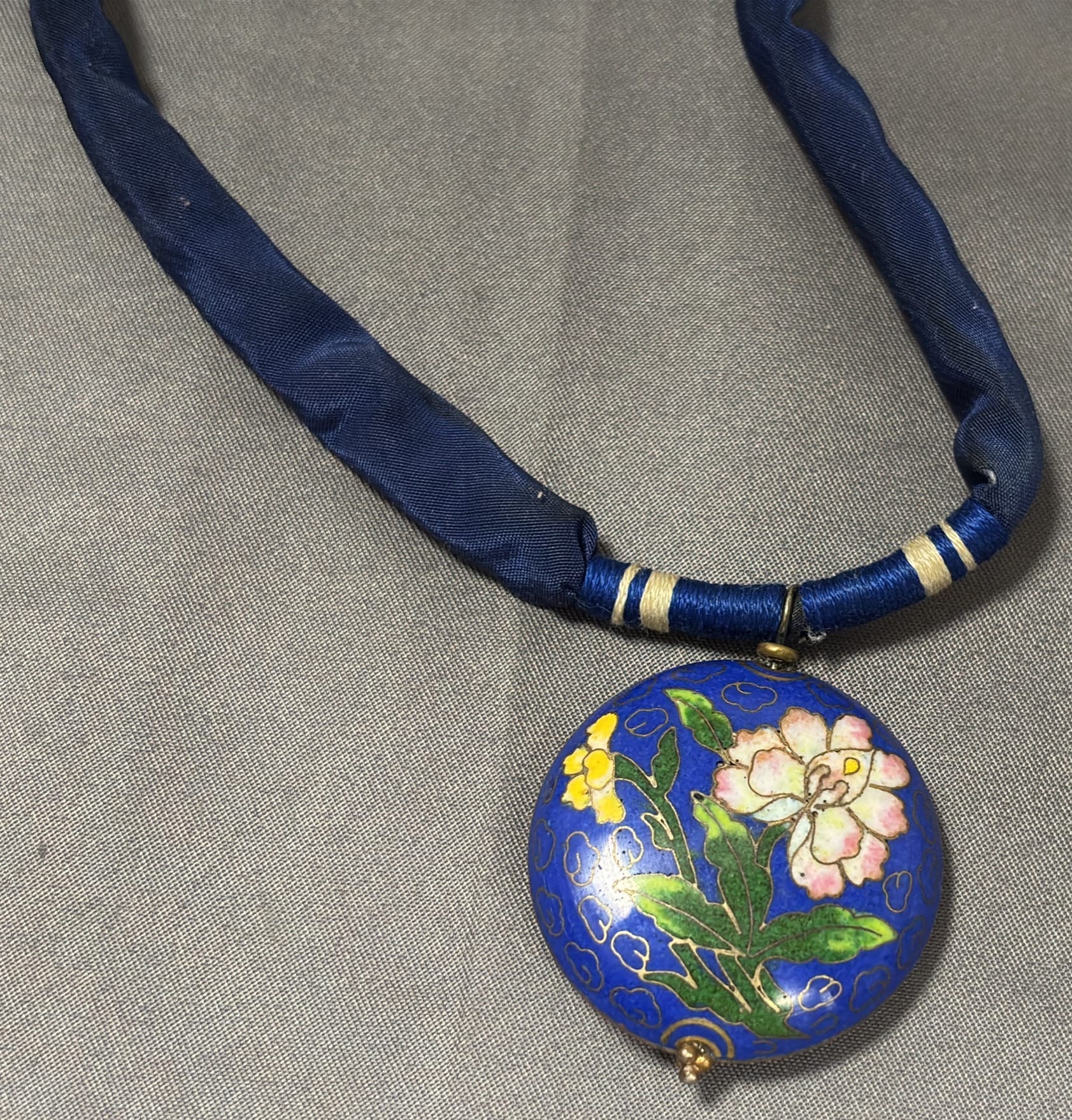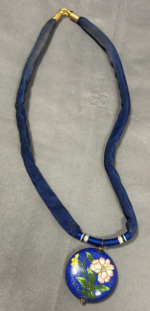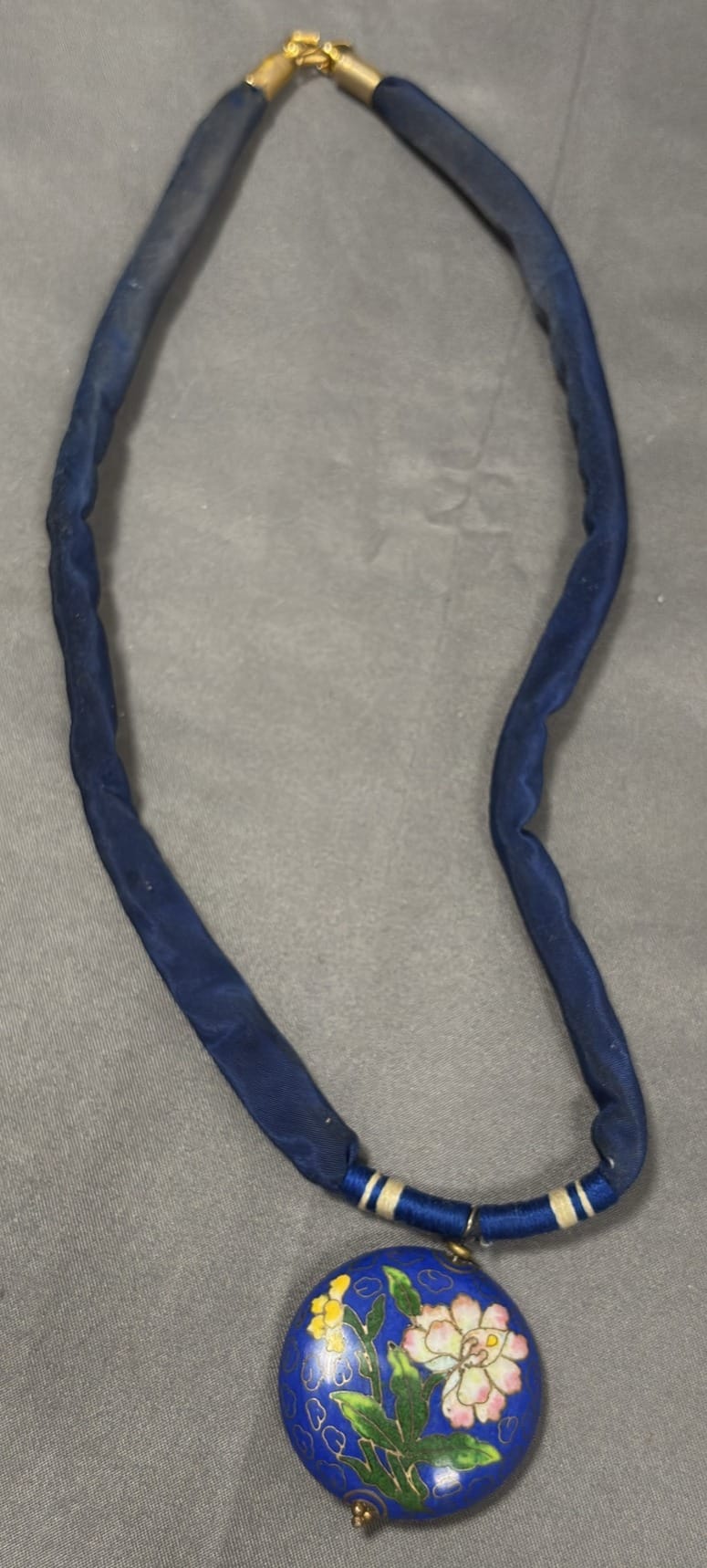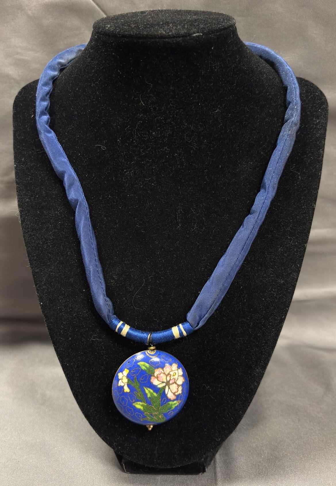 1017 Vintage Laurel Blue Silk 18 inch Necklace with Cloisonne Flower Pendant