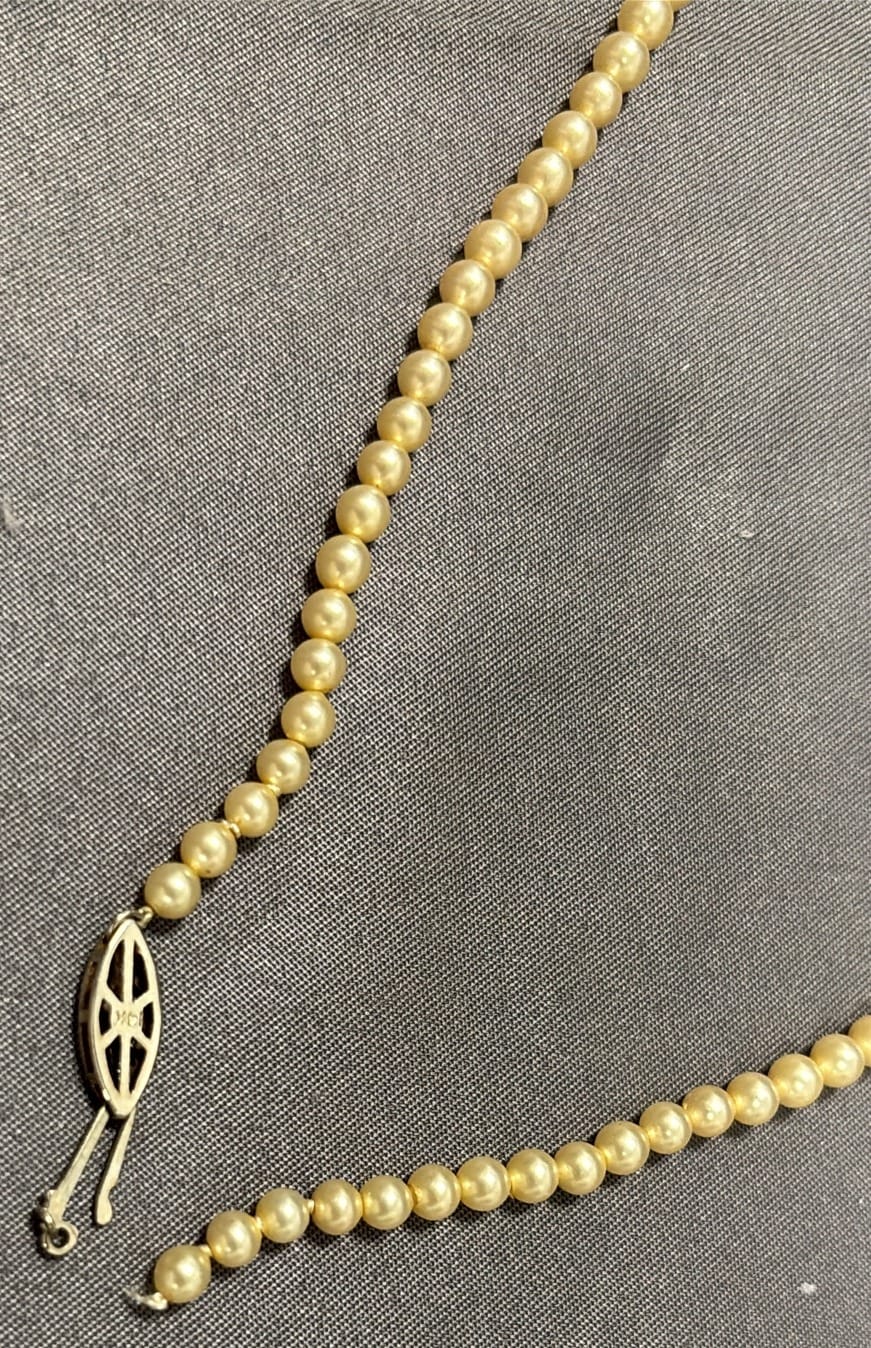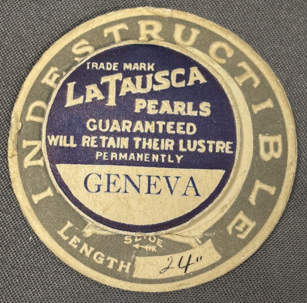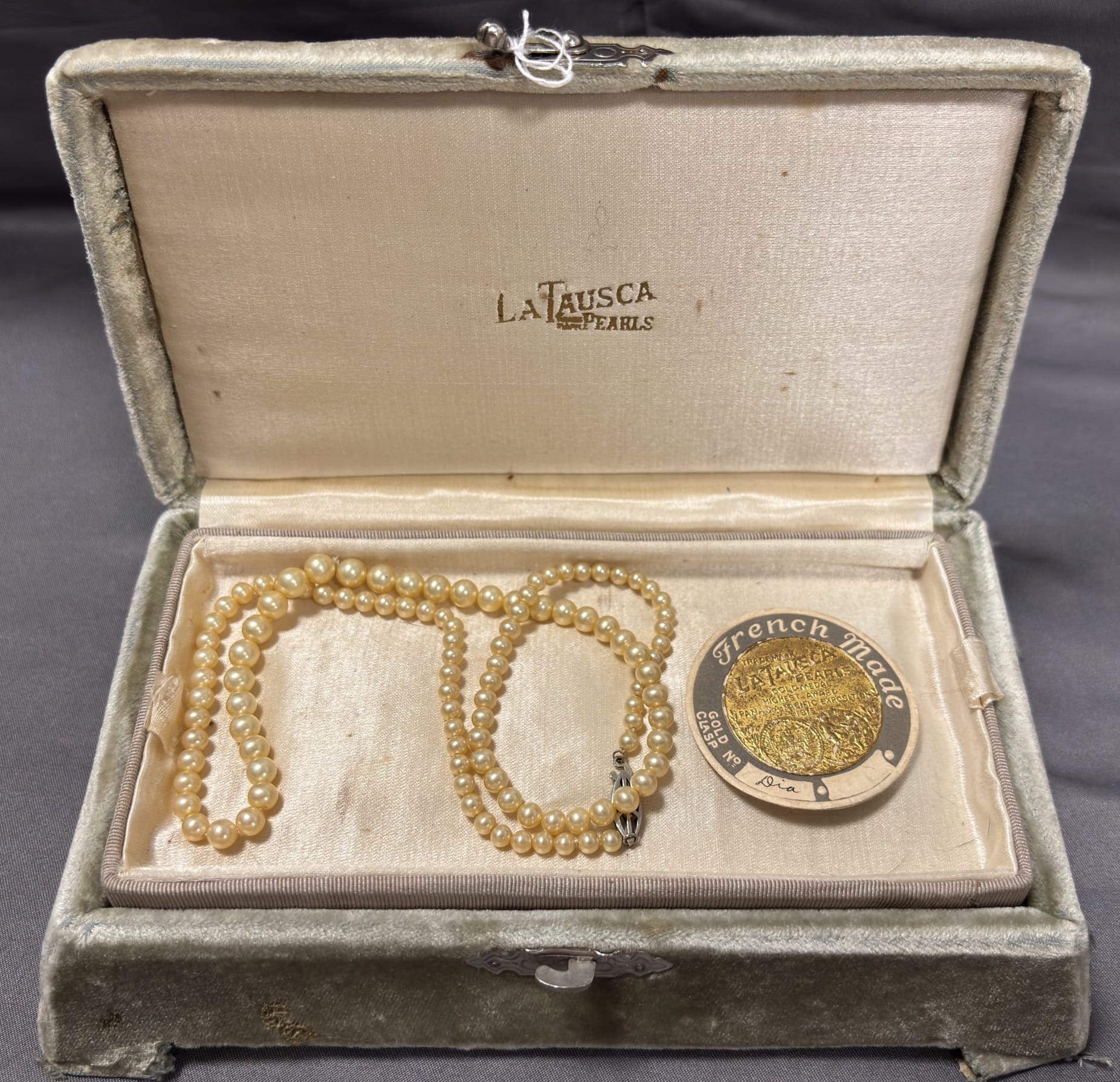 1023 1920s 24 Inch French Made Latausca Pearl Necklace with 14K Gold Clasp and Box (all pearls still intact on string)