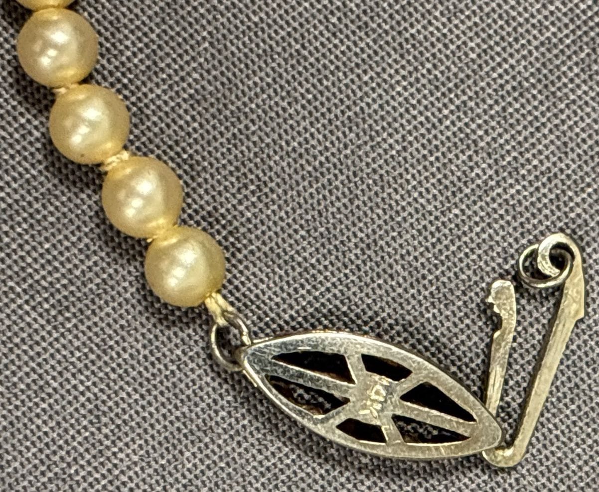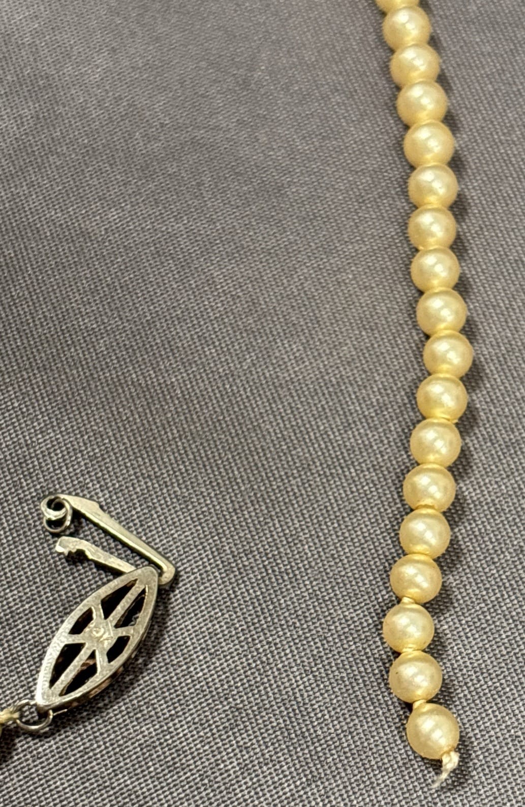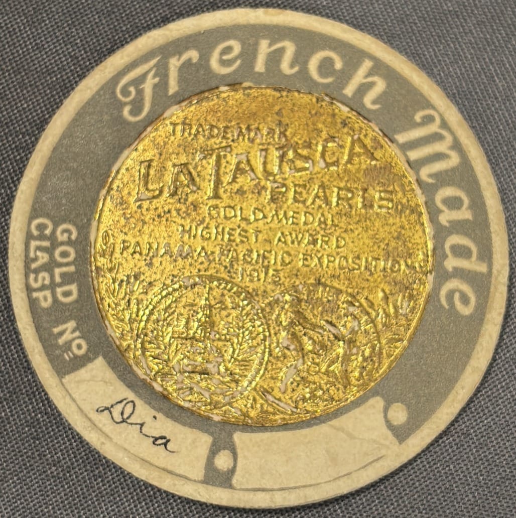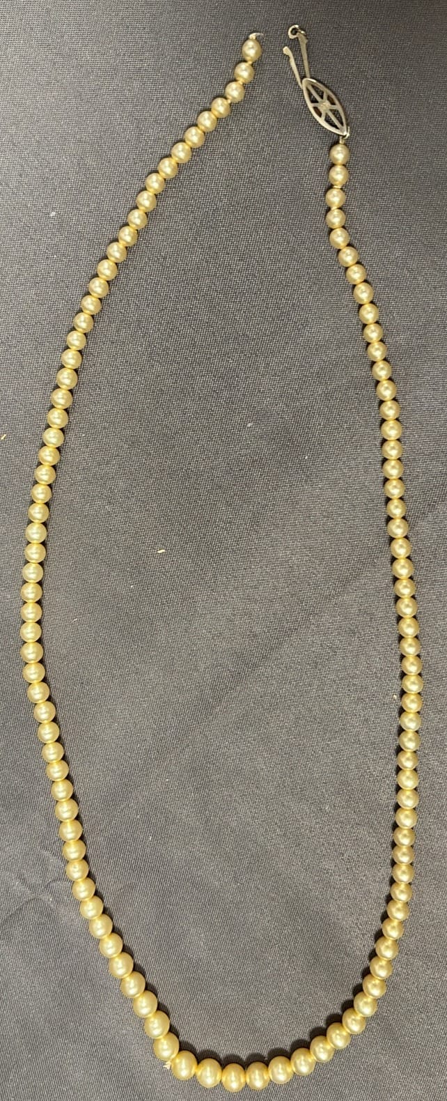 1023 1920s 24 Inch French Made Latausca Pearl Necklace with 14K Gold Clasp and Box (all pearls still intact on string)