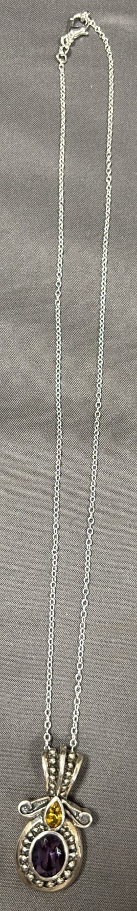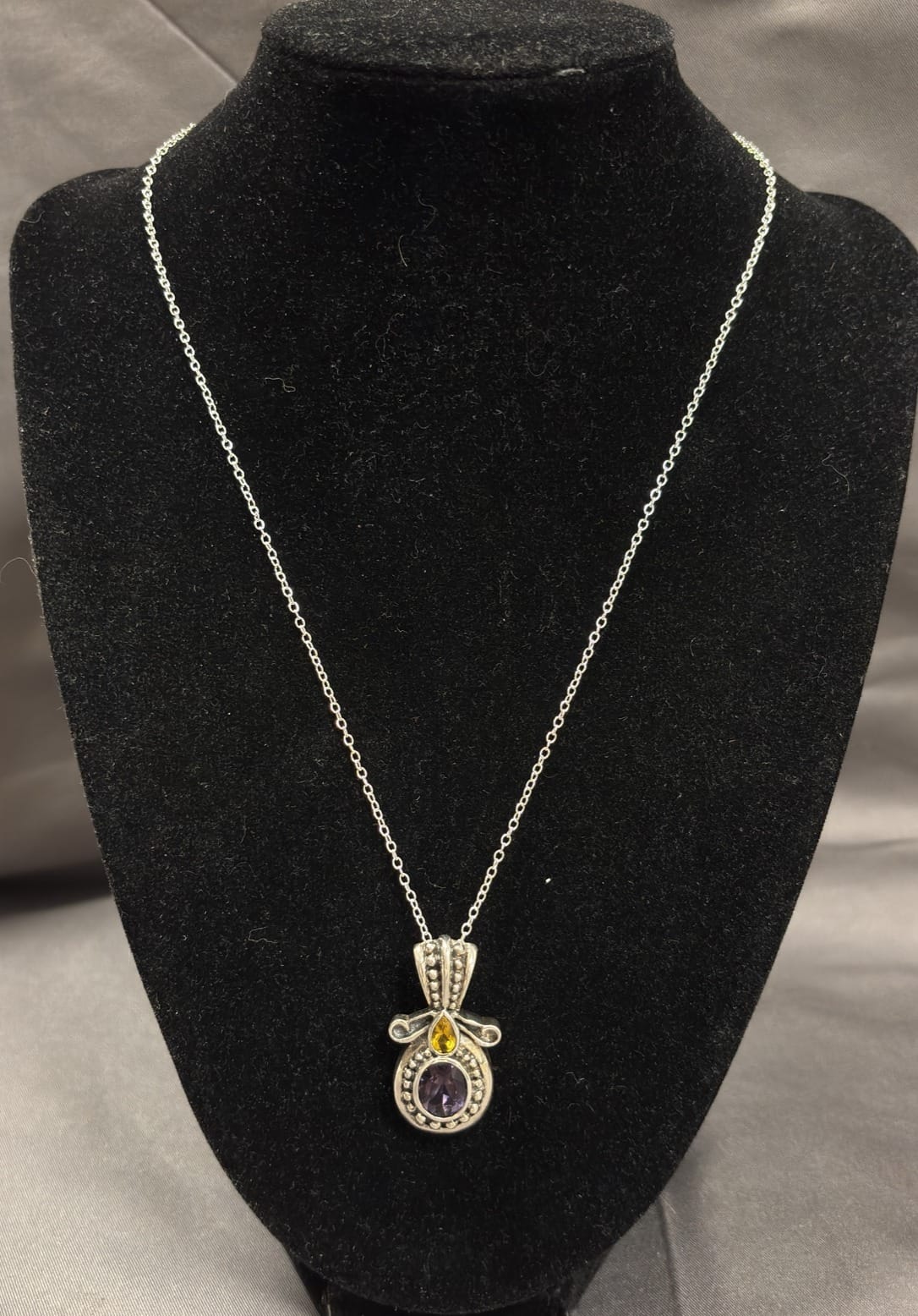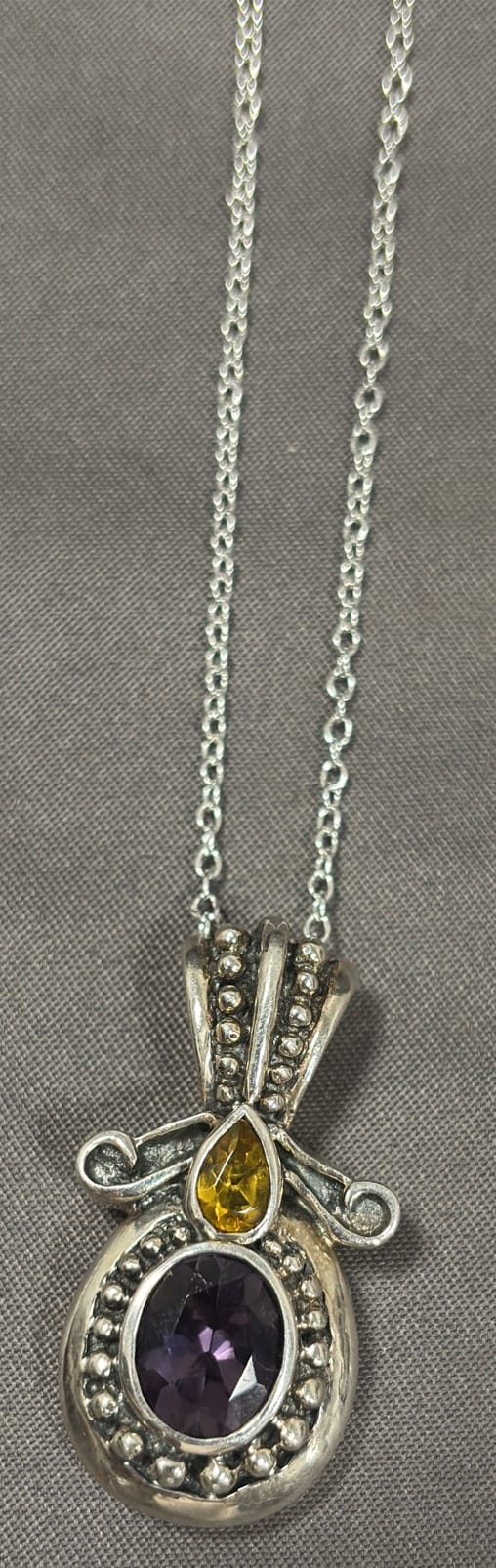 1027 Heavy .925 Silver Pendant with Purple and Yellow Stones on 16 inch .925 Silver Chain