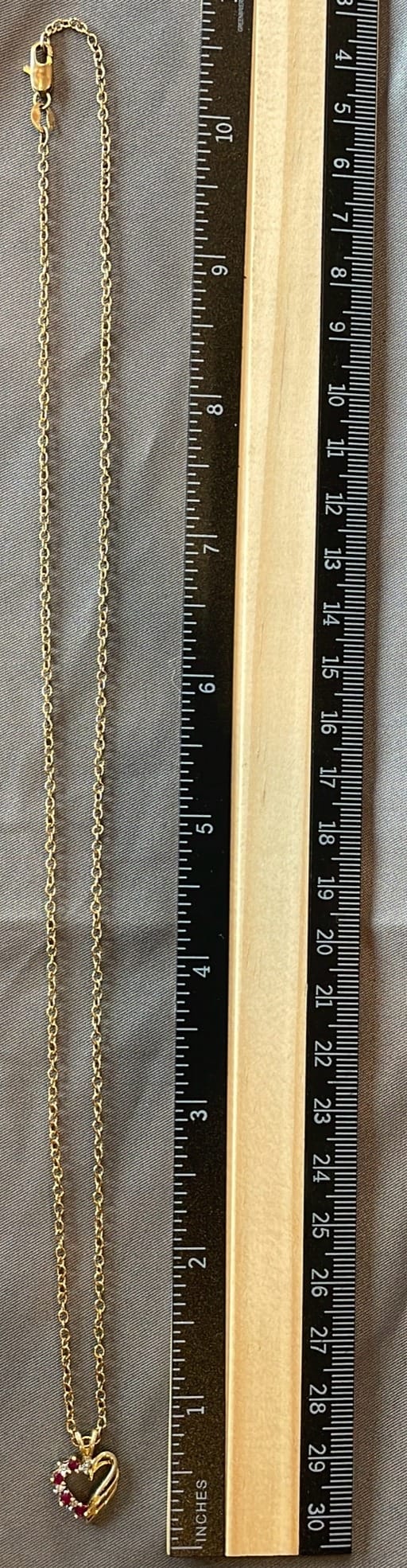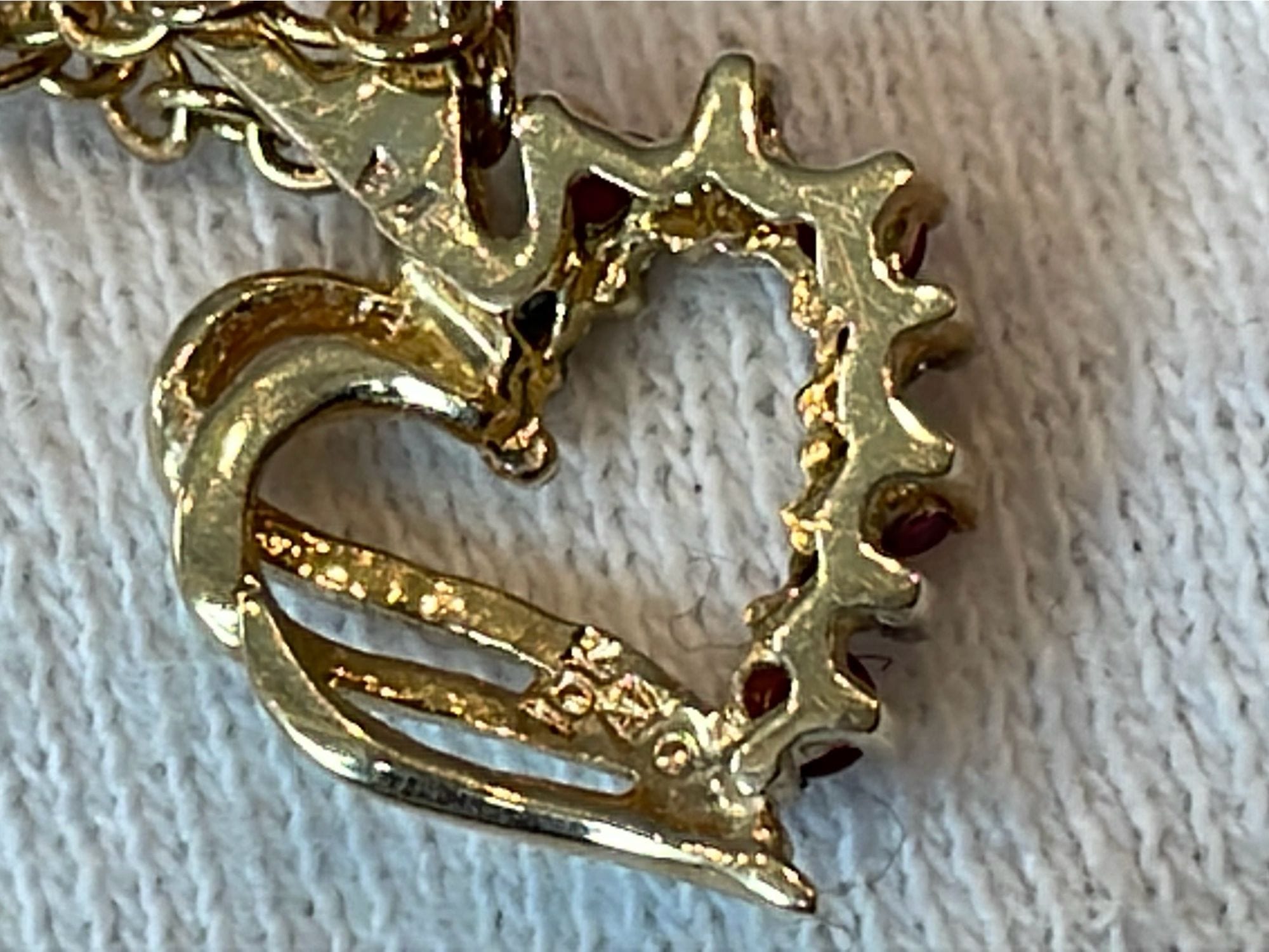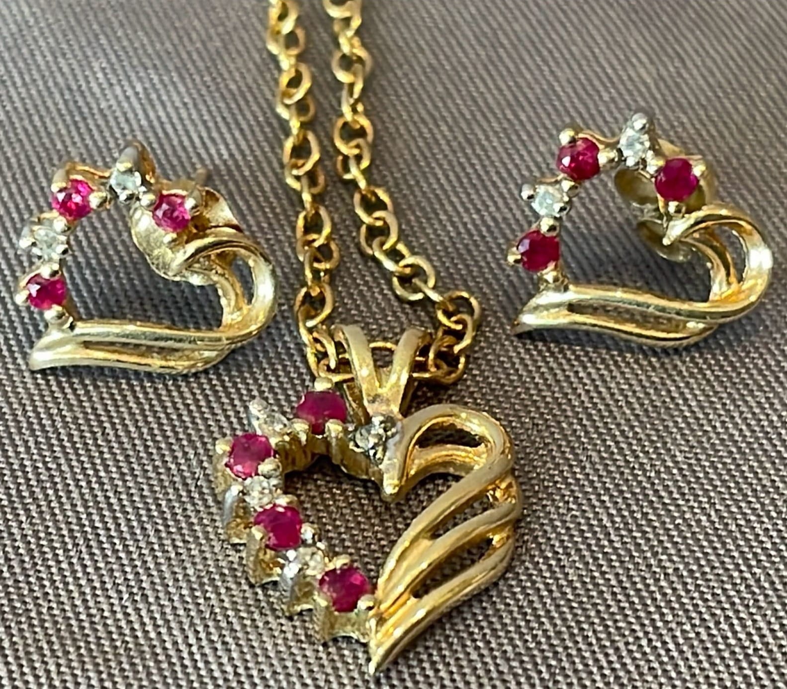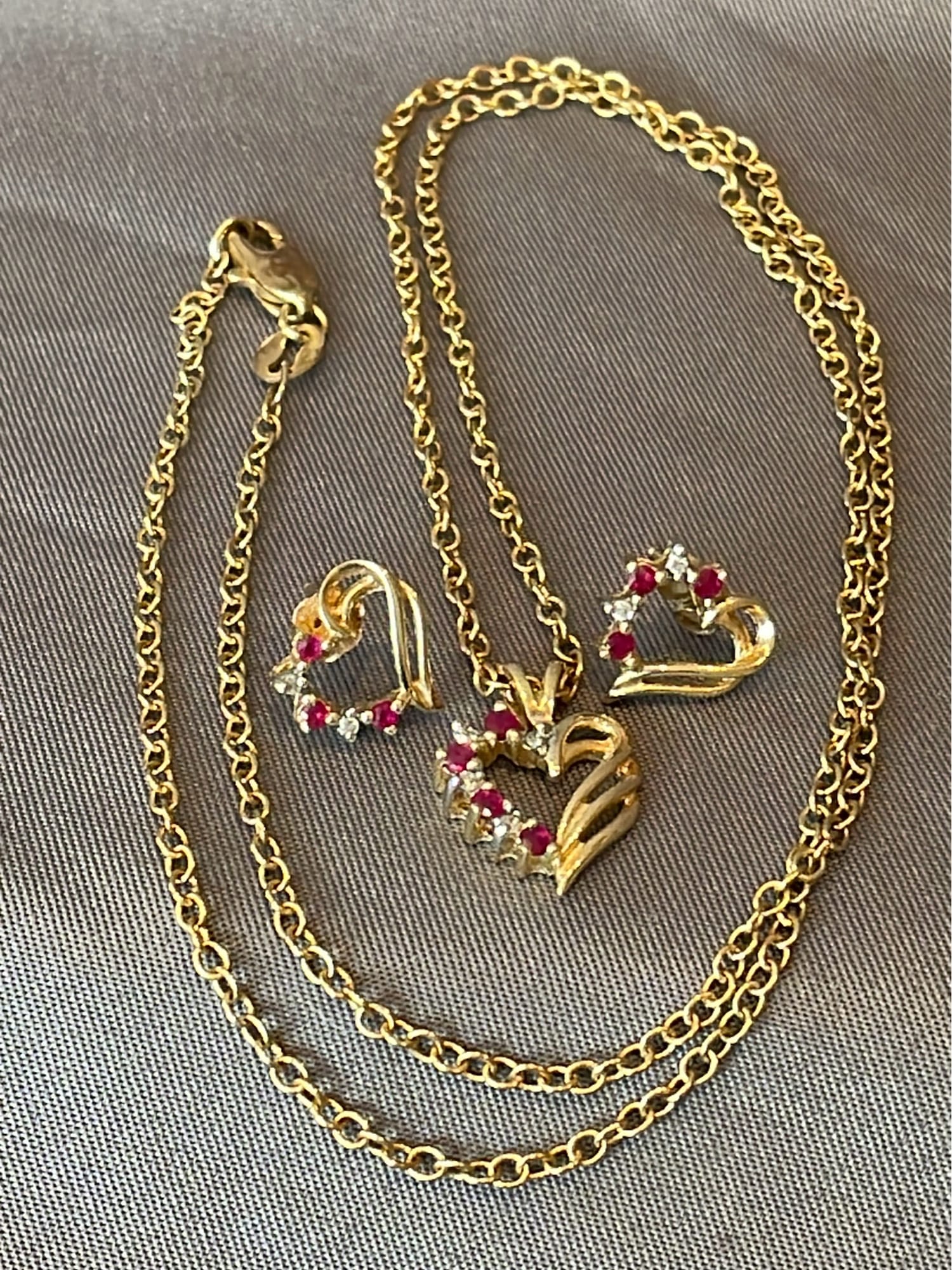 1031 10K Gold Ruby and Diamond Heart-Shaped Pendant and Earring Set with 20 Inch Necklace Marked 18K GF