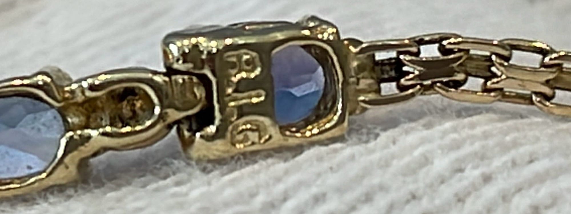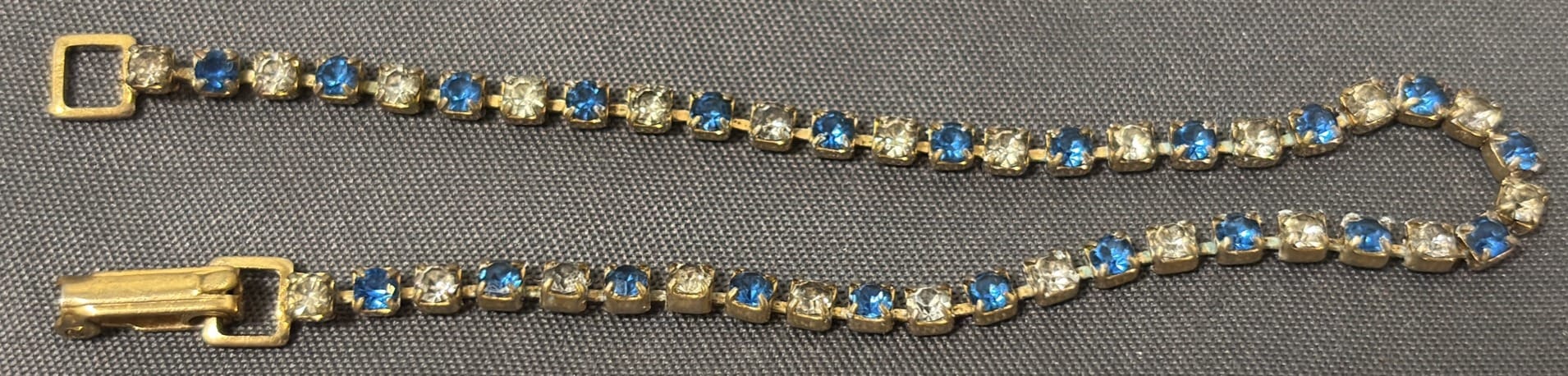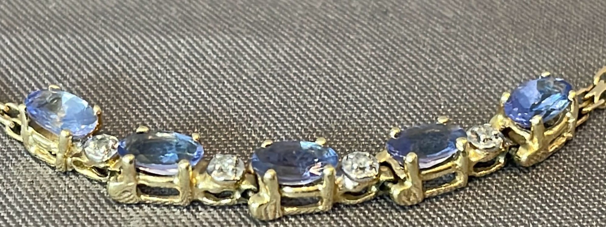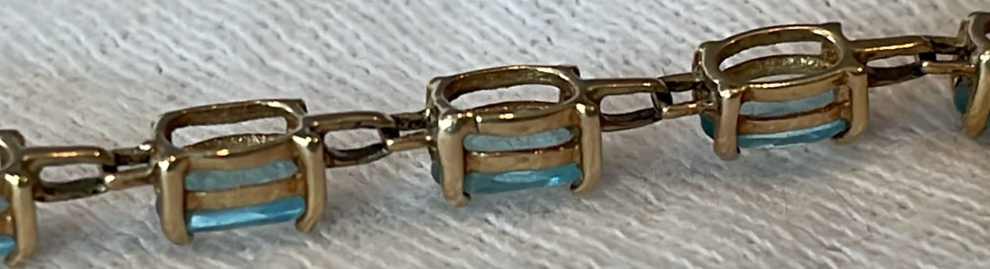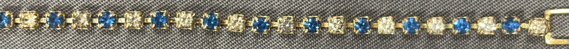 1121 Vintage 14K Gold Over Silver 7 inch Bracelet with Blue and Clear Faceted Stones