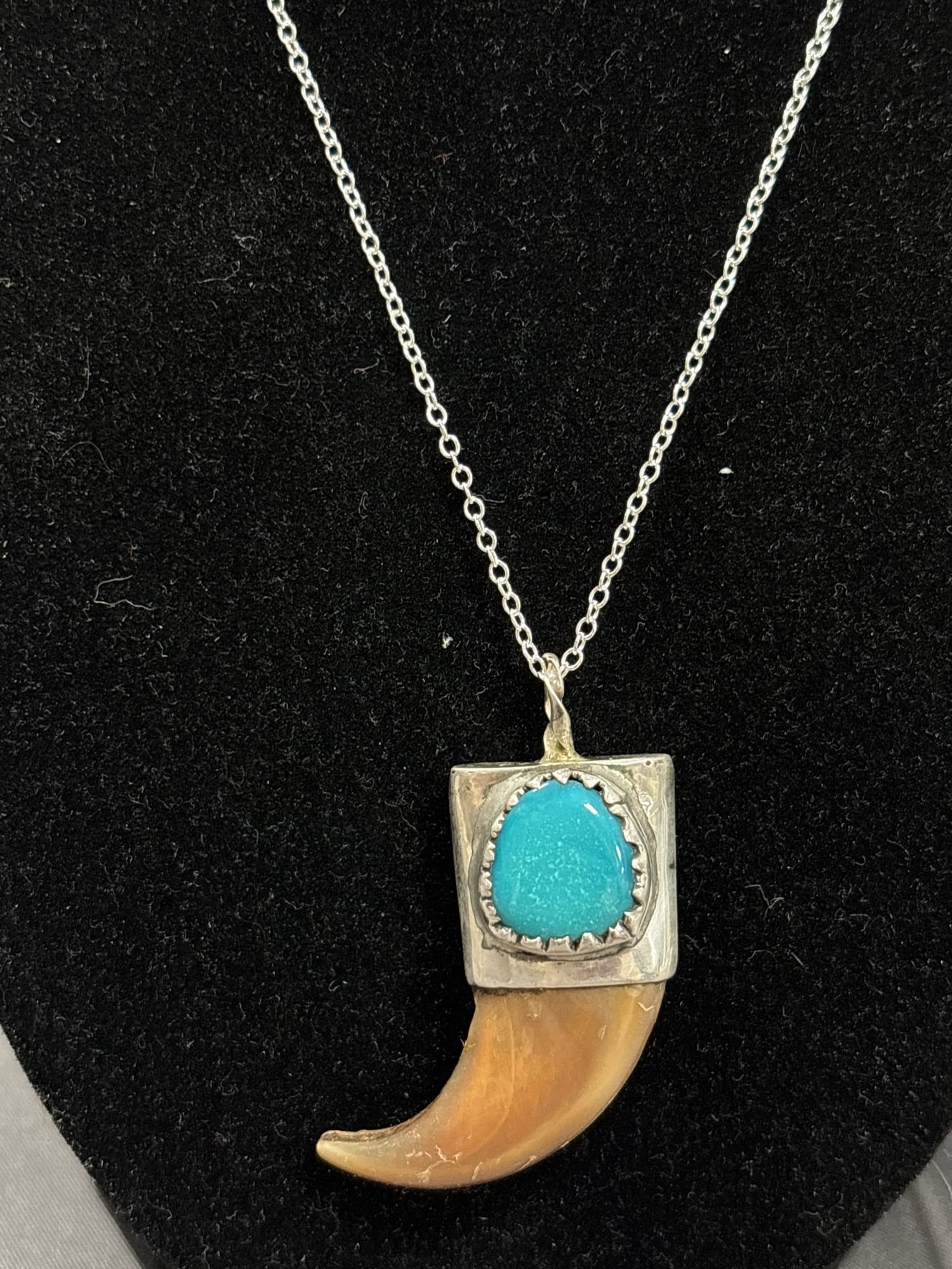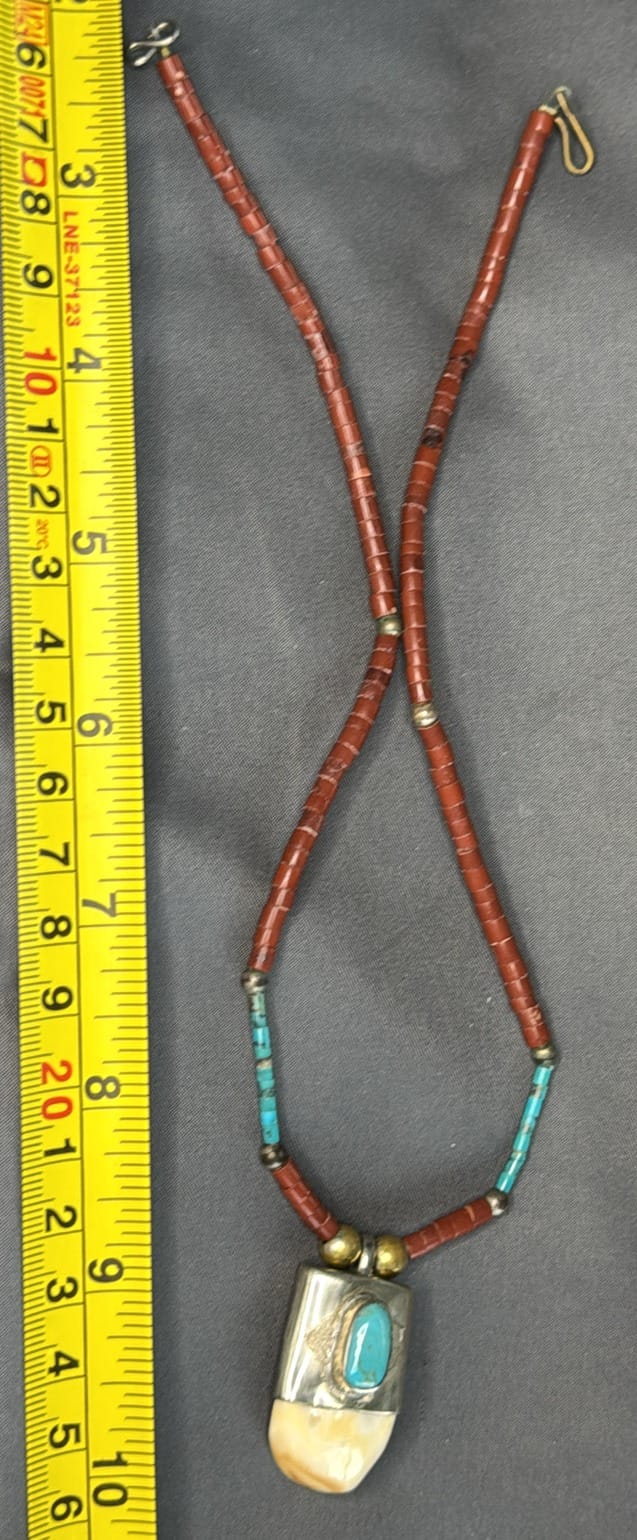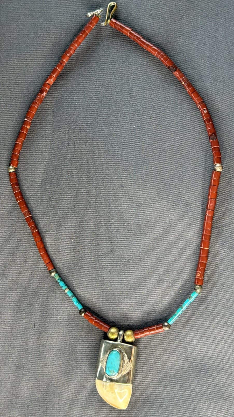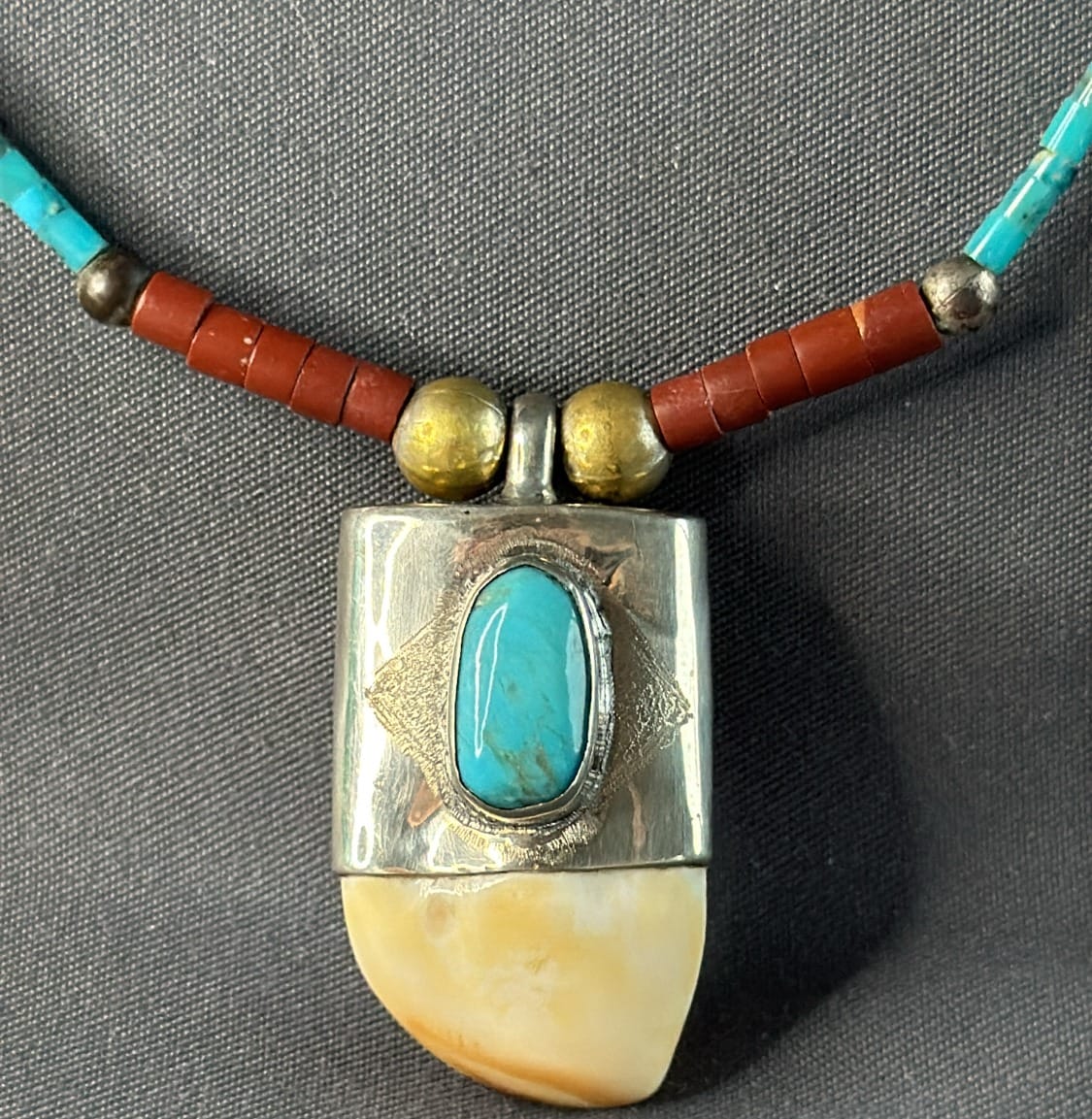 1041 Vintage Indian Sterling and Turquoise Moose Tooth Pendant on 16 inch Beaded Chain