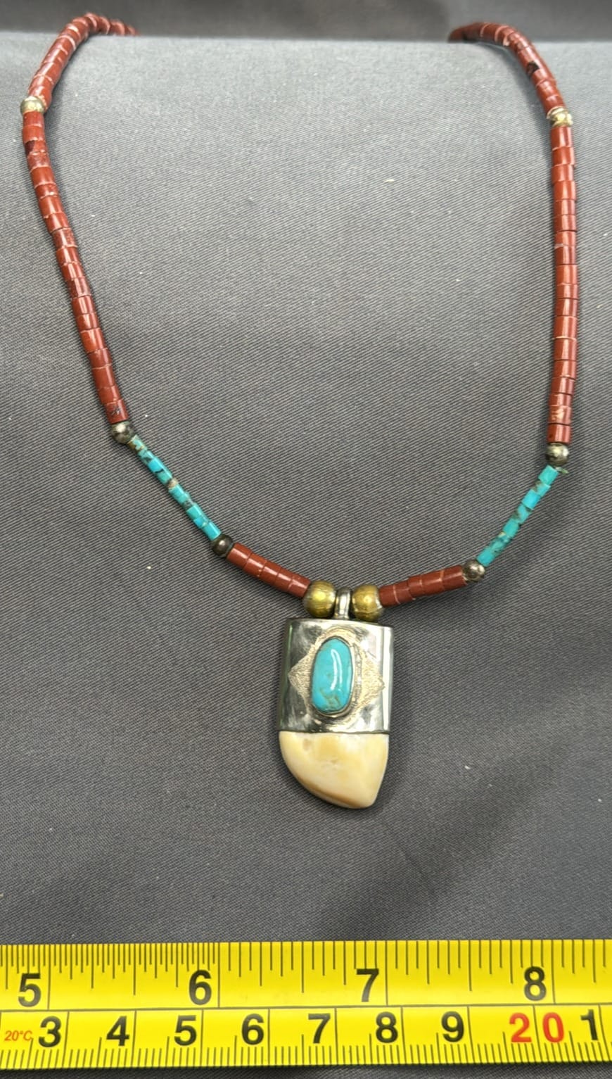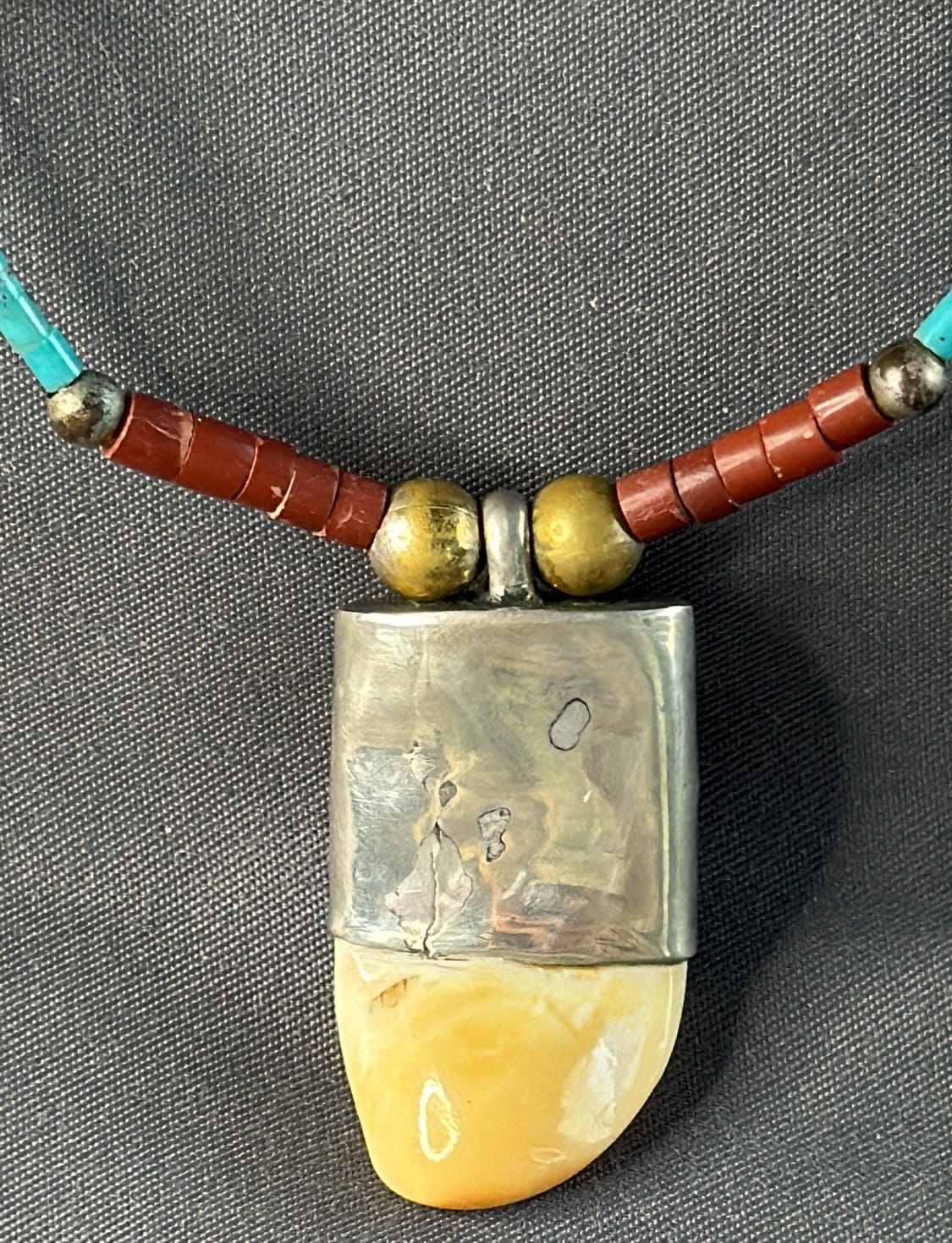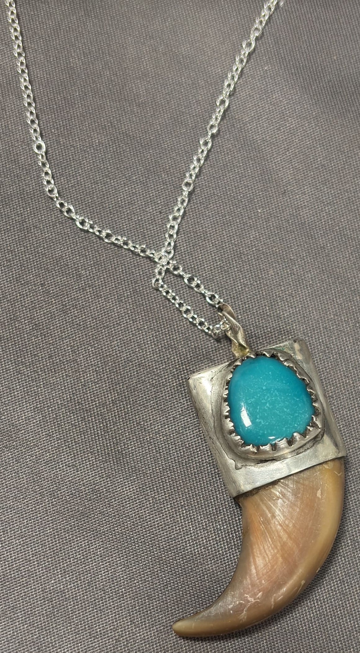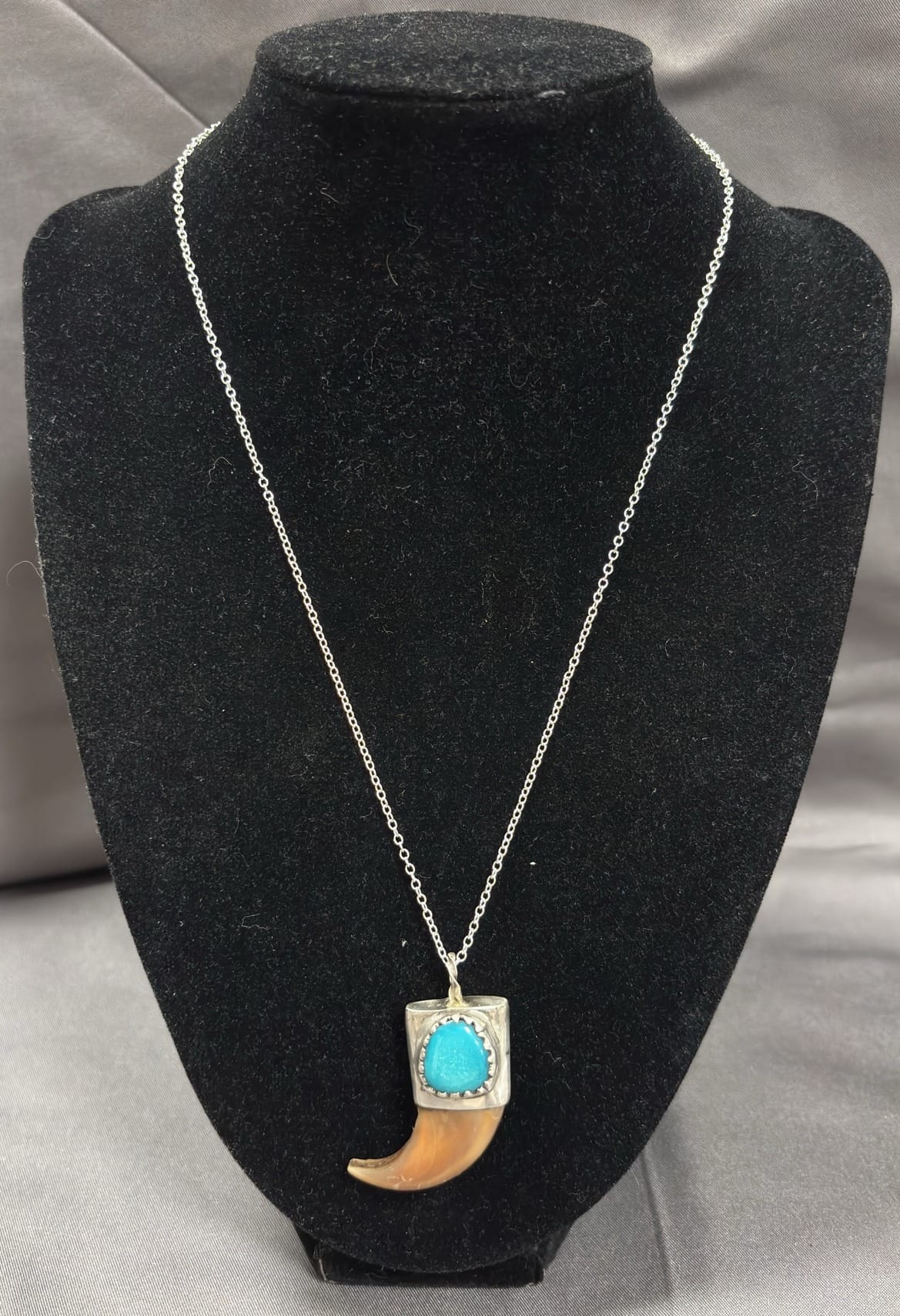1041 Vintage Indian Sterling and Turquoise Moose Tooth Pendant on 16 inch Beaded Chain