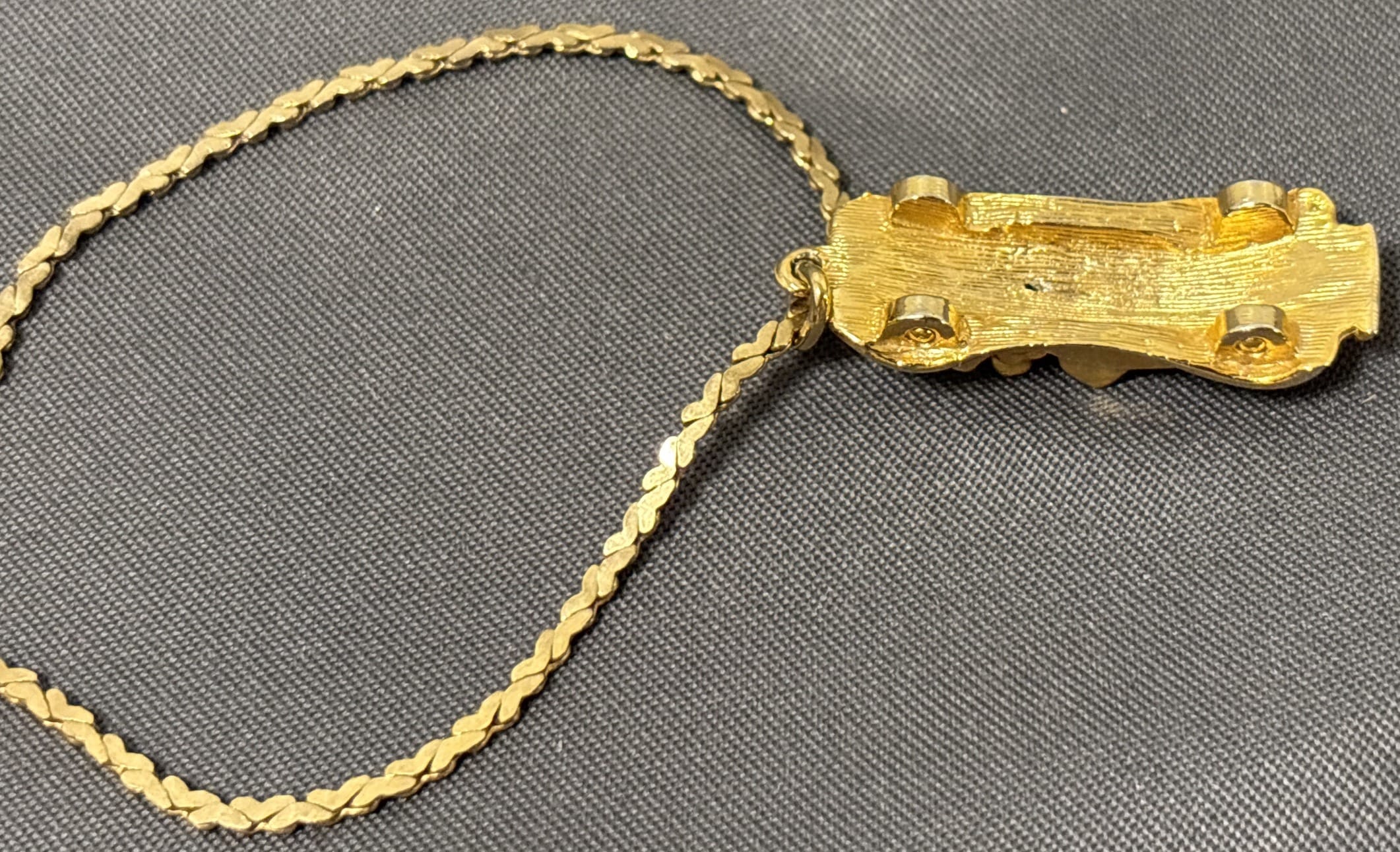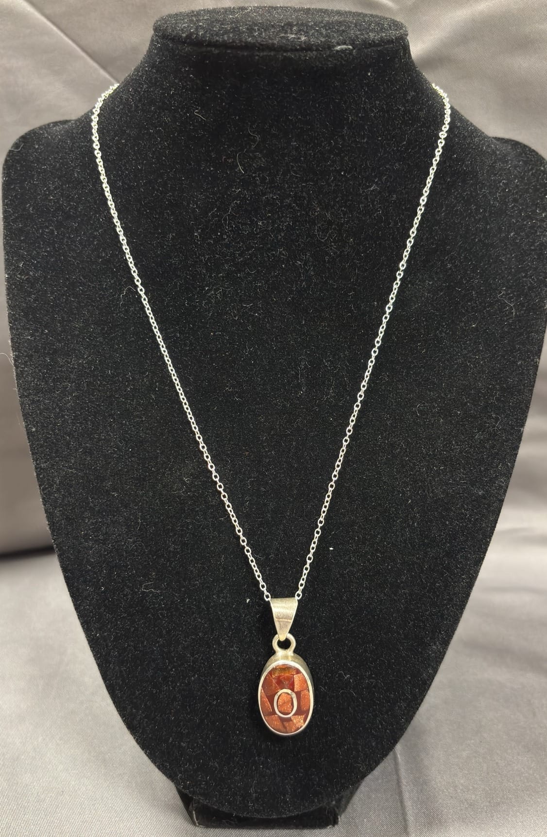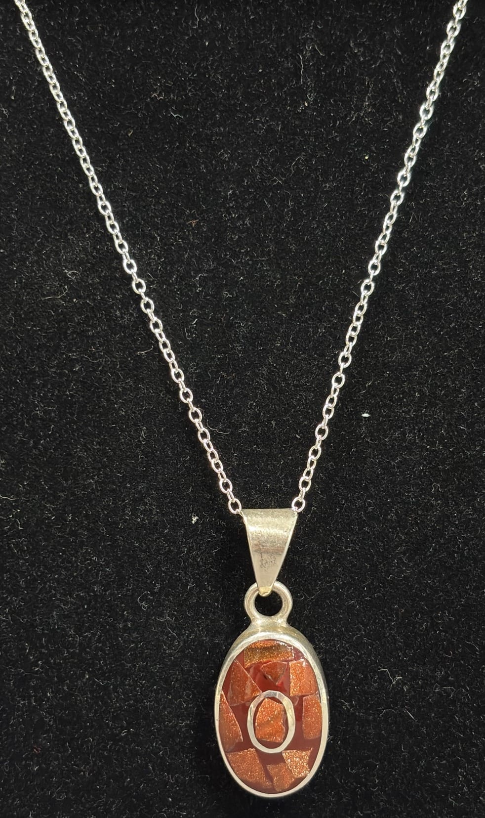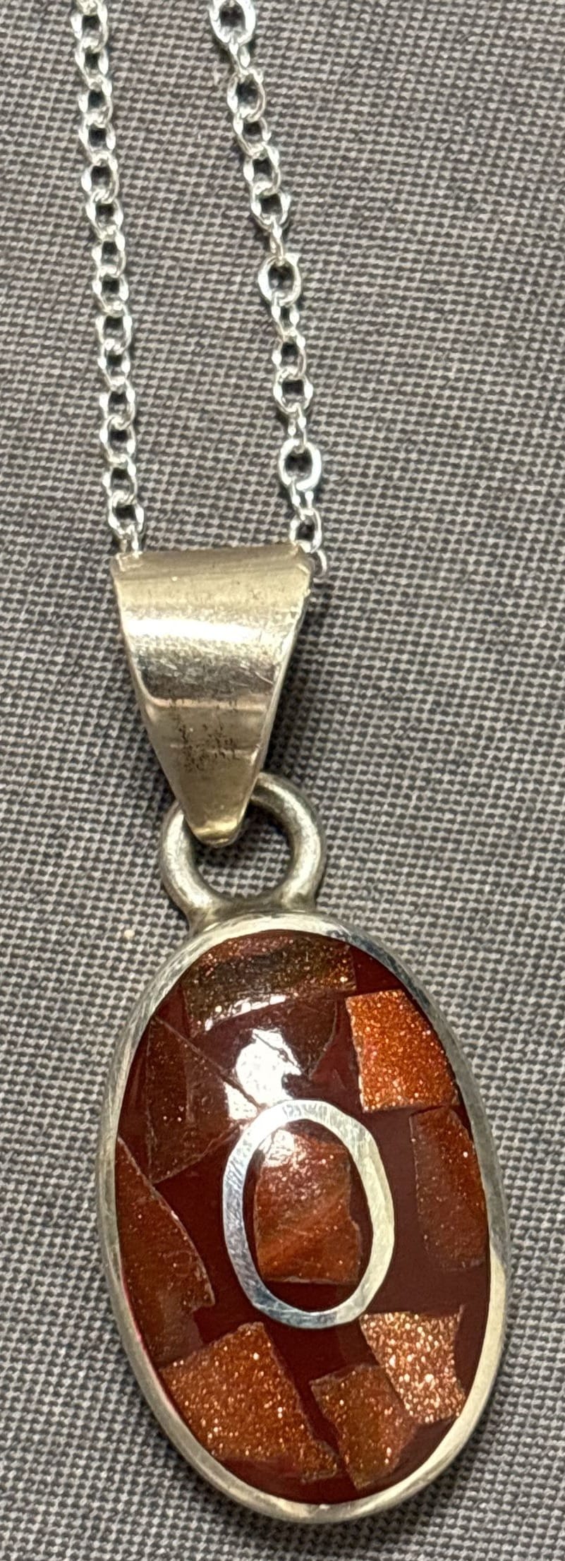 1034 Vintage Mexico Sterling Oval Red Enamel Goldstone Chip Inlay Pendant on 16 inch .925 Chain