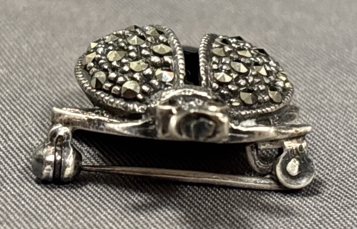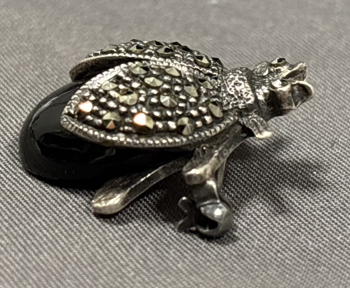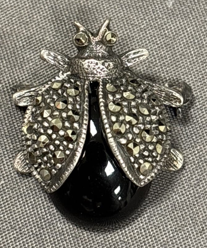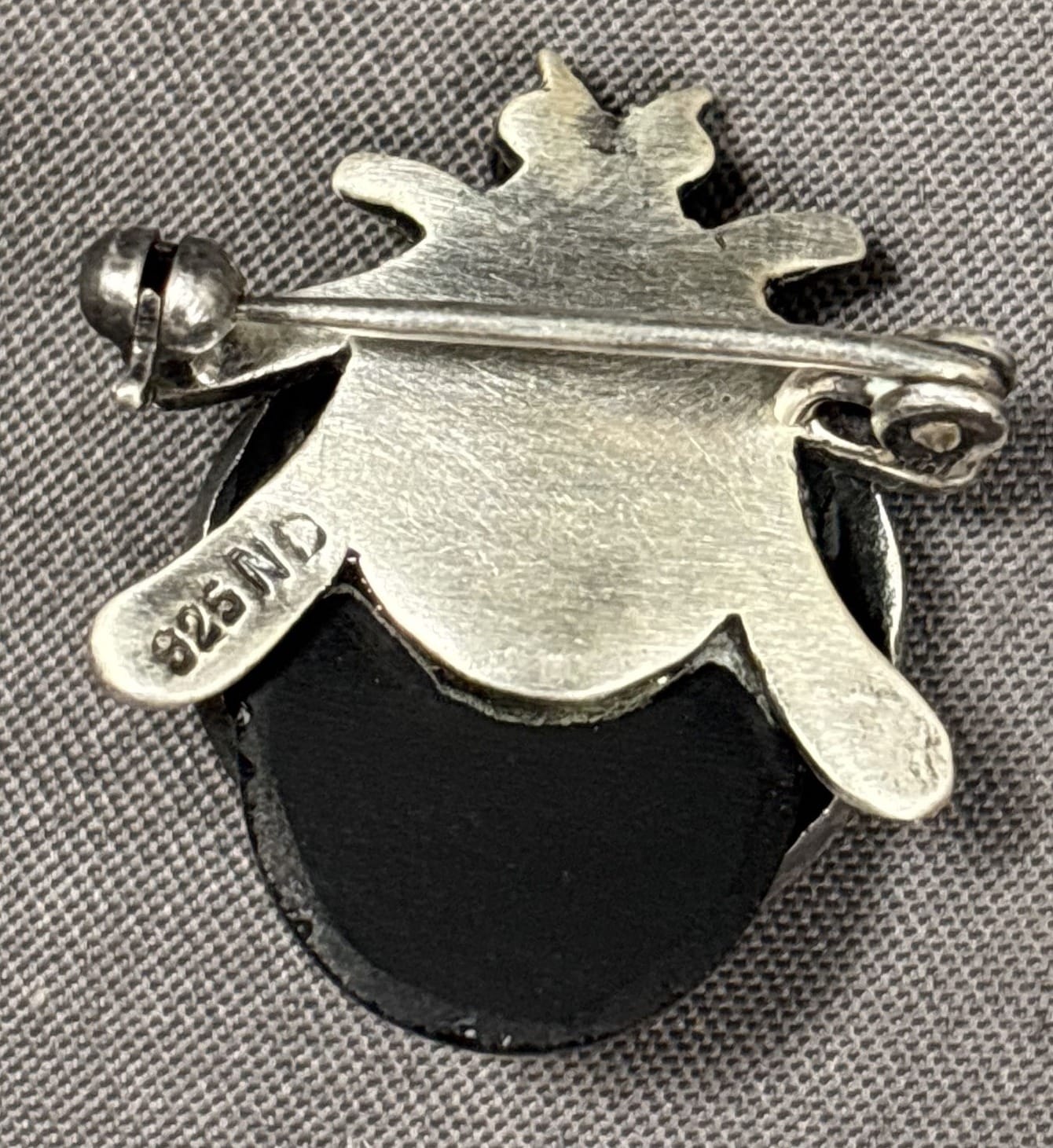 1035 Vintage .925 Silver, Black Onyx and Marcasite Lady Bug Pin- Marked ND