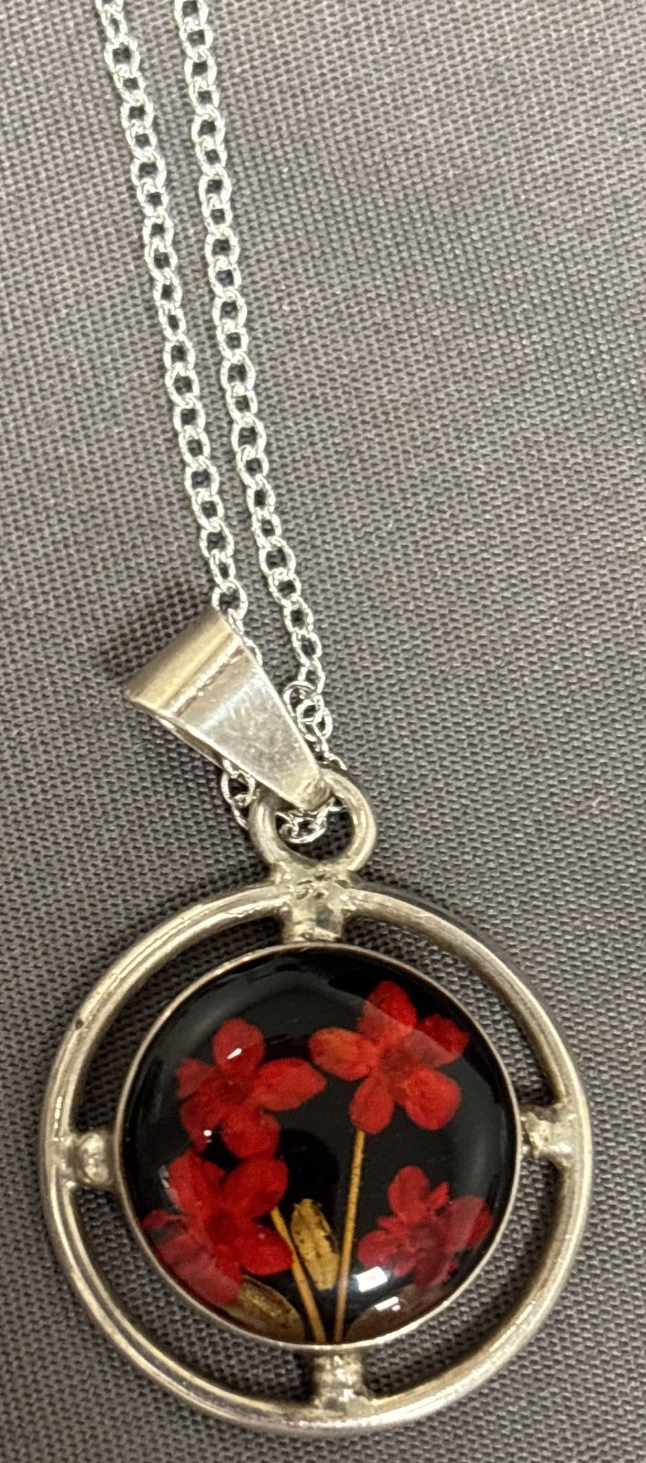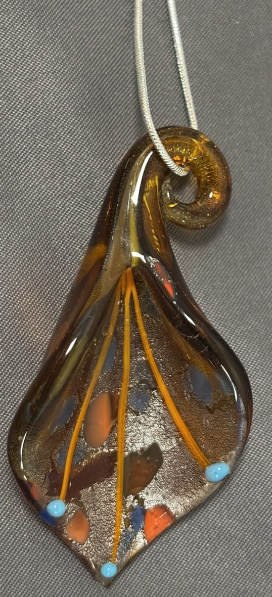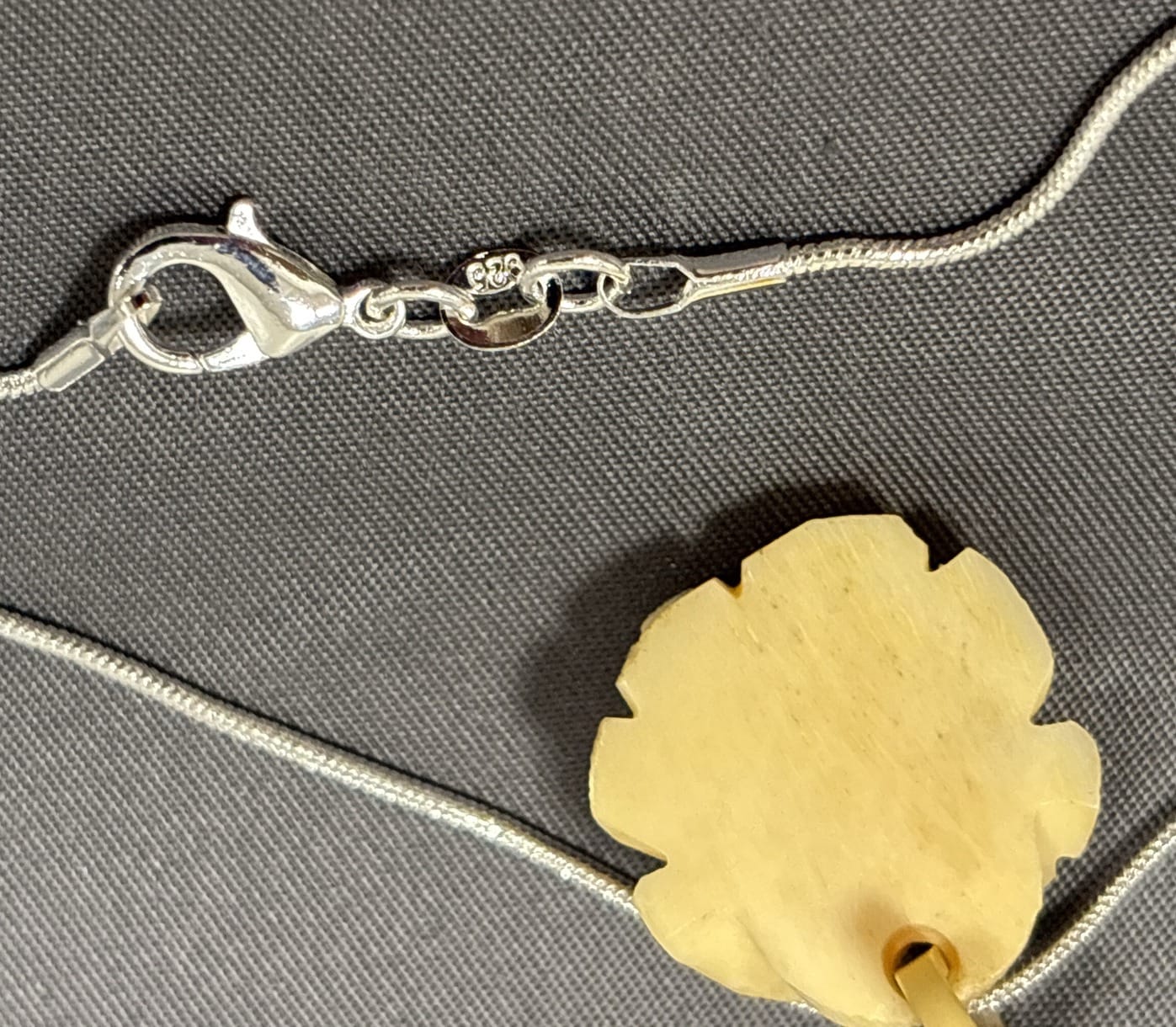 1128 1970s Hand tooled Amber Glass Flower Pendant on 16 inch .925 Silver Chain