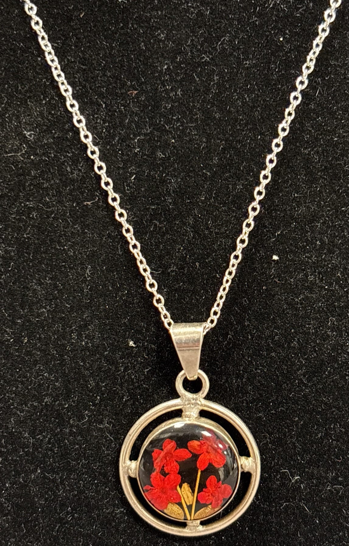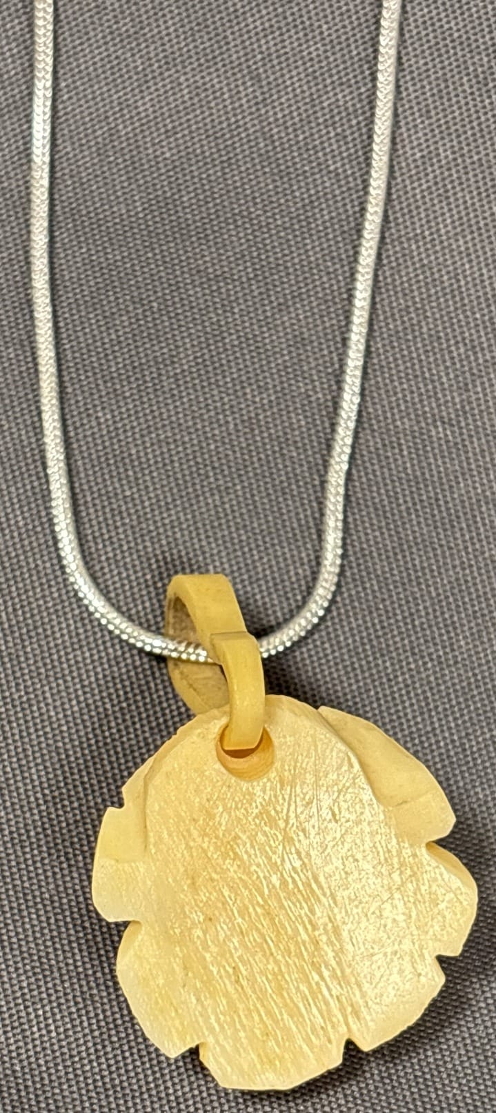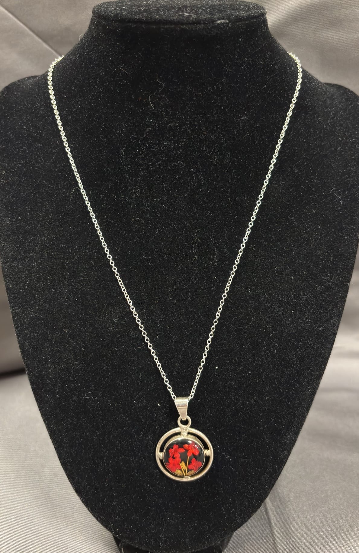 1128 1970s Hand tooled Amber Glass Flower Pendant on 16 inch .925 Silver Chain