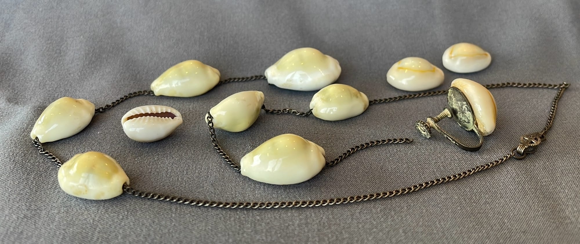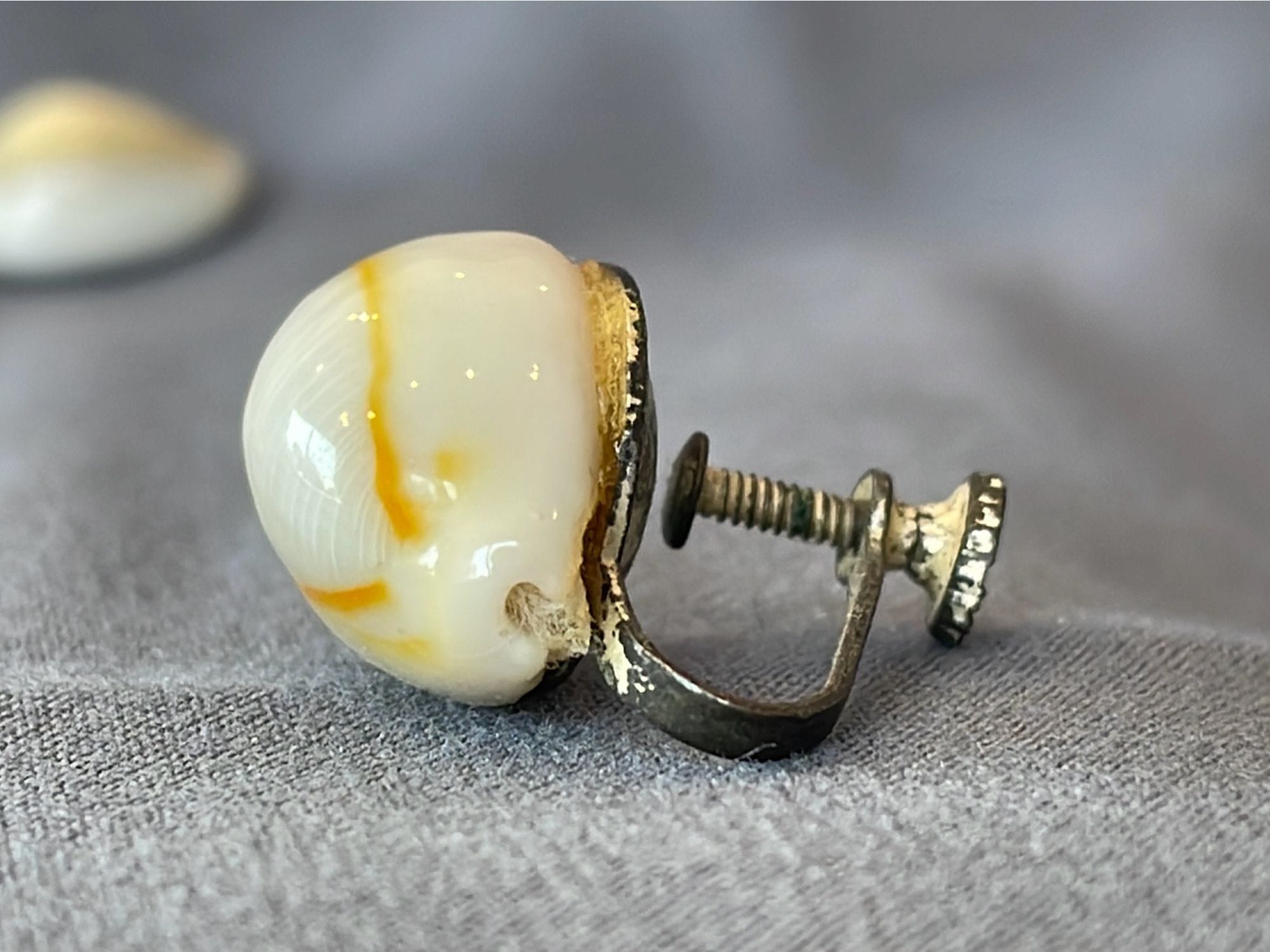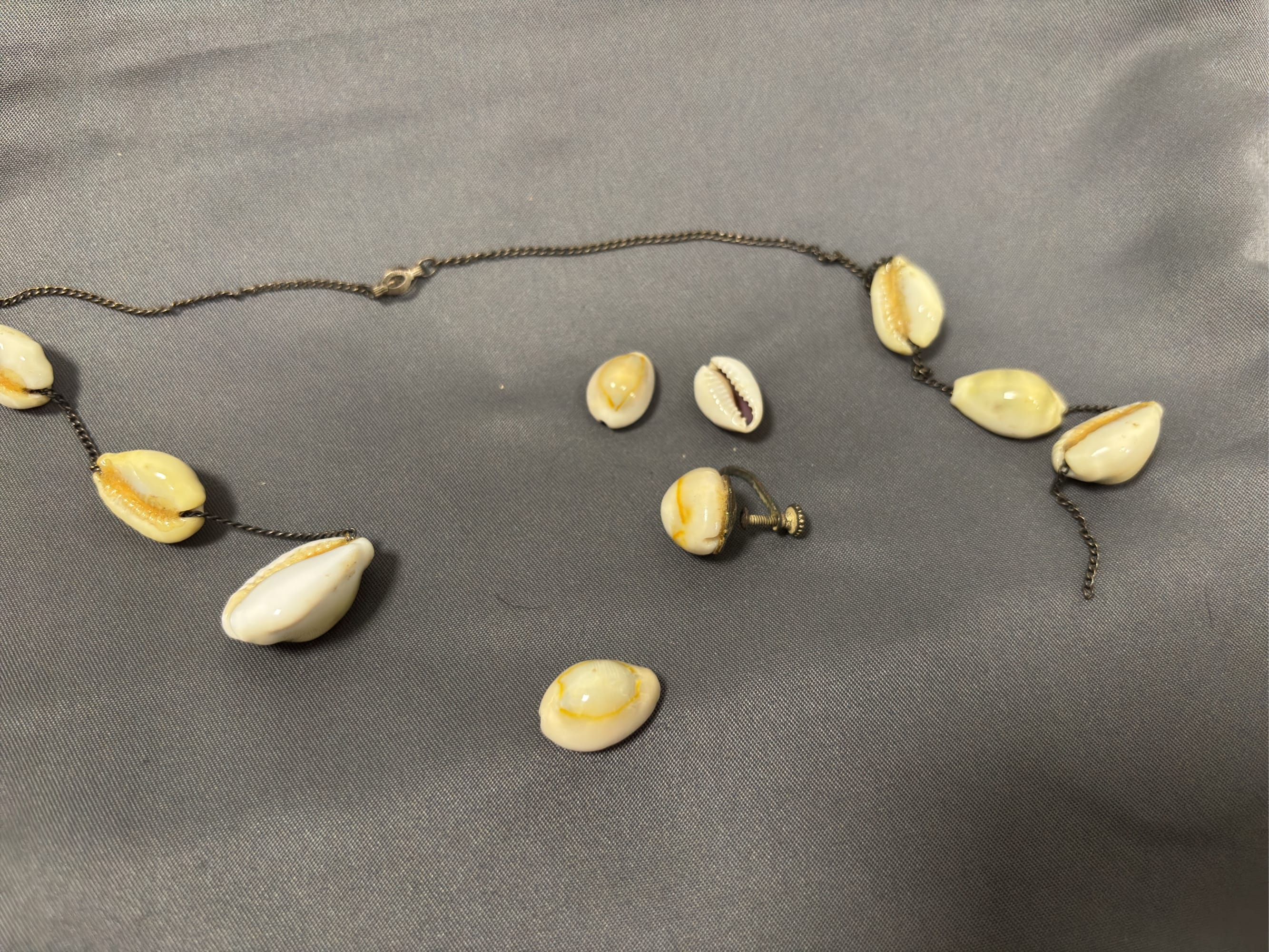 1113 Mixed Shells from World War II Beach from Okinawa, Japan - Broken Necklace with Sterling Silver Clasp (approx 17 3/4”) and 1 Screw-Back Earring