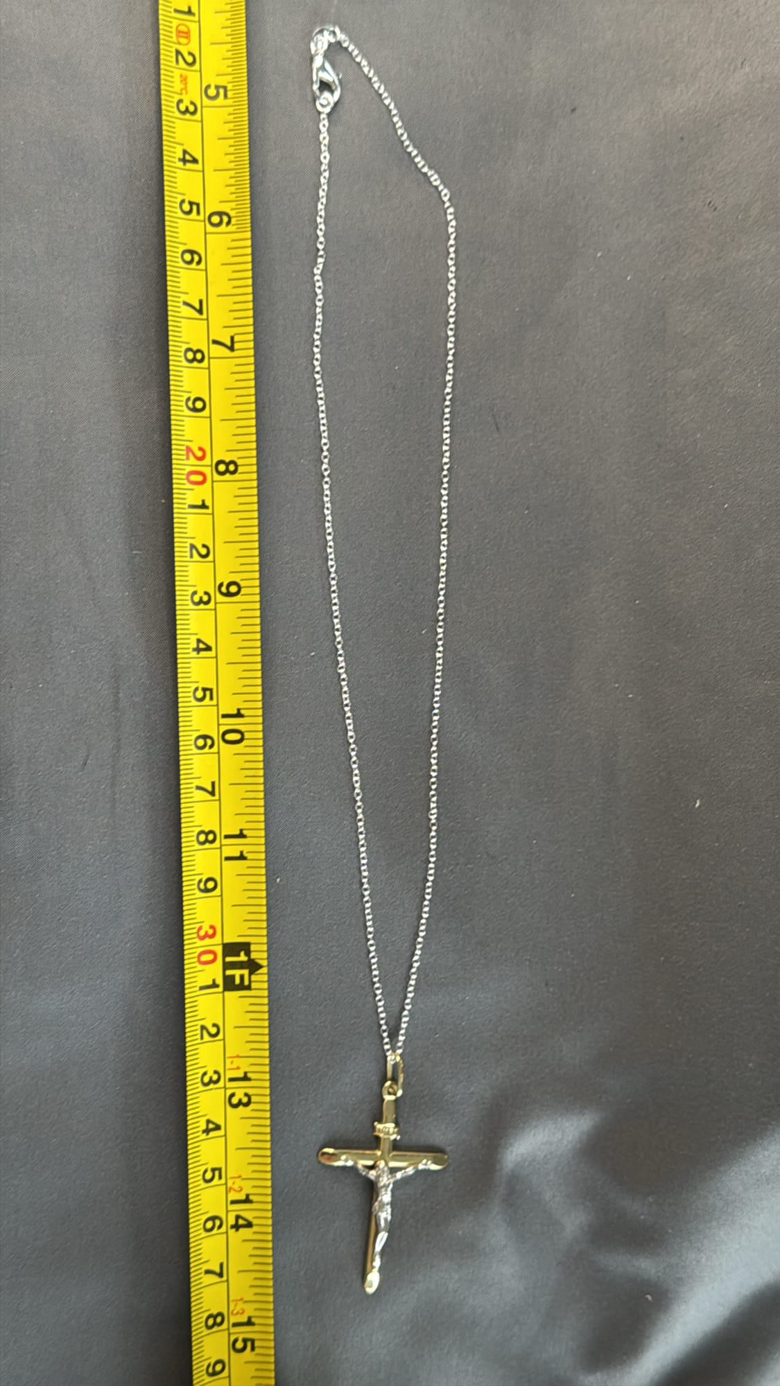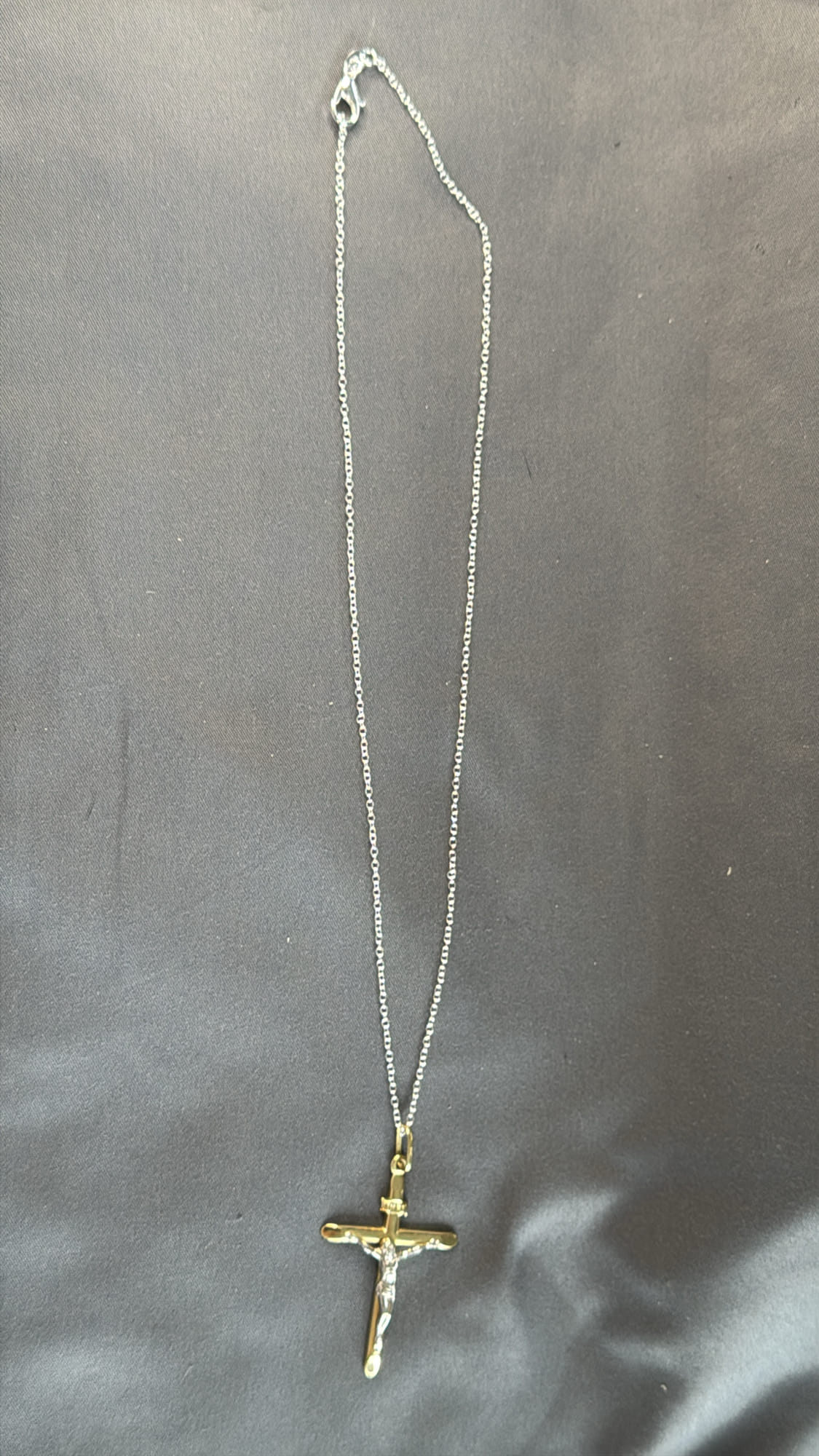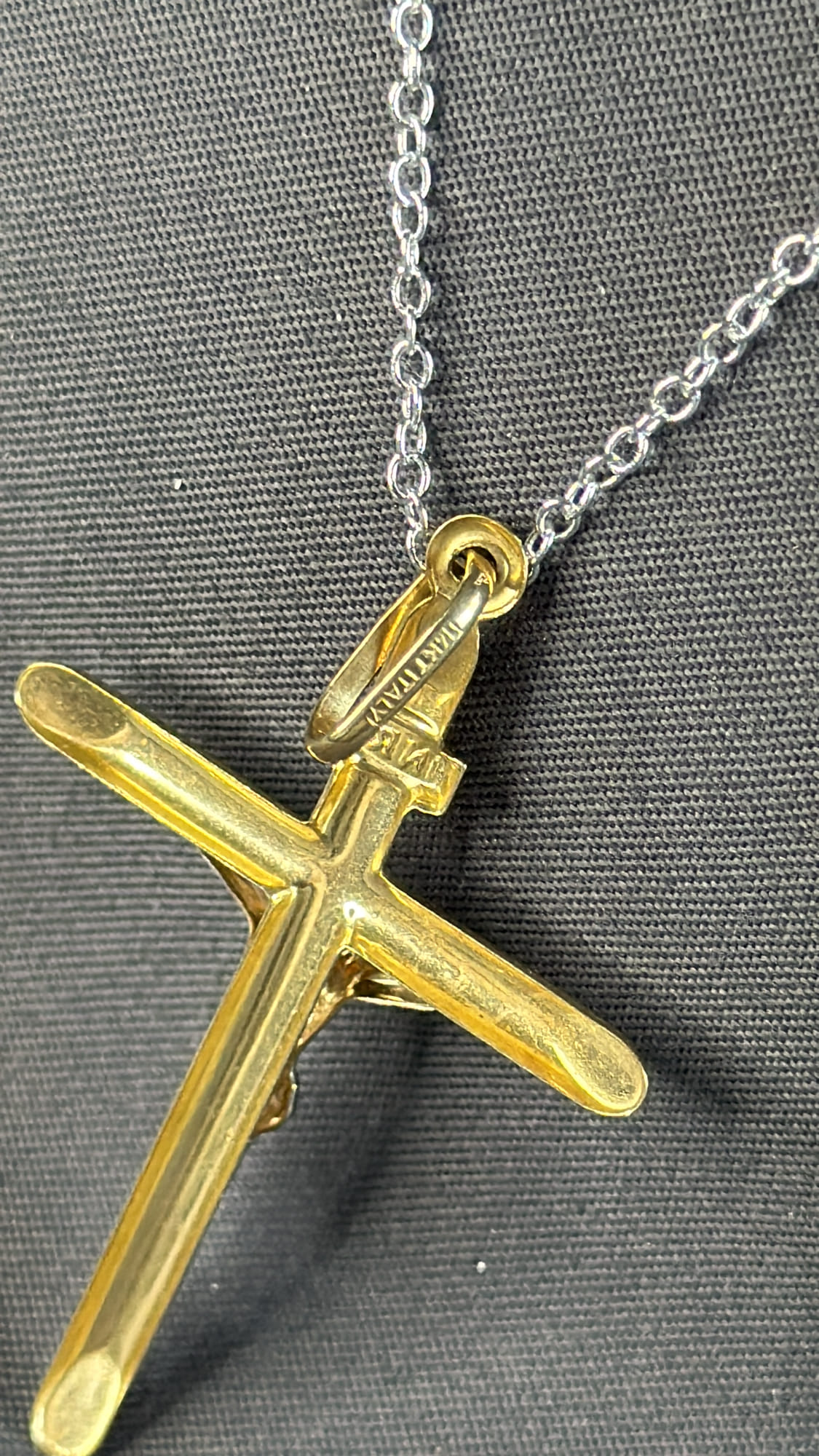 1042 14 Karat Gold 2 Inch (including hanger) Crucifix Pendant on 16 inch .925 Silver Chain