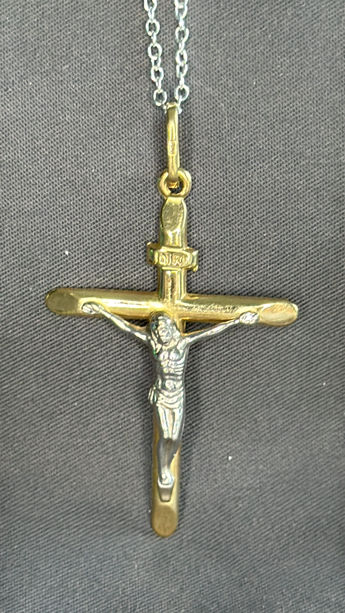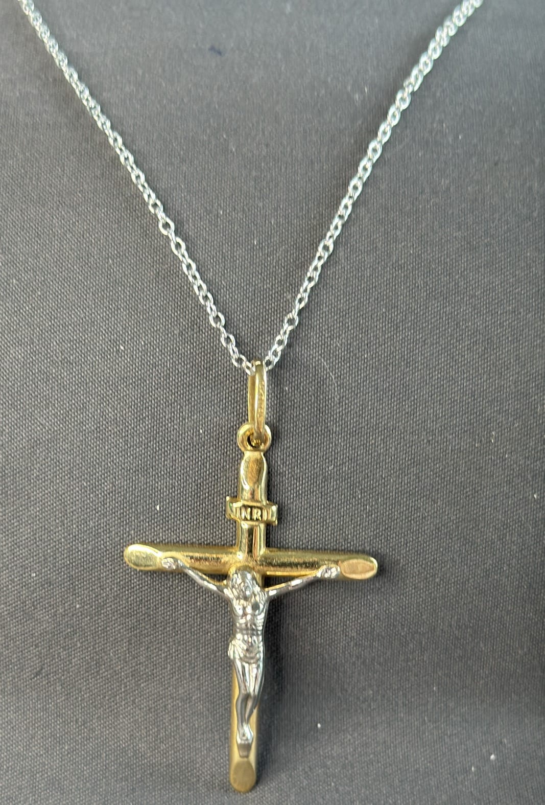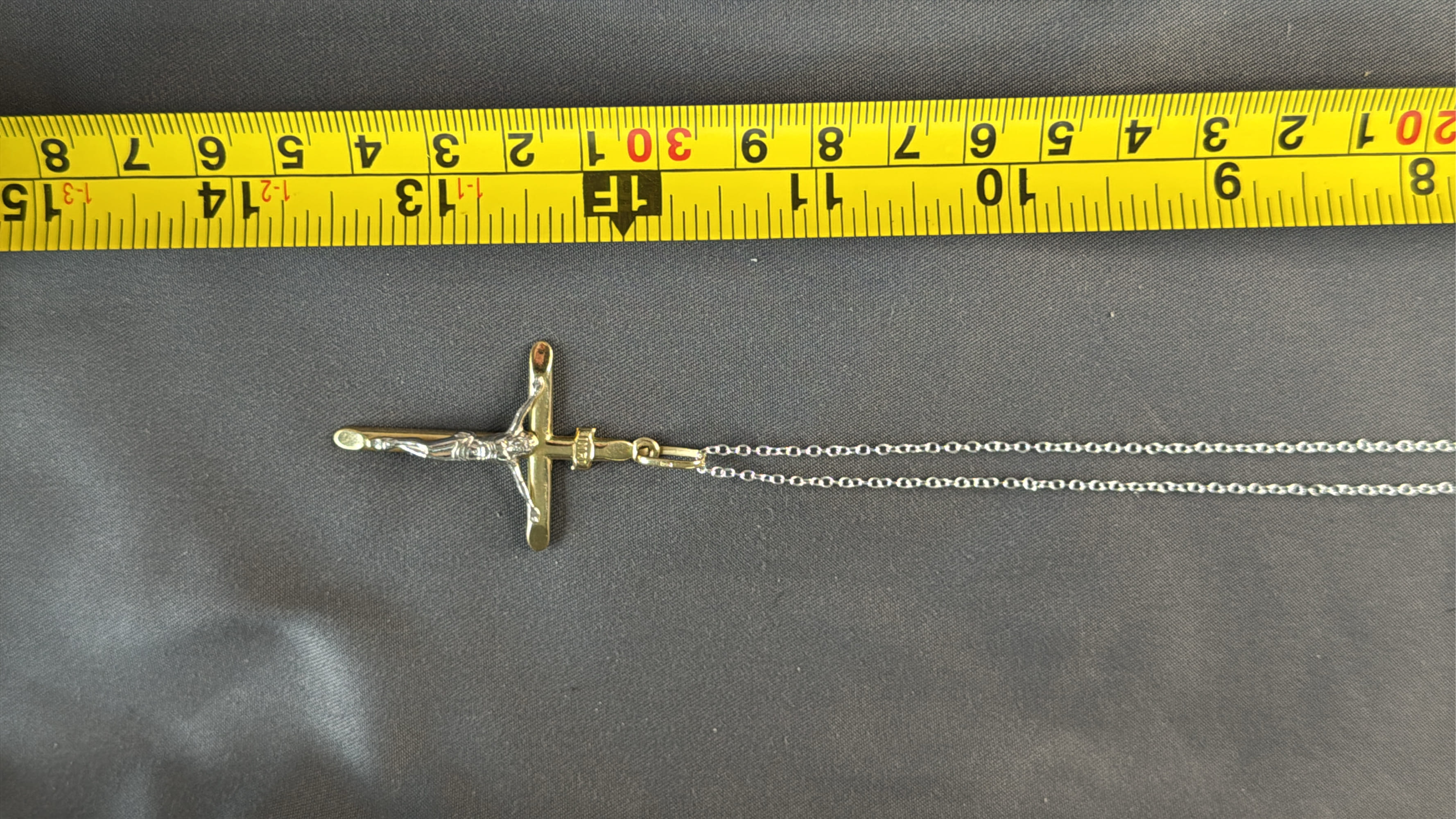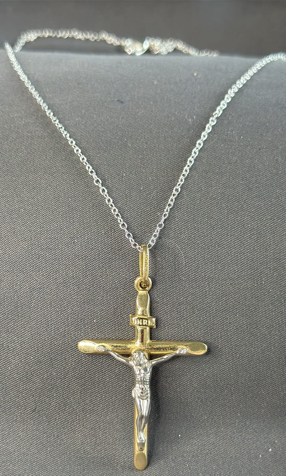 1042 14 Karat Gold 2 Inch (including hanger) Crucifix Pendant on 16 inch .925 Silver Chain