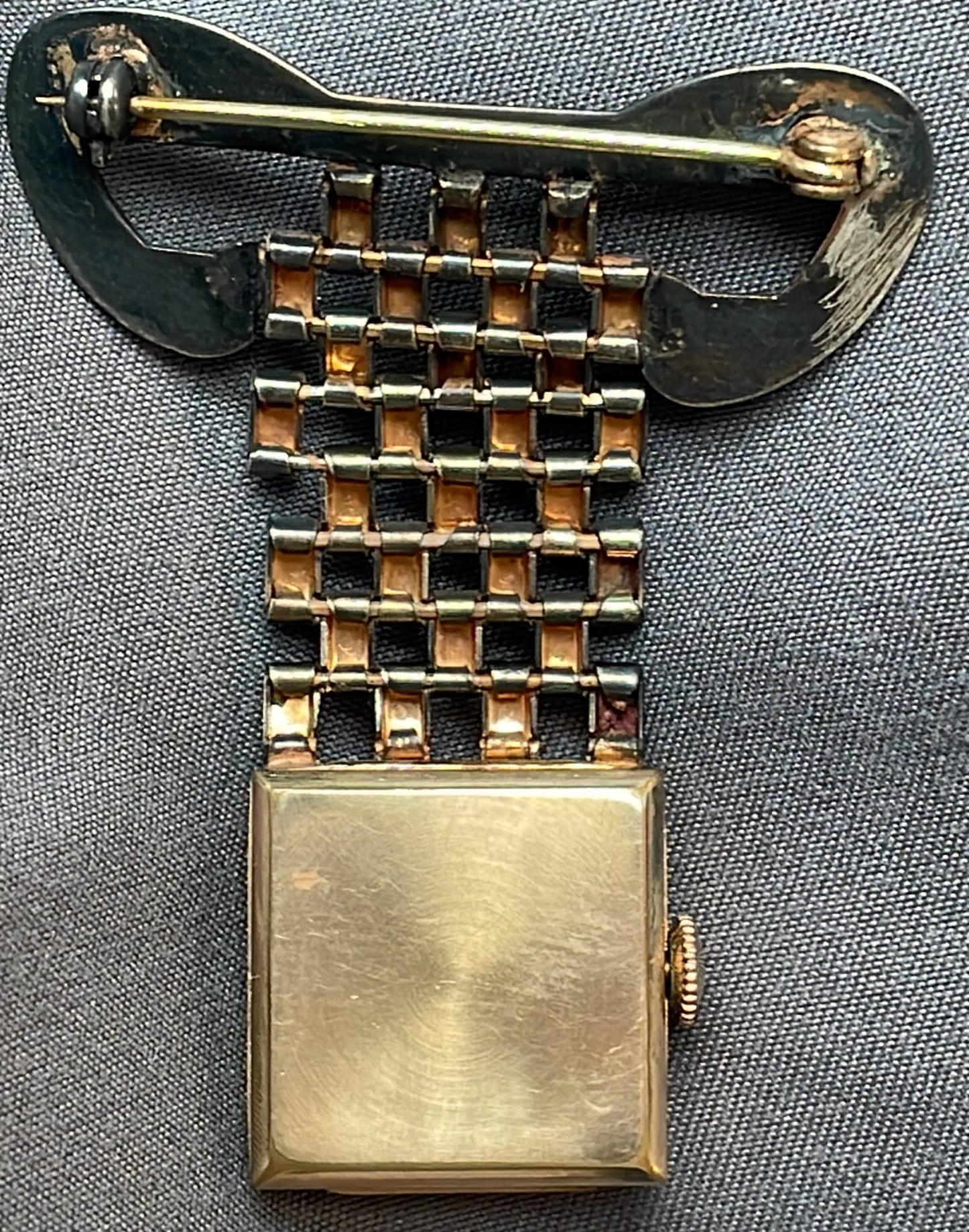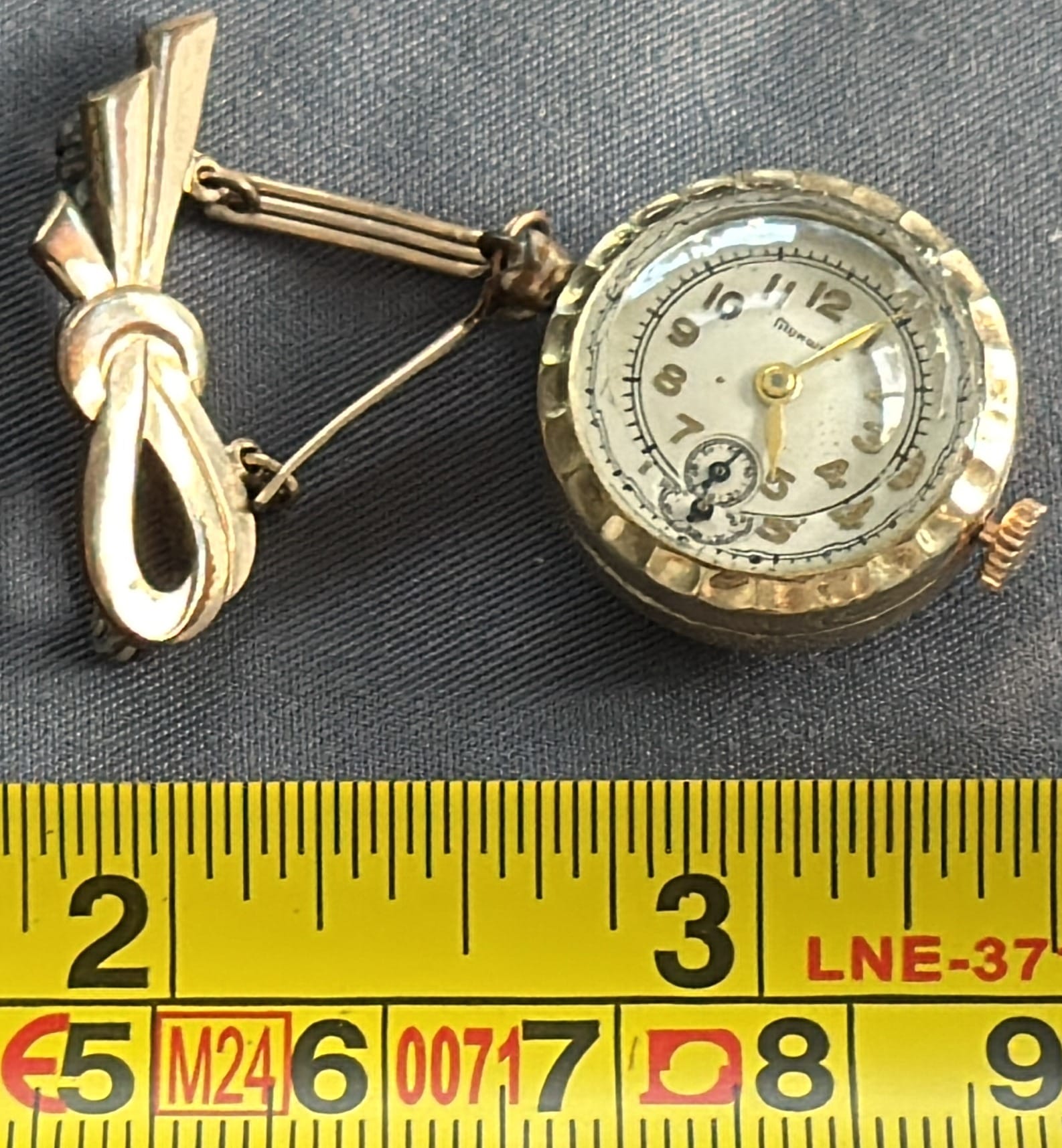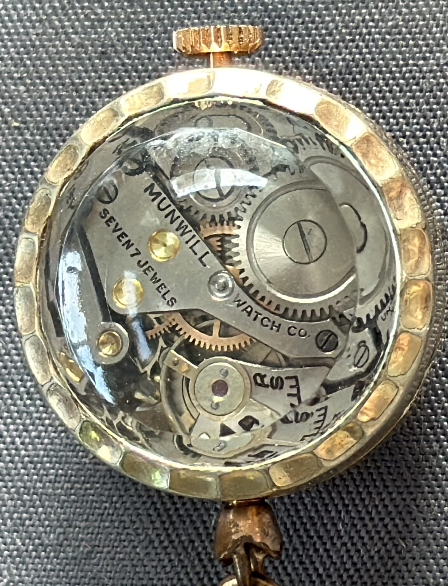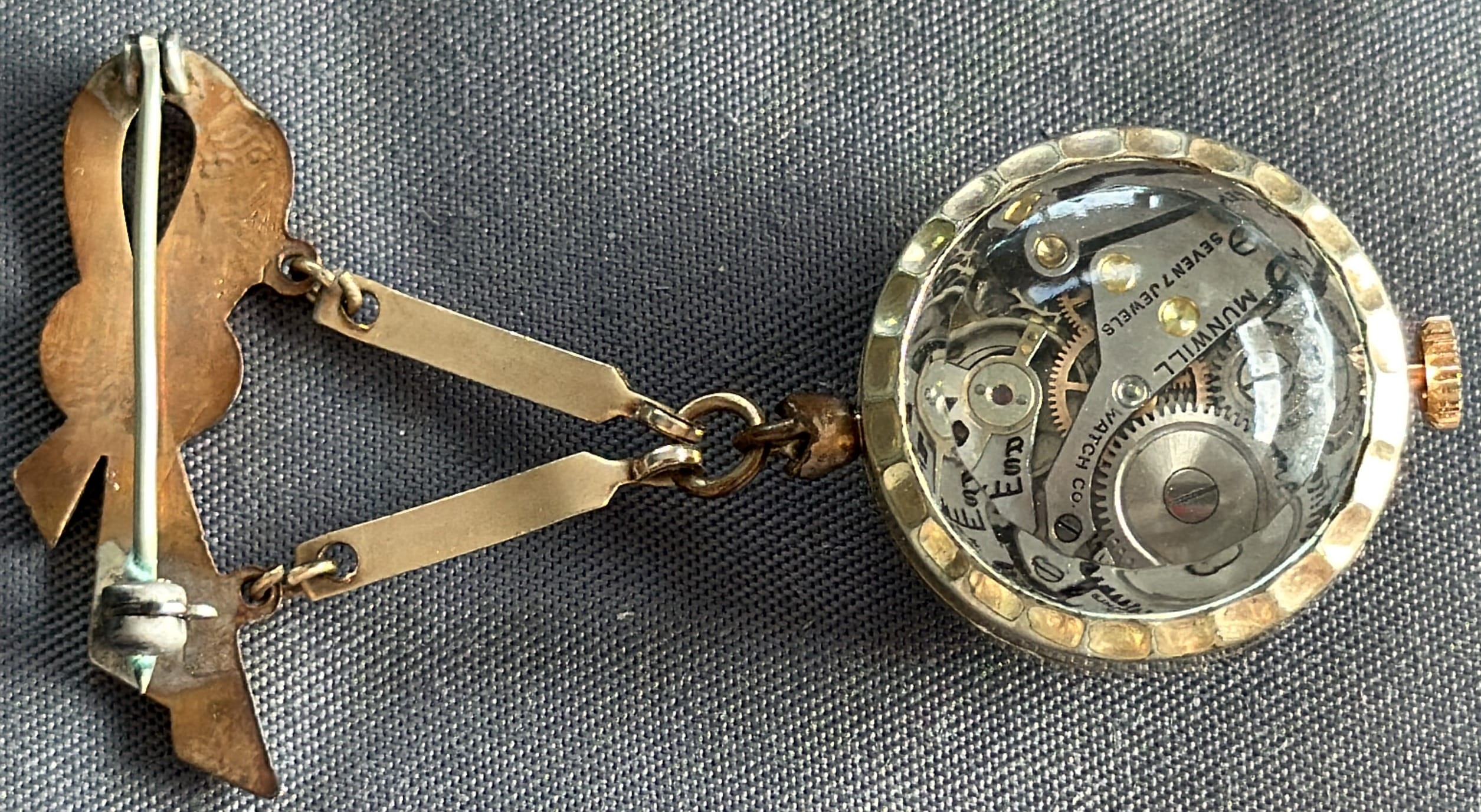 1064 1940s Munwill Watch Co. 7 Jewel Gold Tone Skeleton Watch Pin- Runs