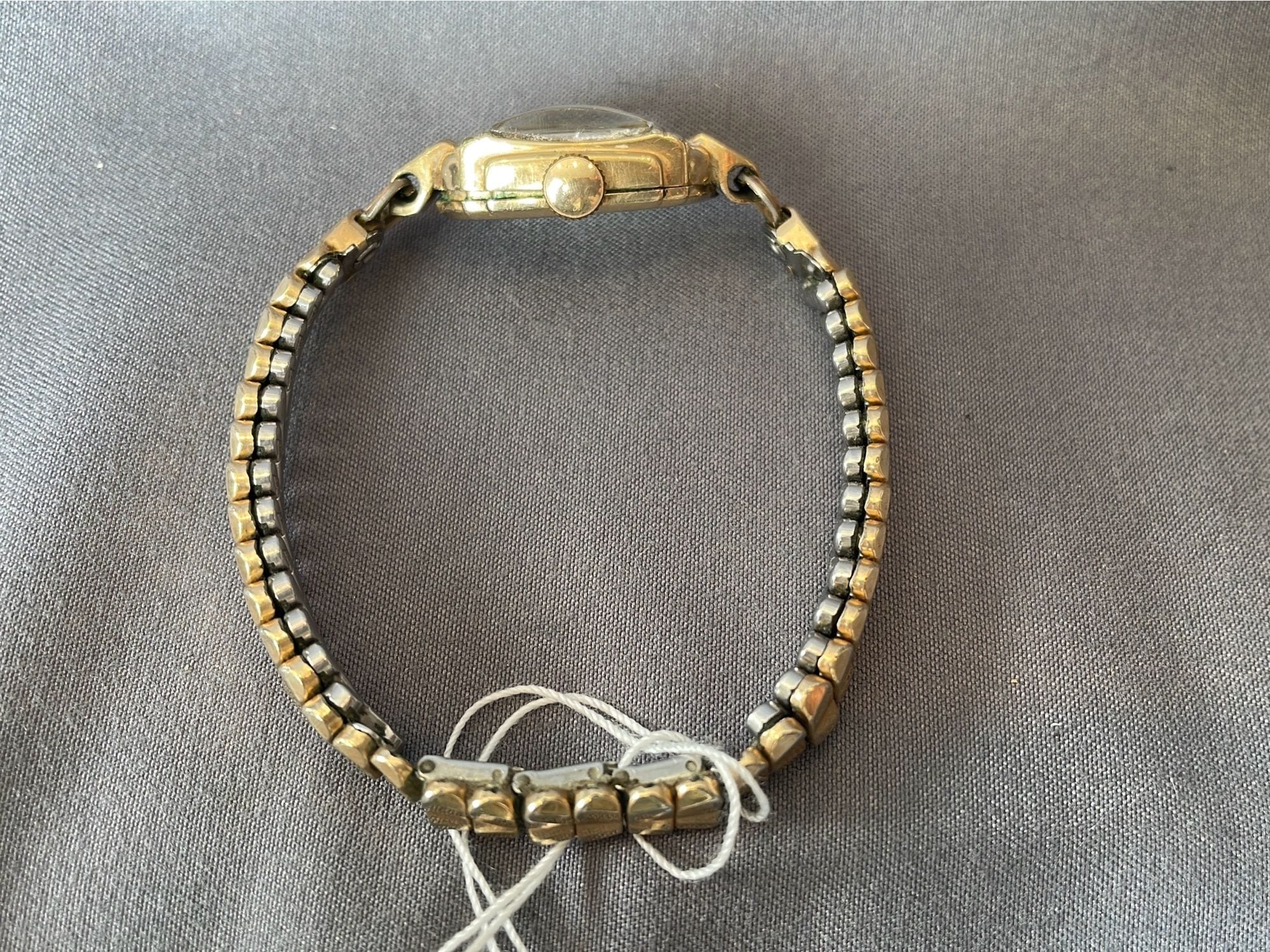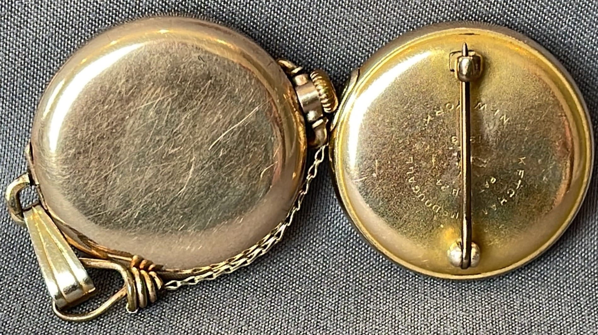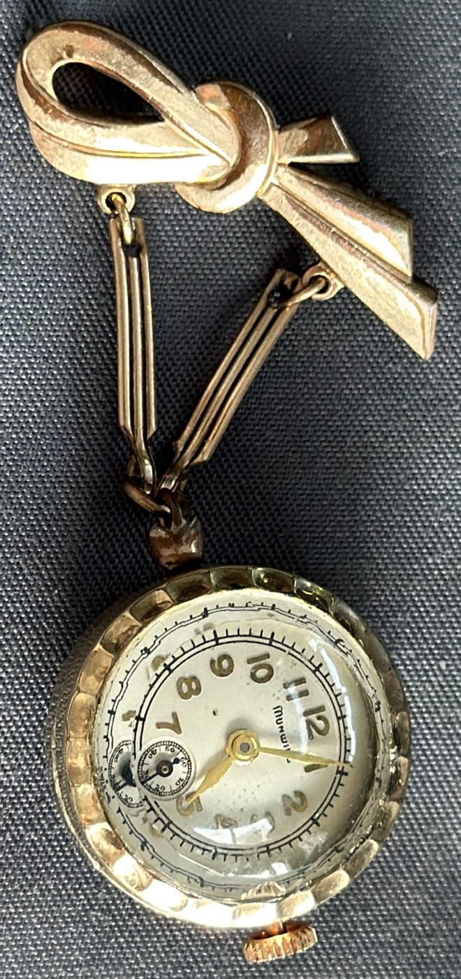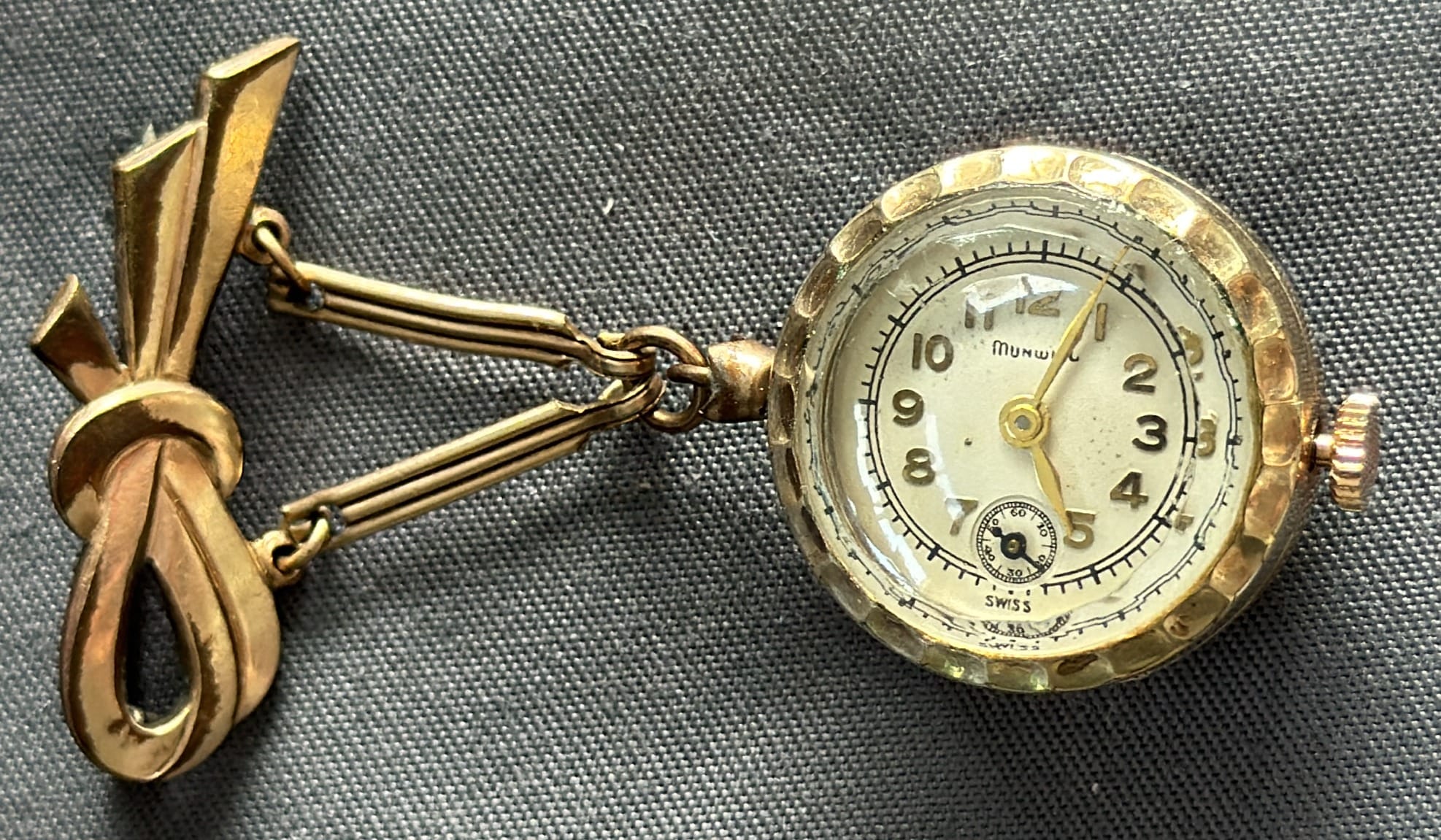 1064 1940s Munwill Watch Co. 7 Jewel Gold Tone Skeleton Watch Pin- Runs