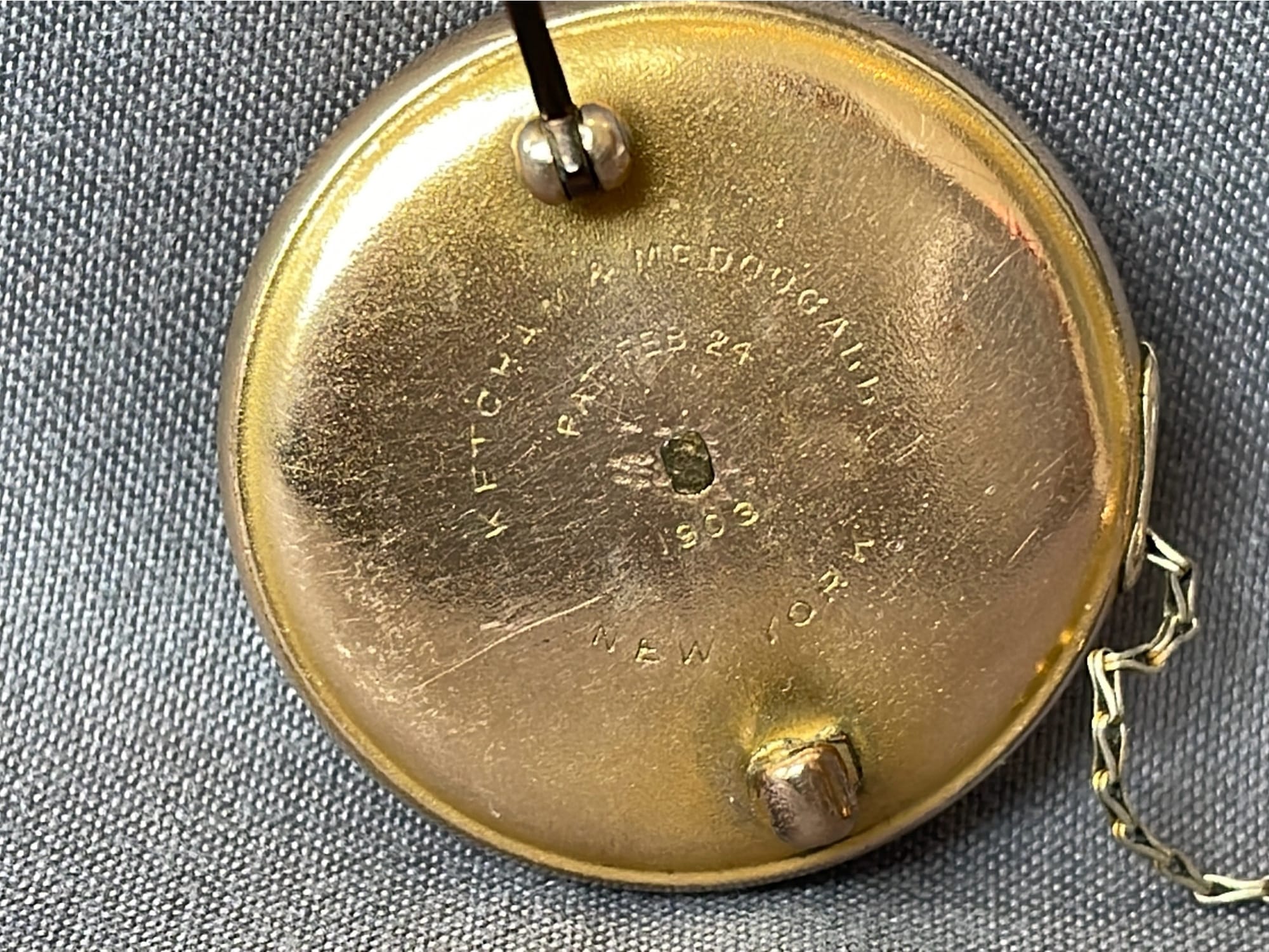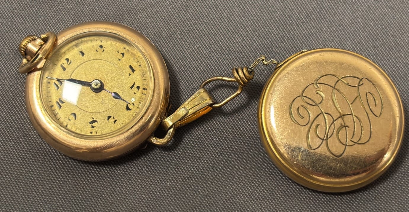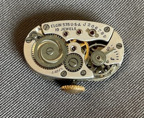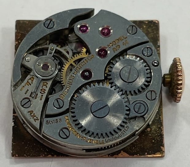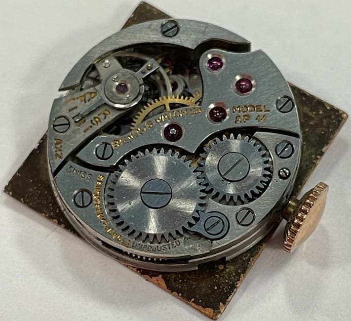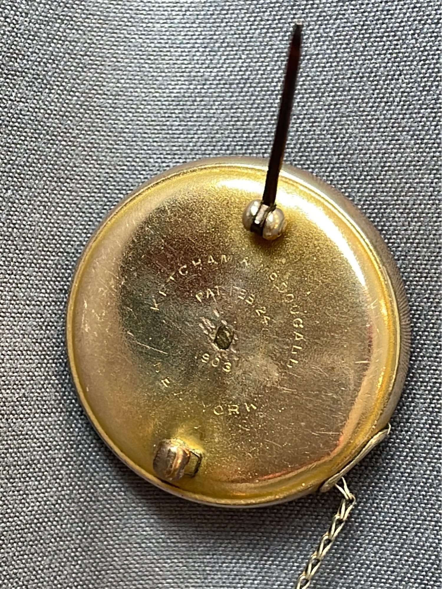 1064 1940s Munwill Watch Co. 7 Jewel Gold Tone Skeleton Watch Pin- Runs