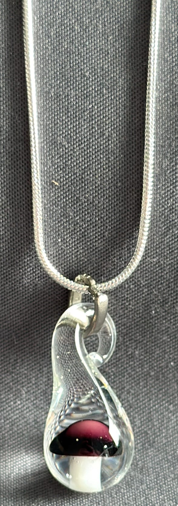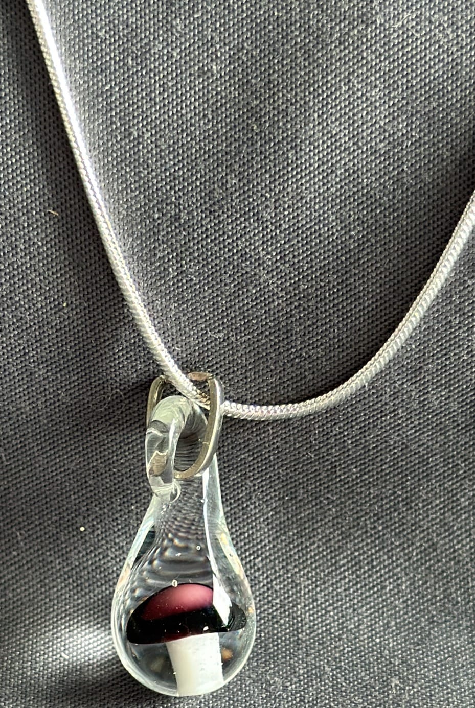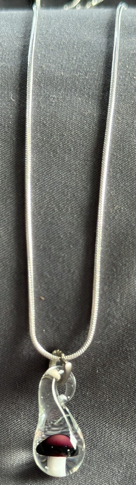 1065 1960s Hand Blown Glass Mushroom Pendant on 16 inch .925 Silver Chain