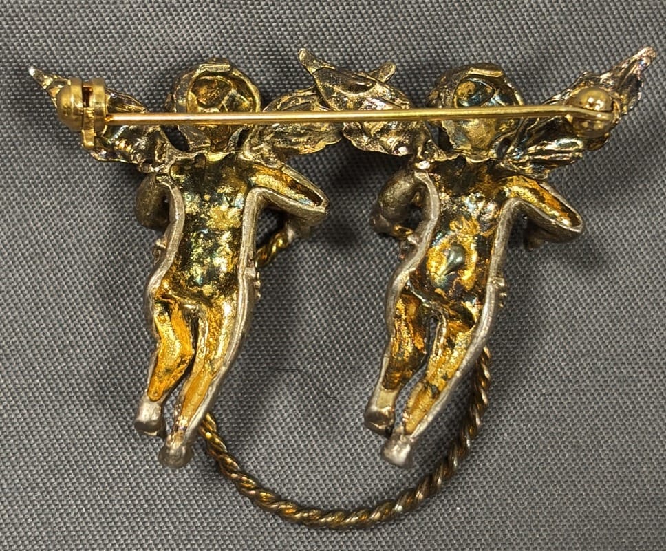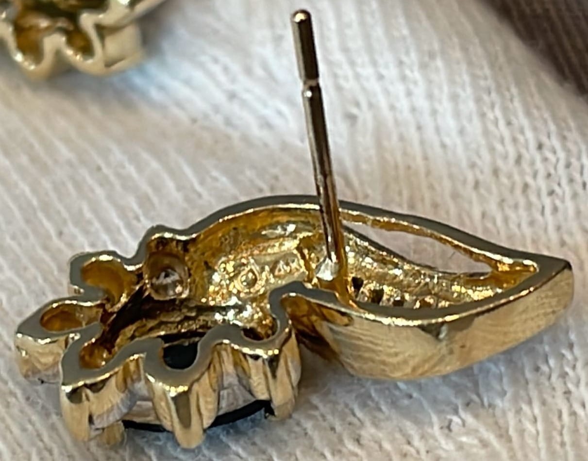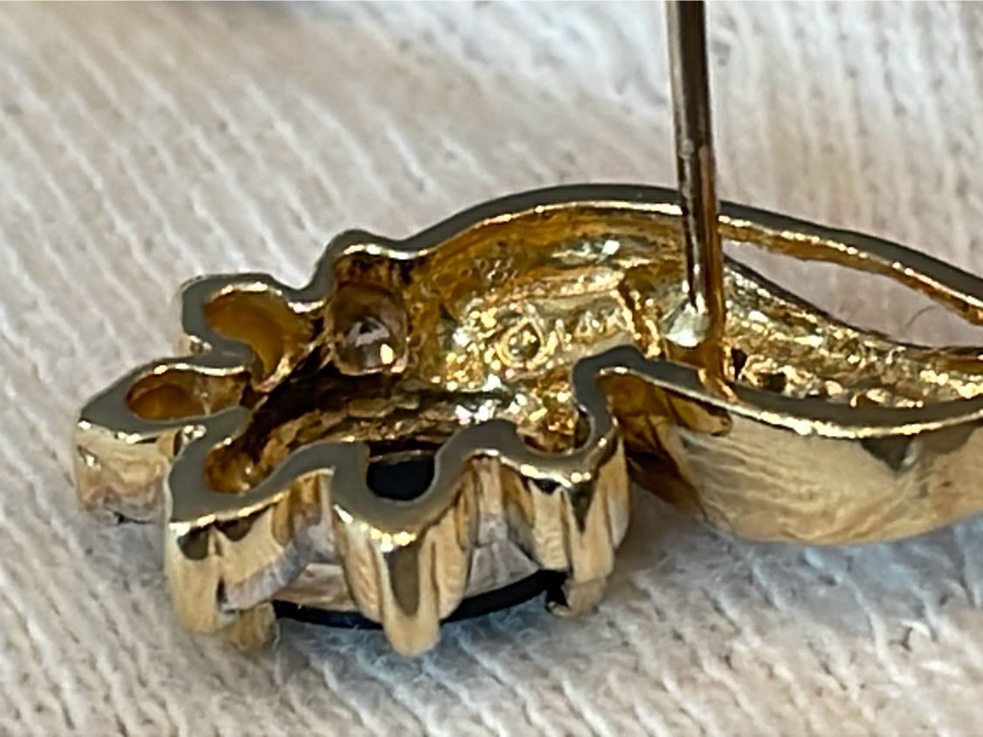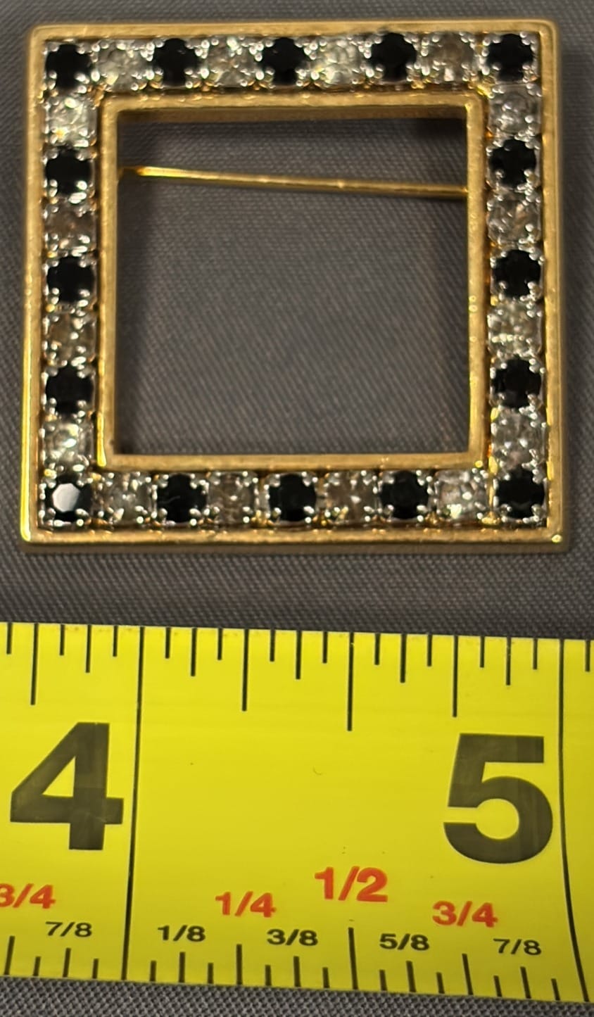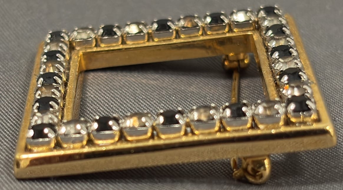 1126 1950s Gold Pin Unmarked with Black and Clear Faceted Stones
