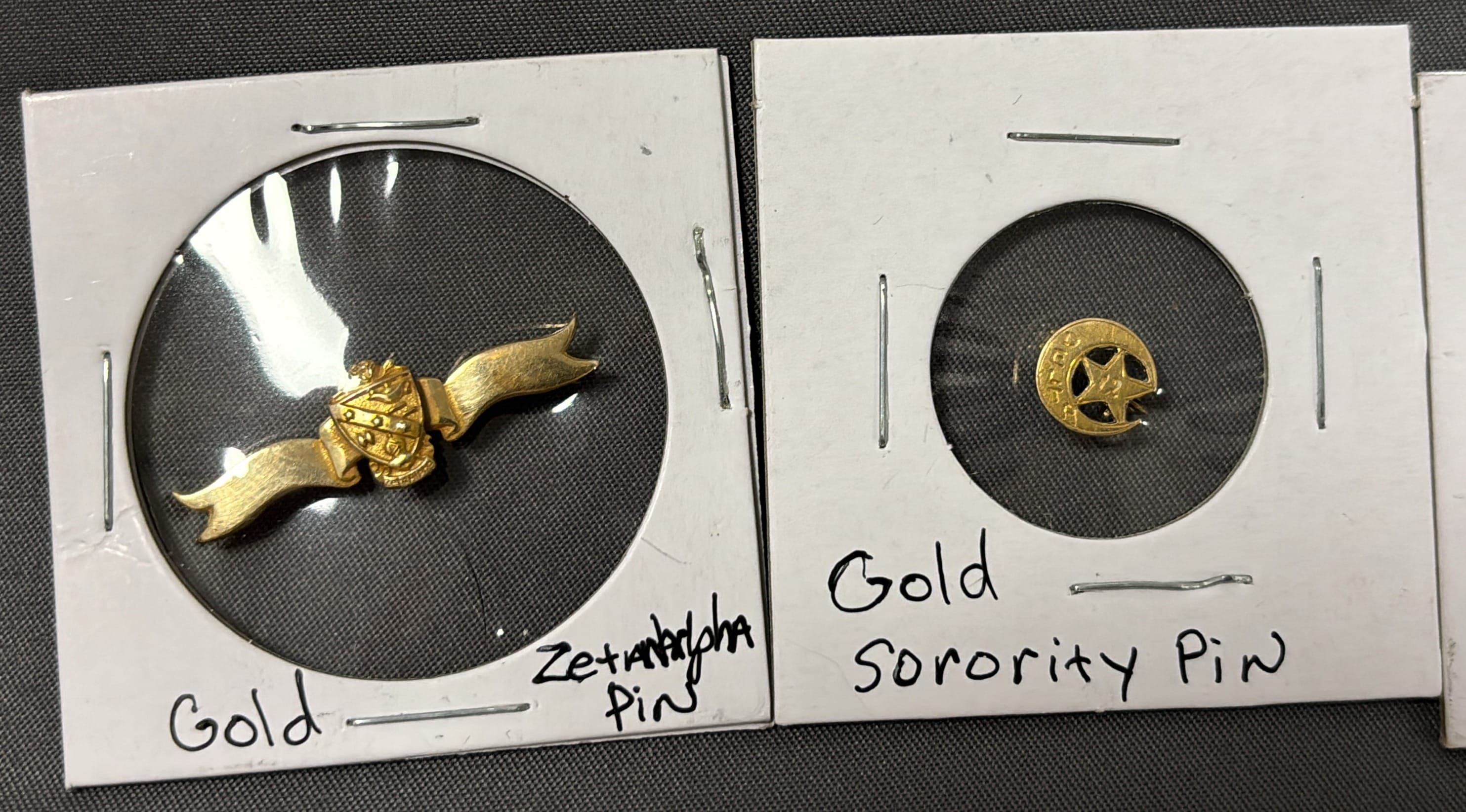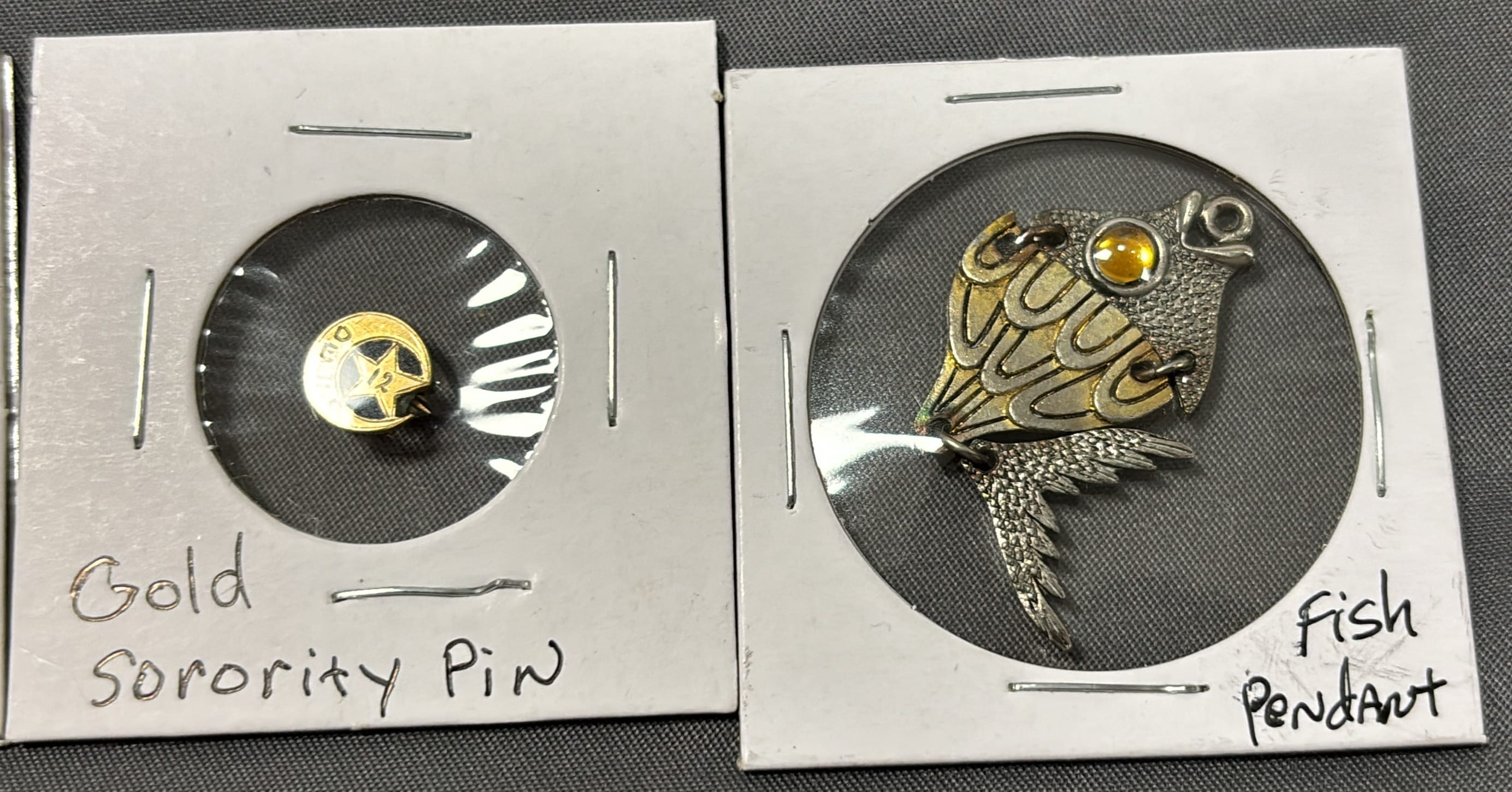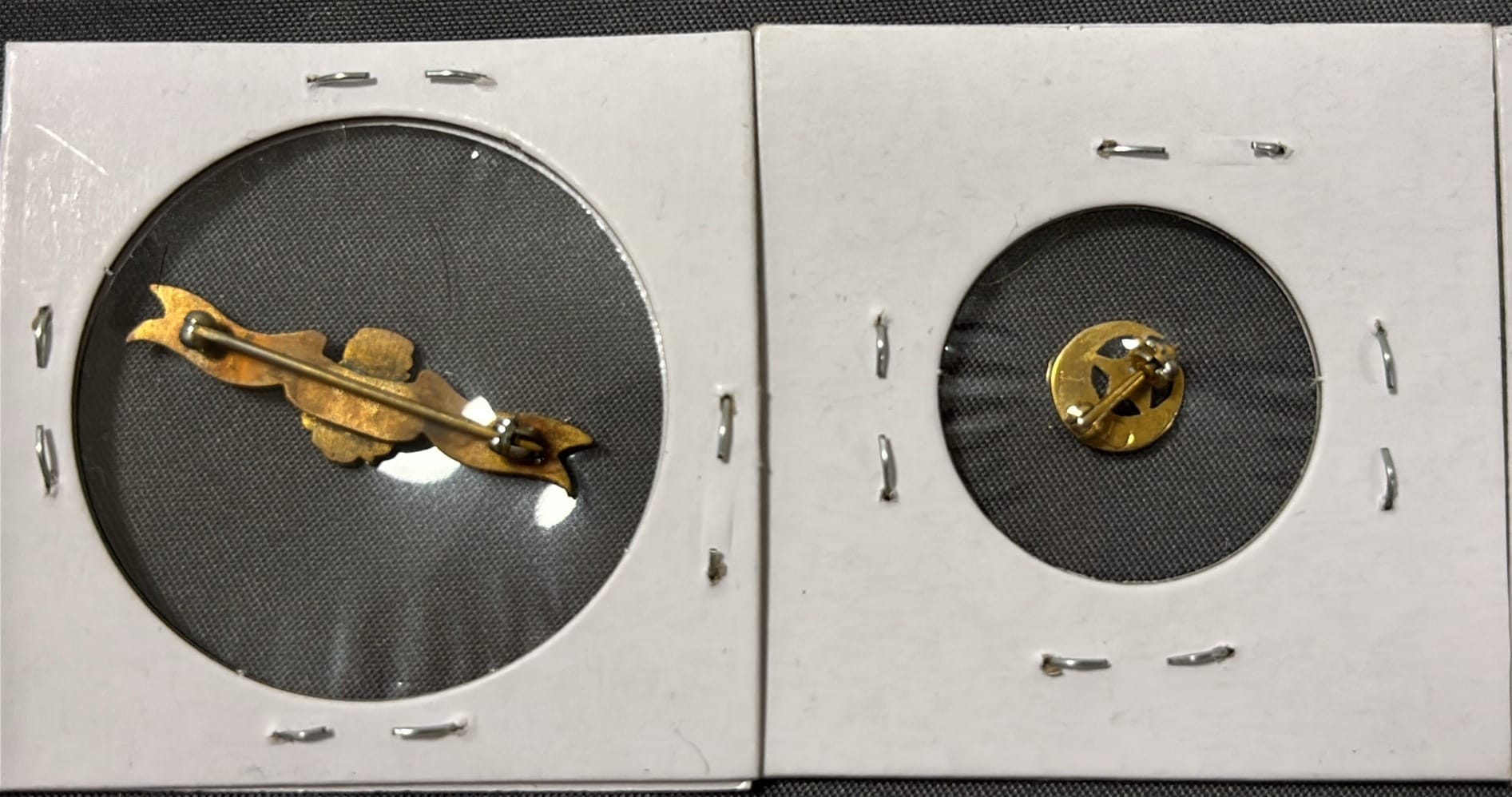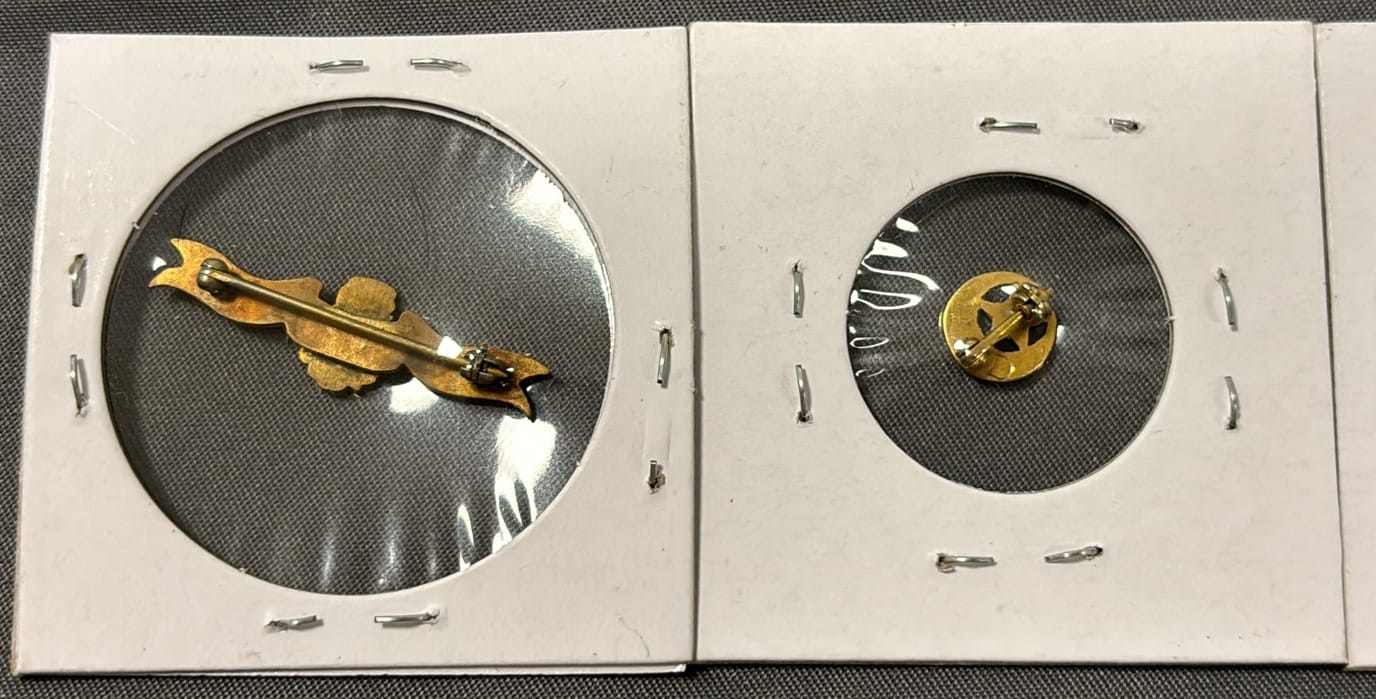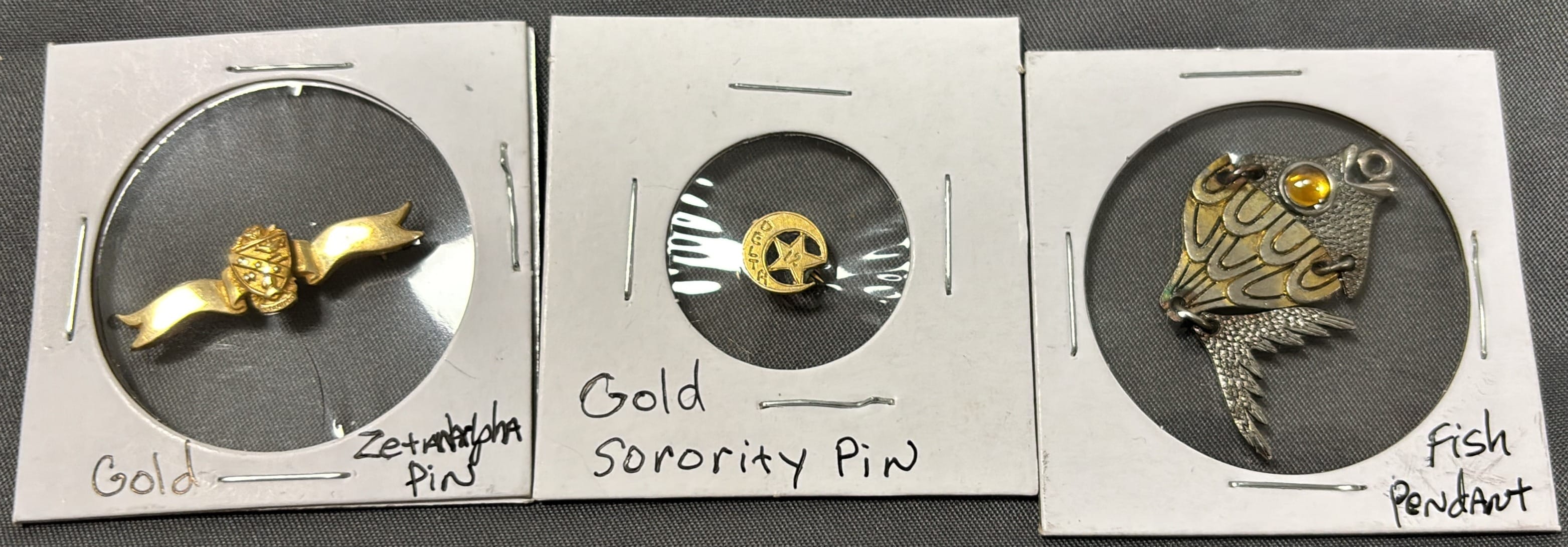 1122 2 Gold Sorority Pins Unmarked, 1 Metal Fish Pin