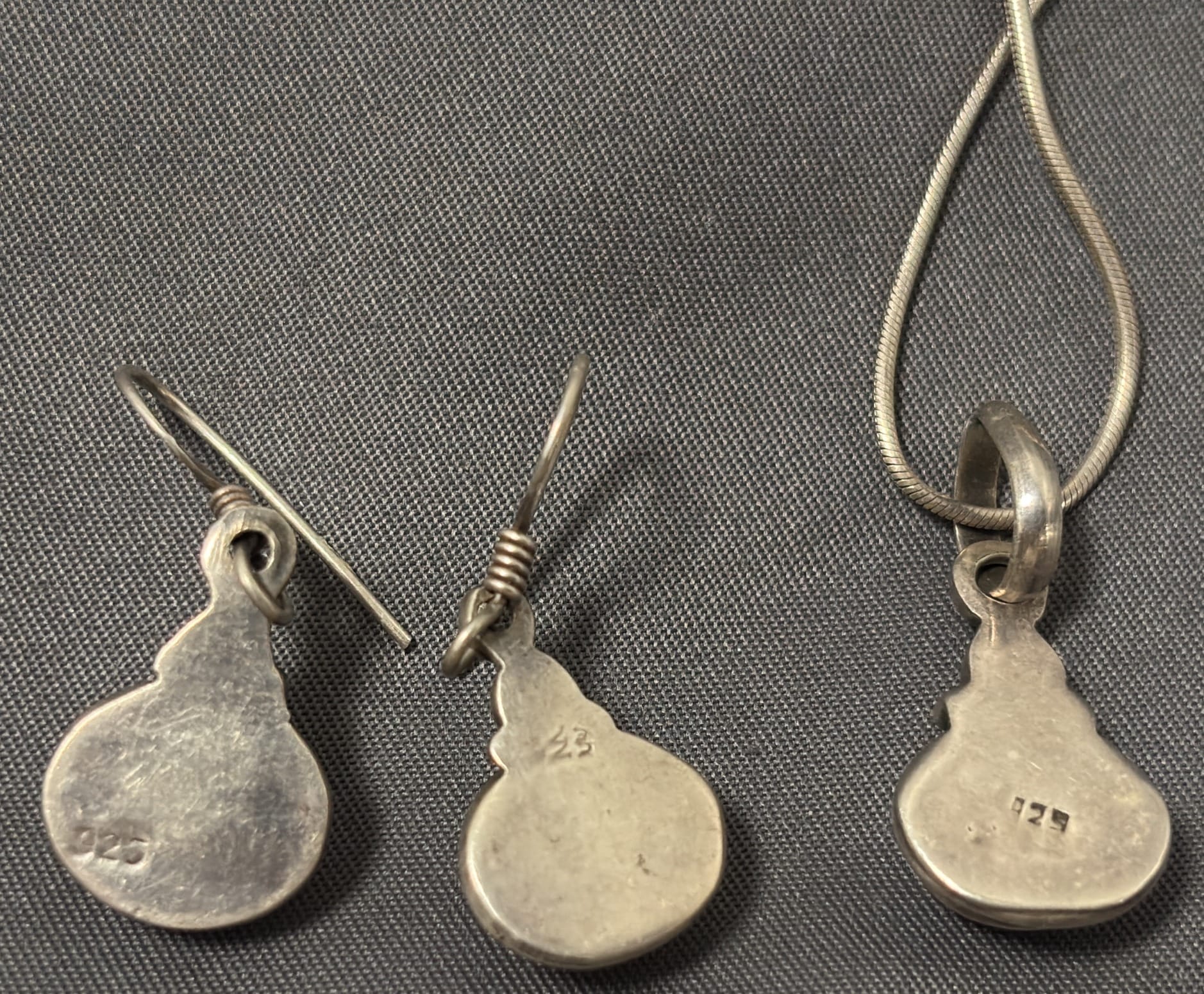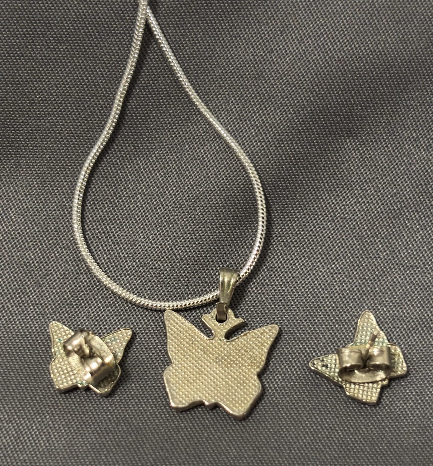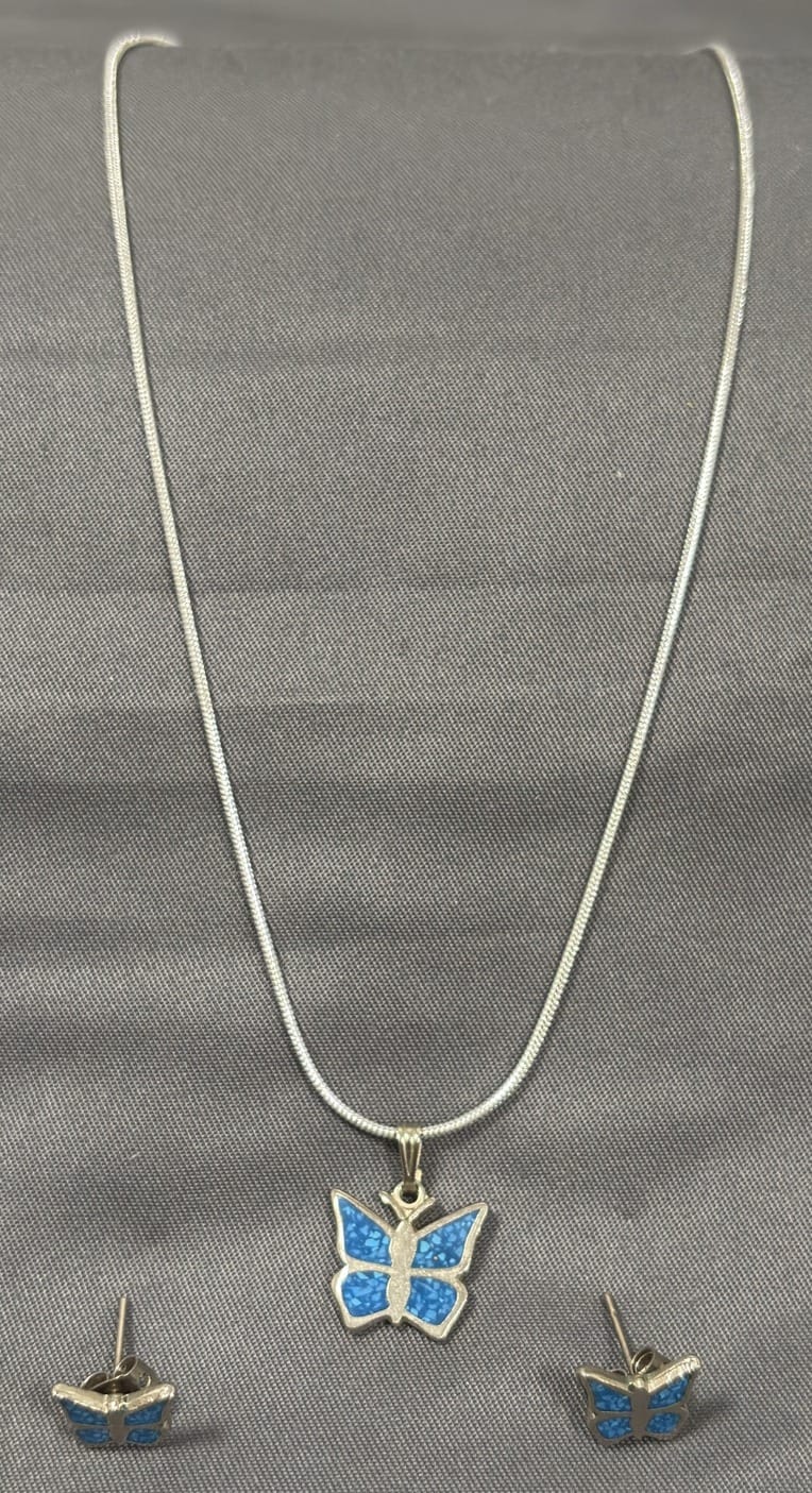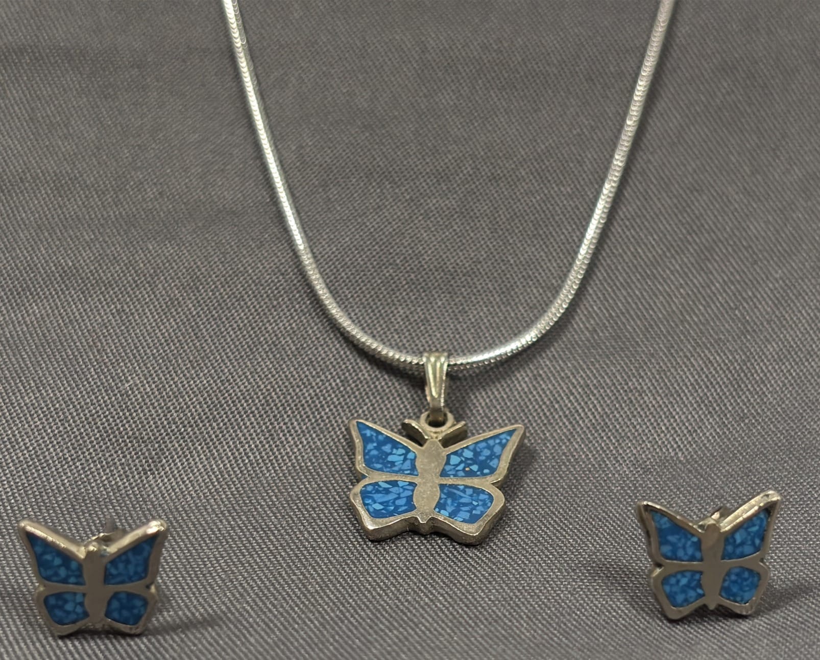 1086 Silver and Turquoise Unmarked Butterfly Earrings and Pendant Set on 16 inch .925 Silver Chain