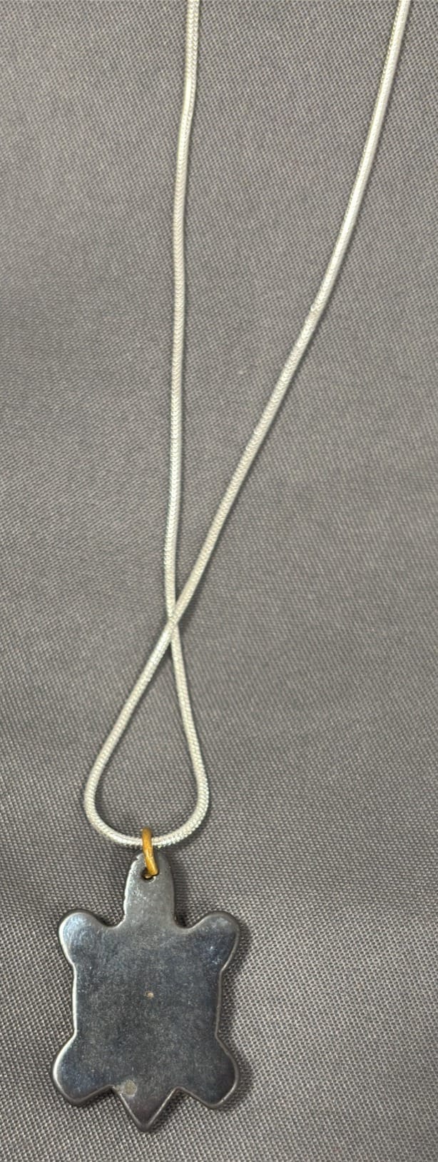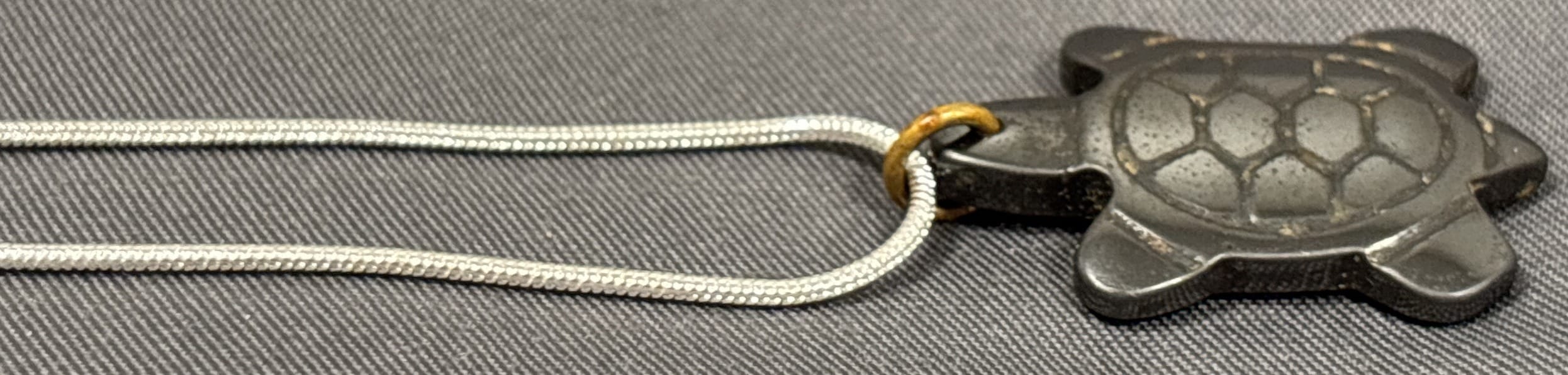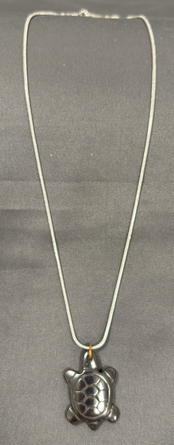 1091 Carved Hematite Stone Turtle Pendant on 16 inch .925 Silver Chain