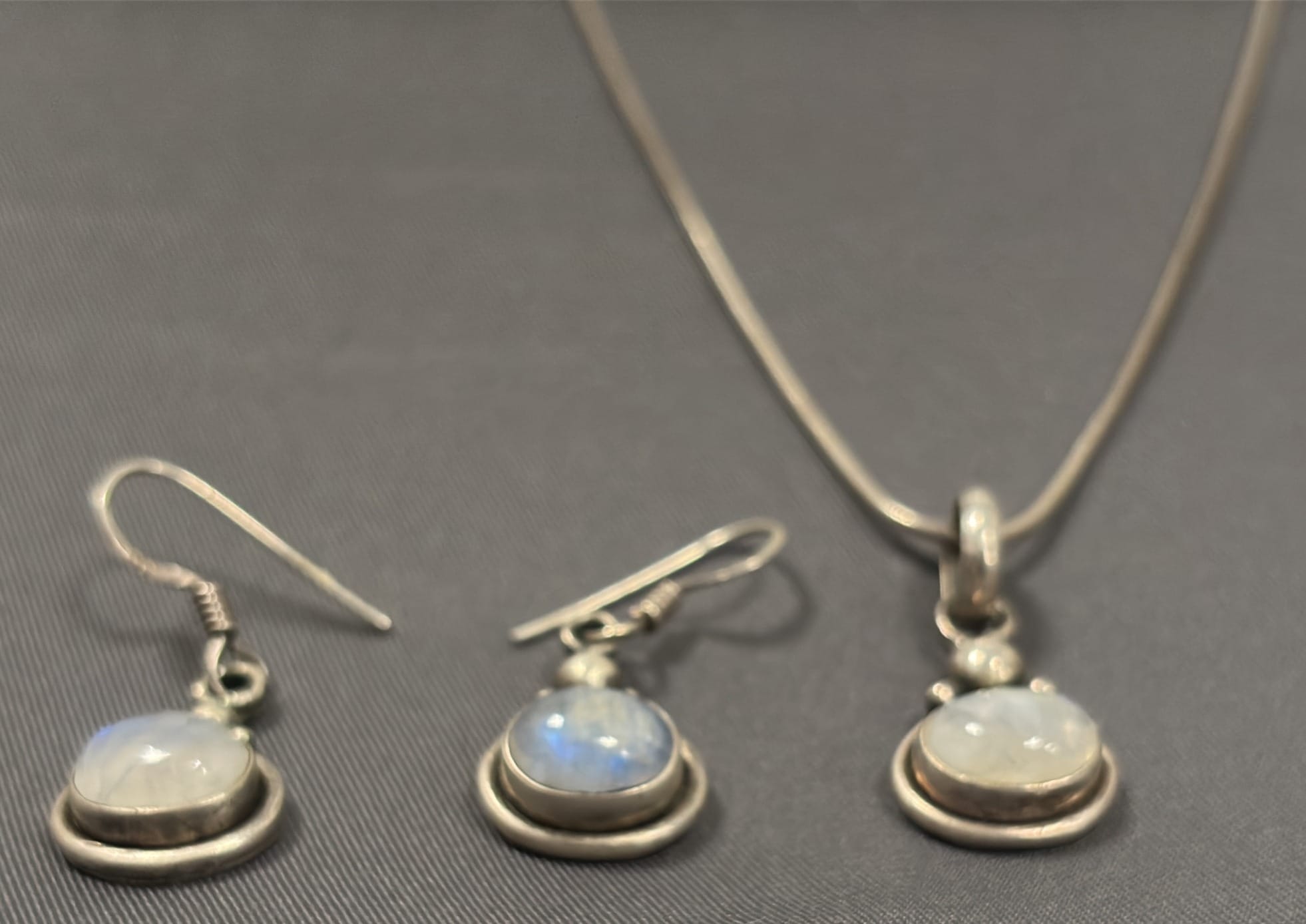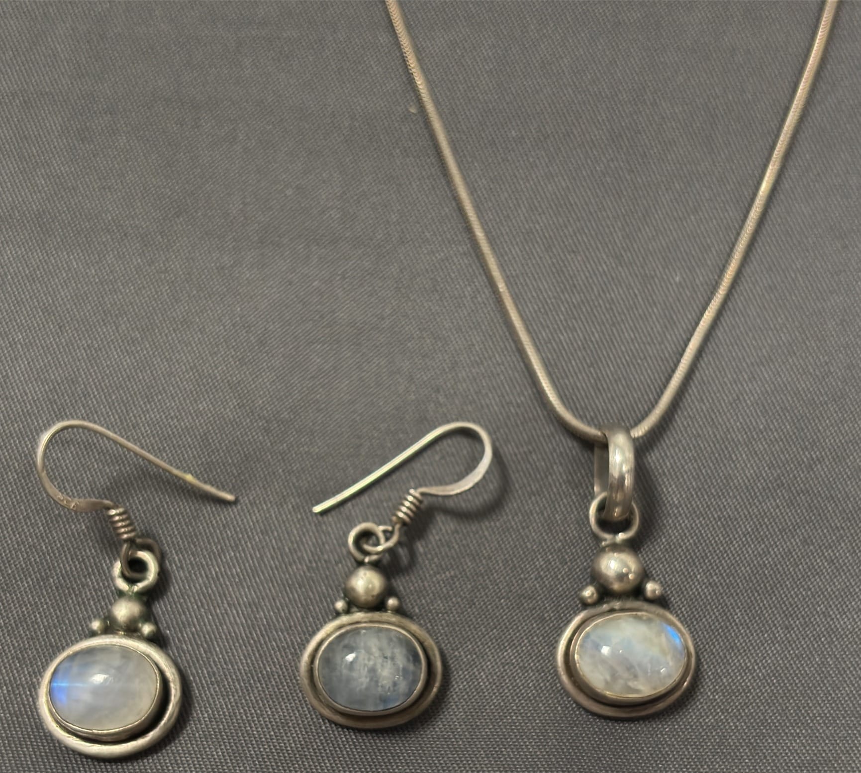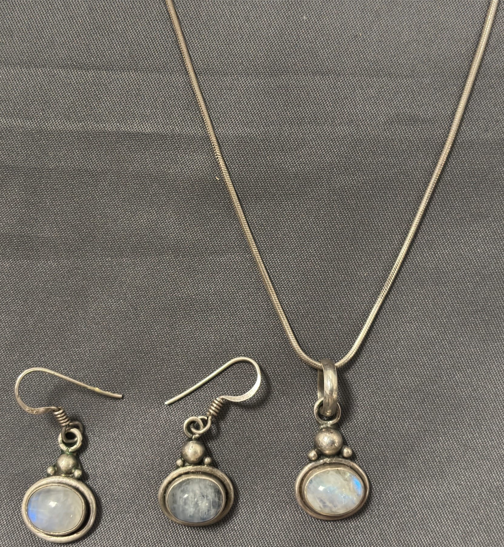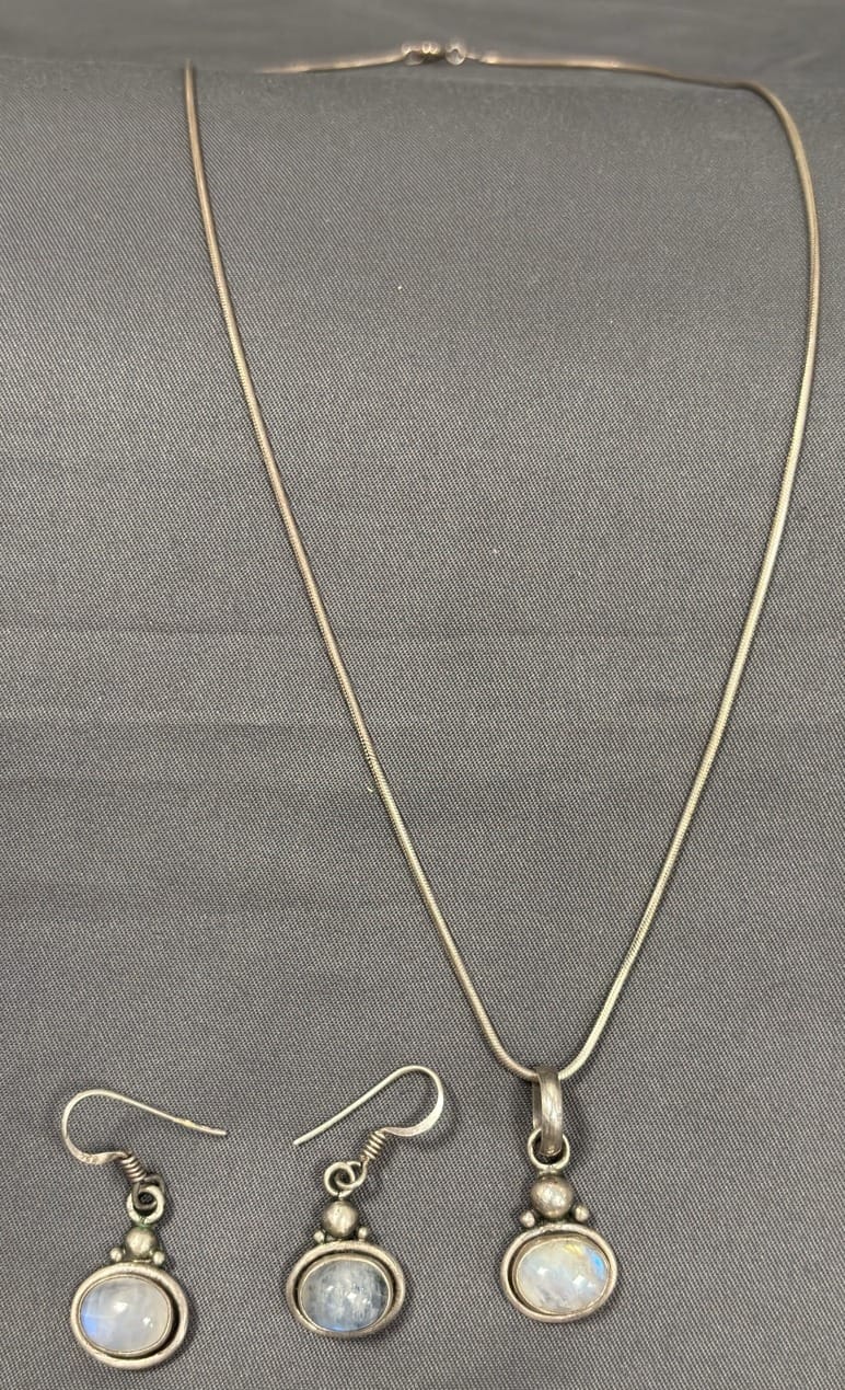 1093 Vintage .925 Silver and Moonstone Earrings and Necklace Set on 16 inch .925 Silver Chain