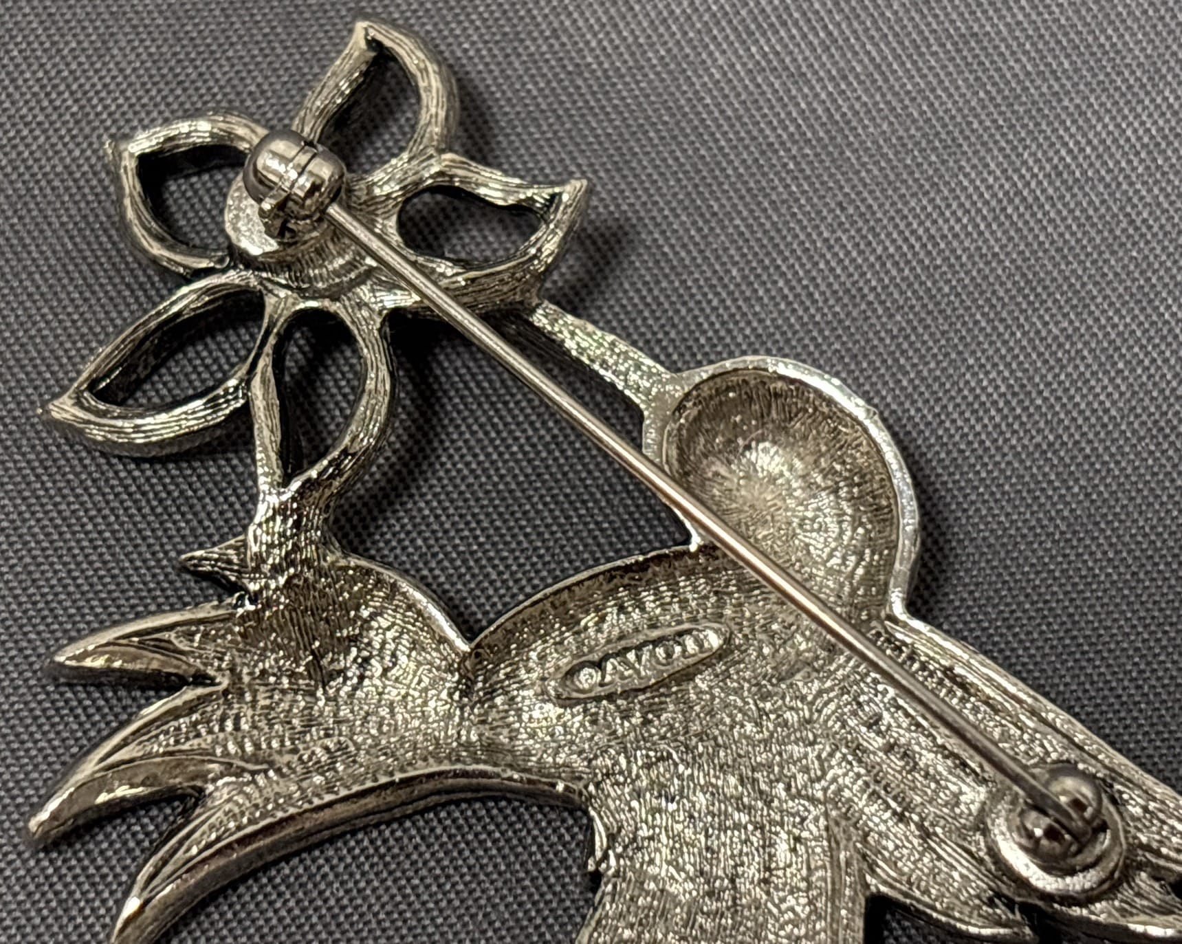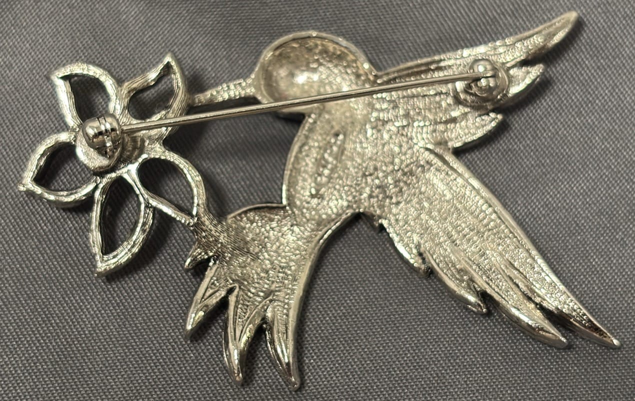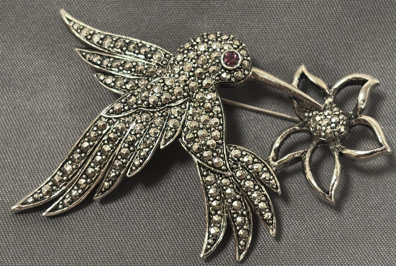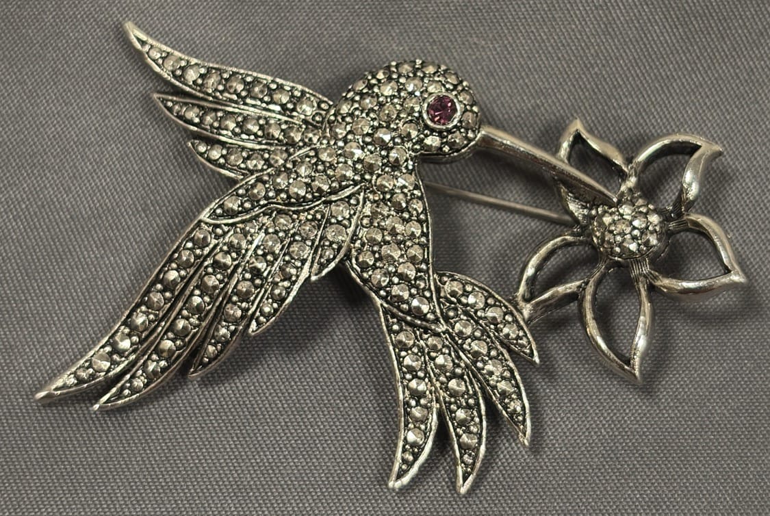 1104 1970s Hummingbird Pin with Marcasites and Purple Faceted Stone