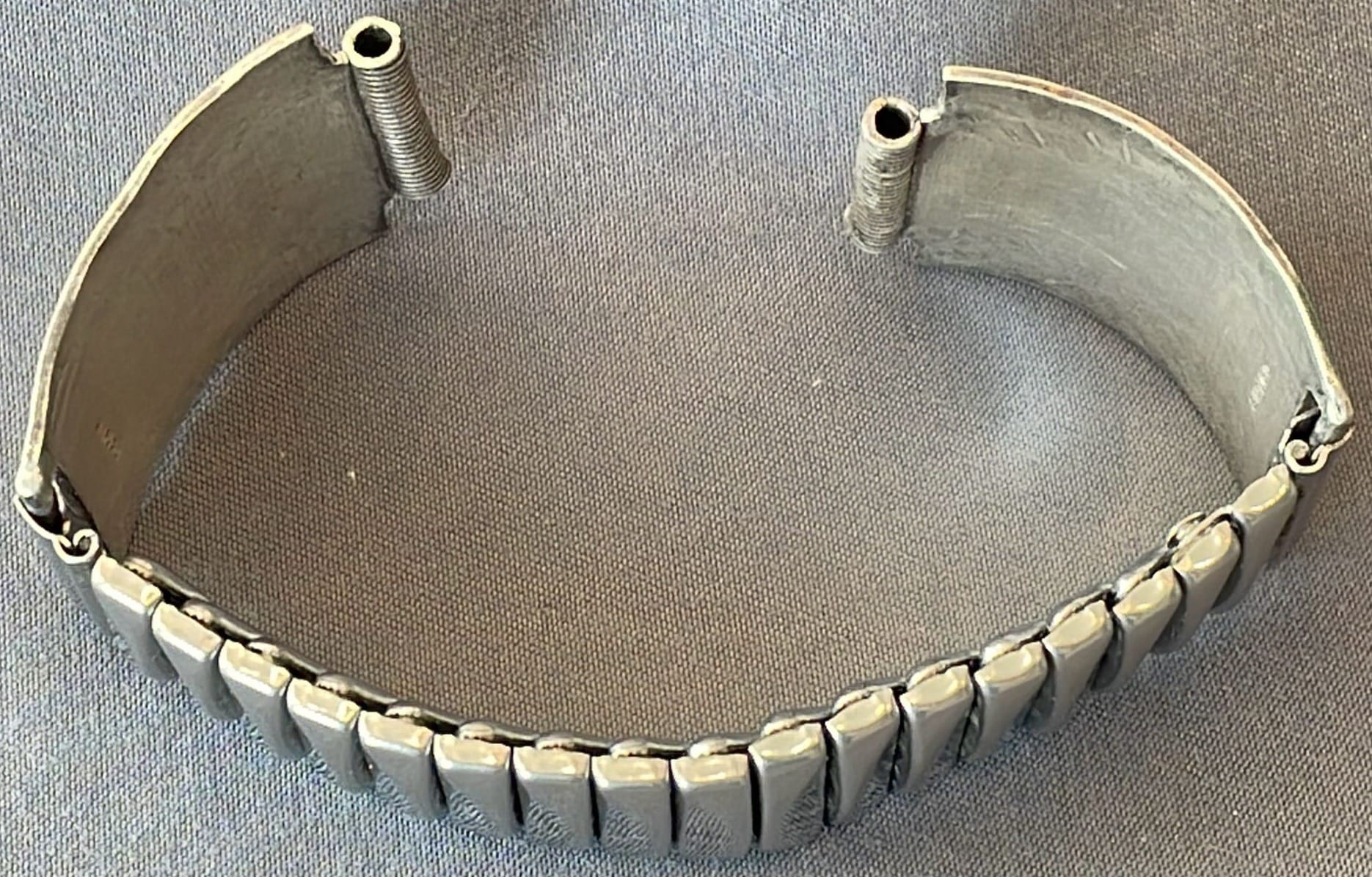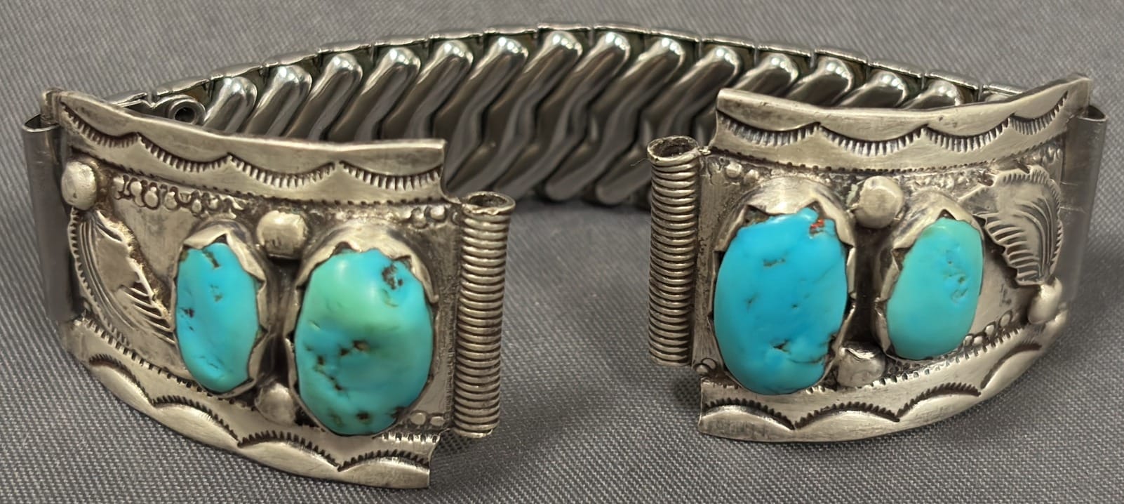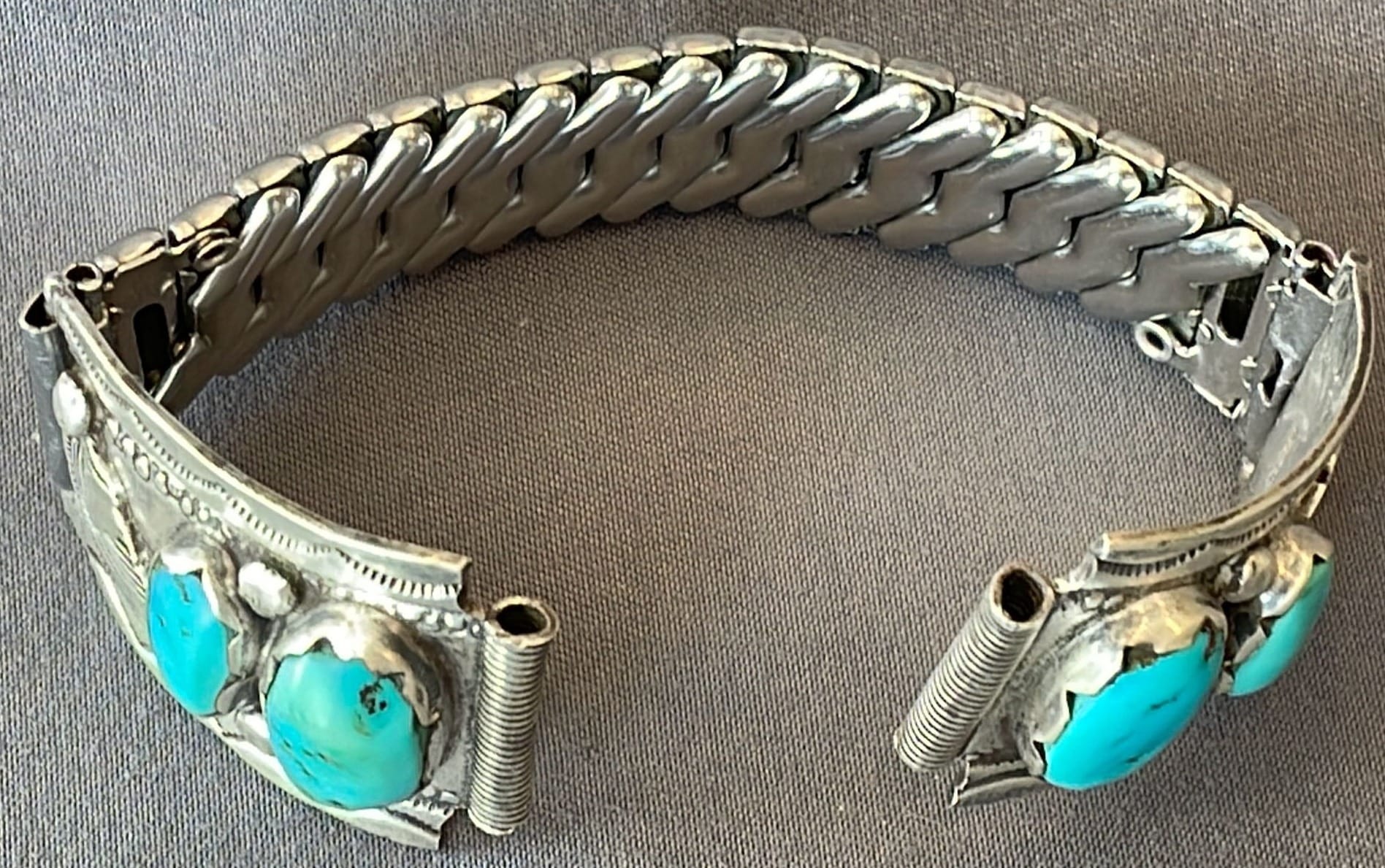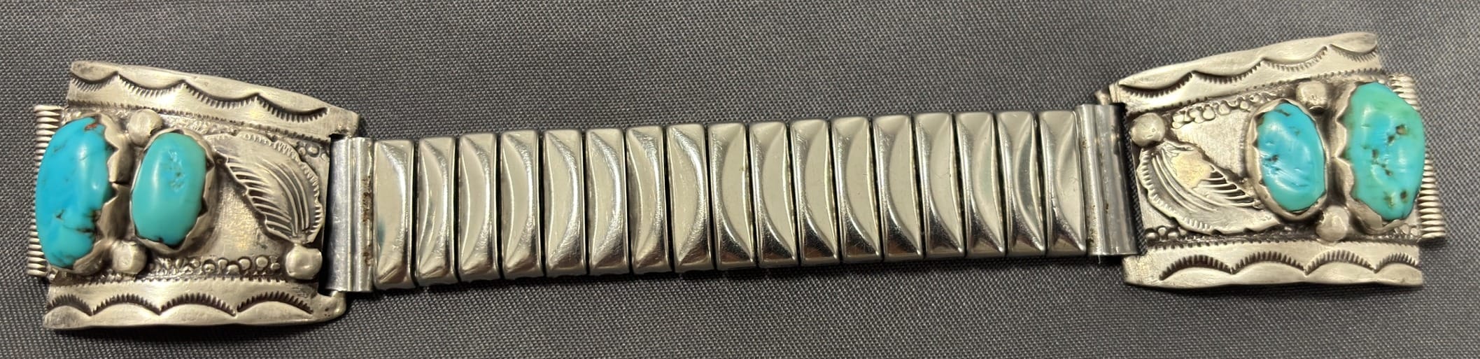 1107 1950s Men’s Watch Band with Turquoise Stones - Marked “Simpligio” - Expands 5.75 Inches to 8 Inches