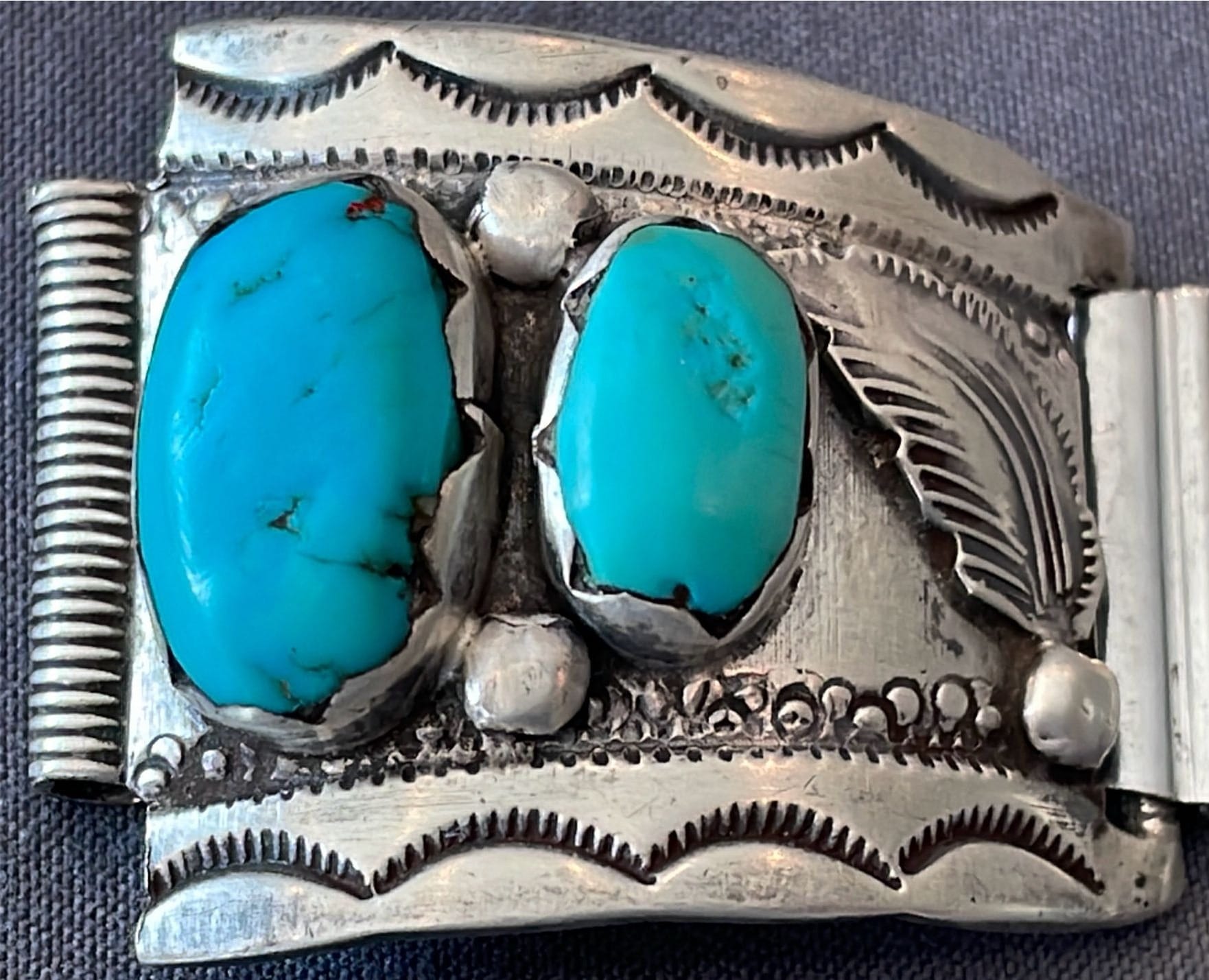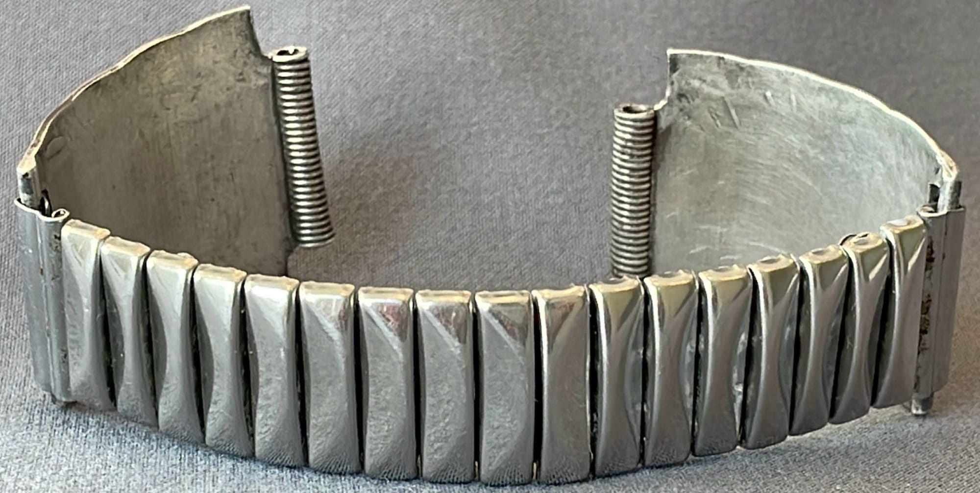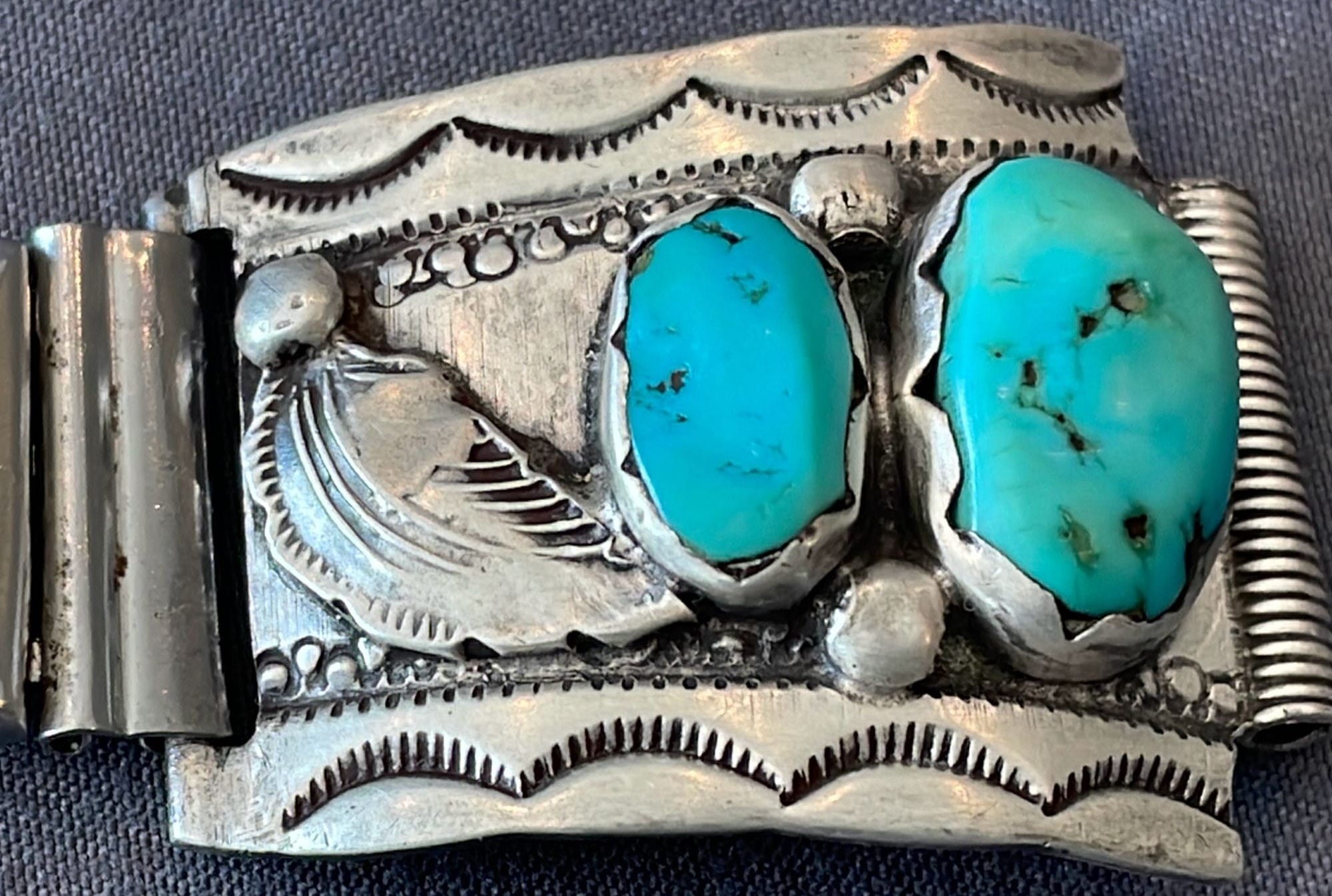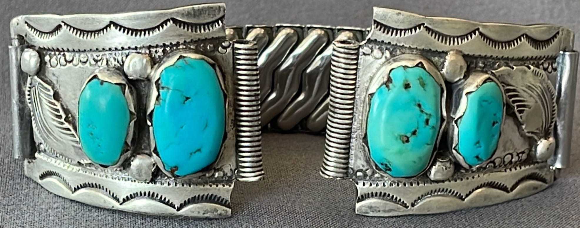 1107 1950s Men’s Watch Band with Turquoise Stones - Marked “Simpligio” - Expands 5.75 Inches to 8 Inches