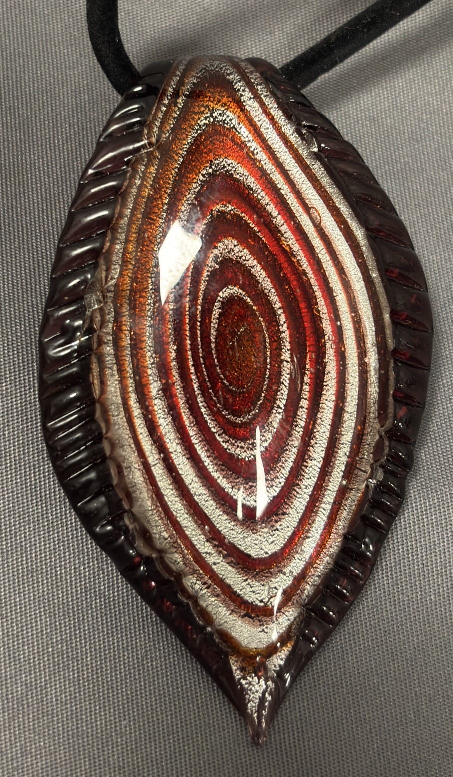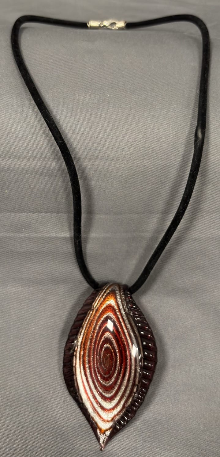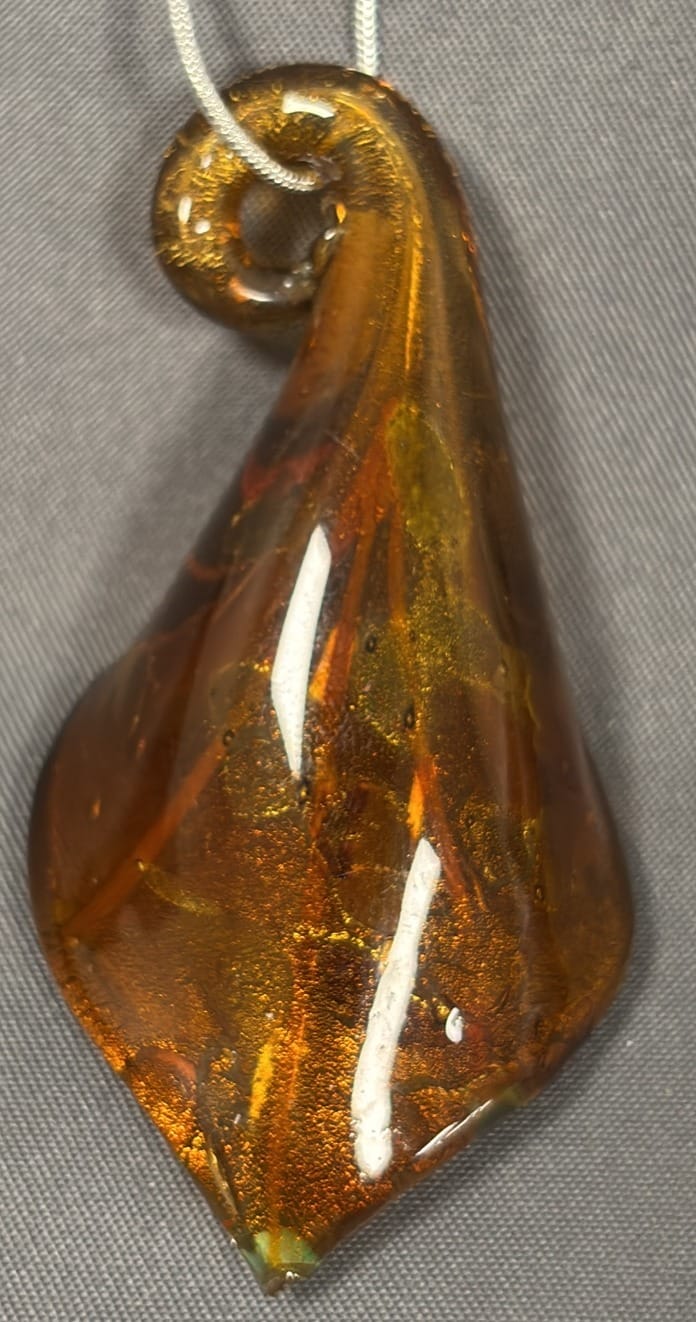 1118 1970s Hand tooled Amber Glass Pendant on 16 inch Blacked Corded Chain