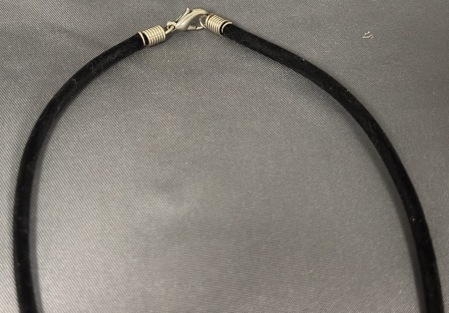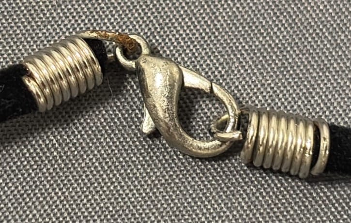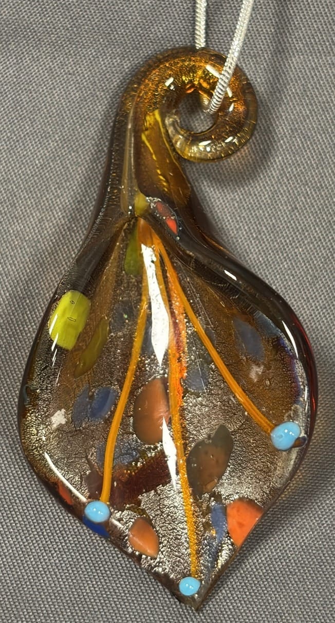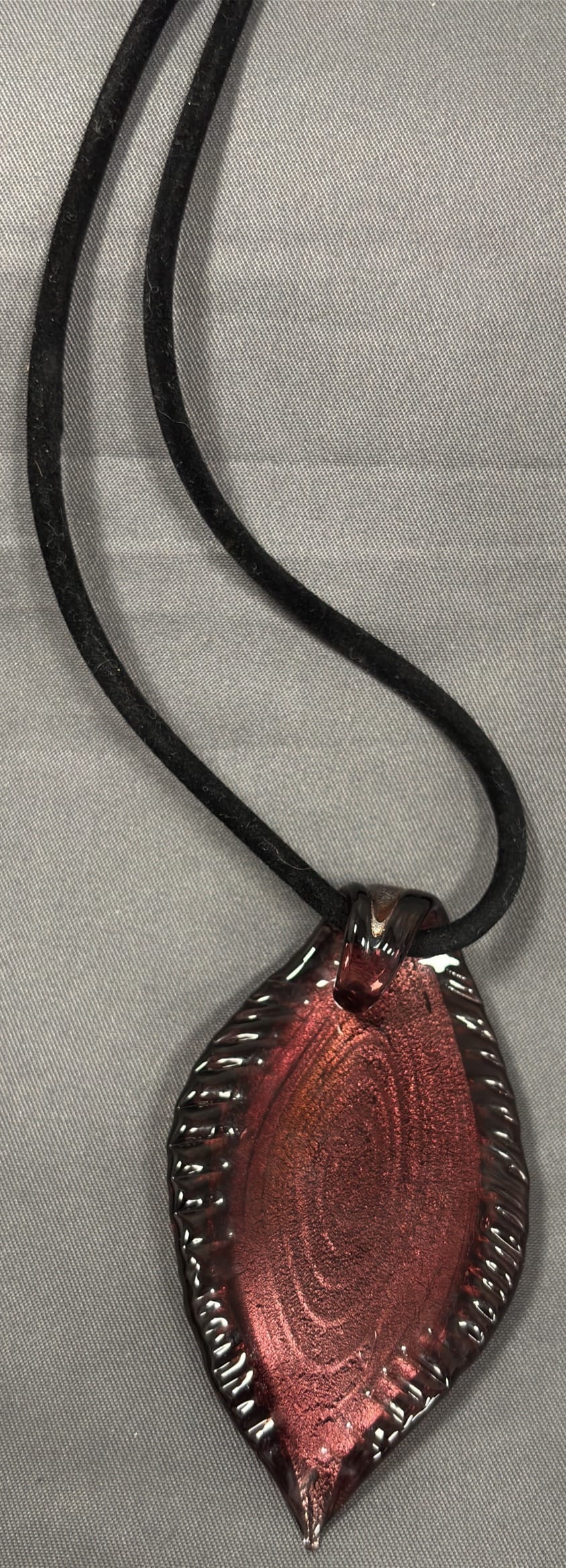 1118 1970s Hand tooled Amber Glass Pendant on 16 inch Blacked Corded Chain