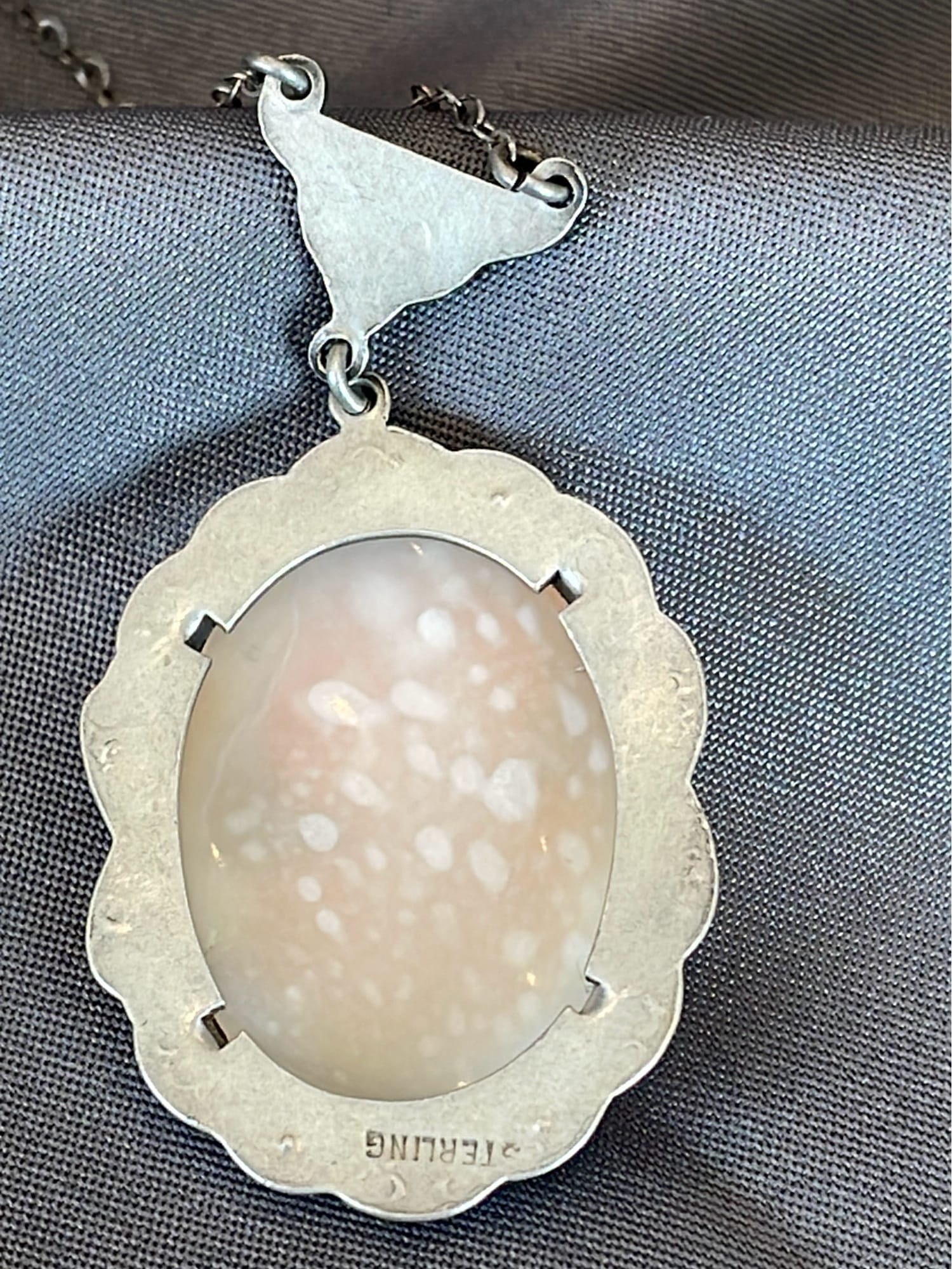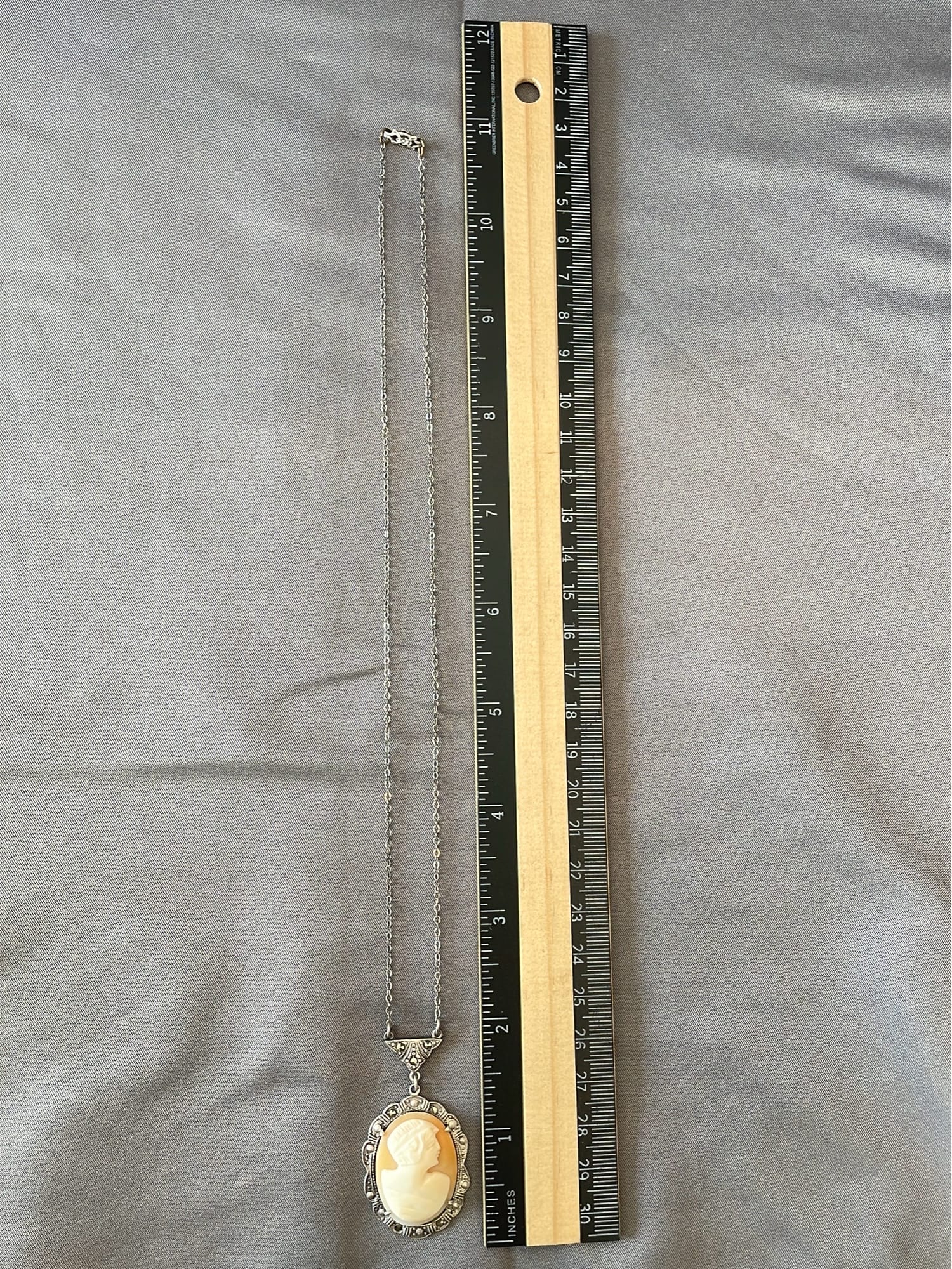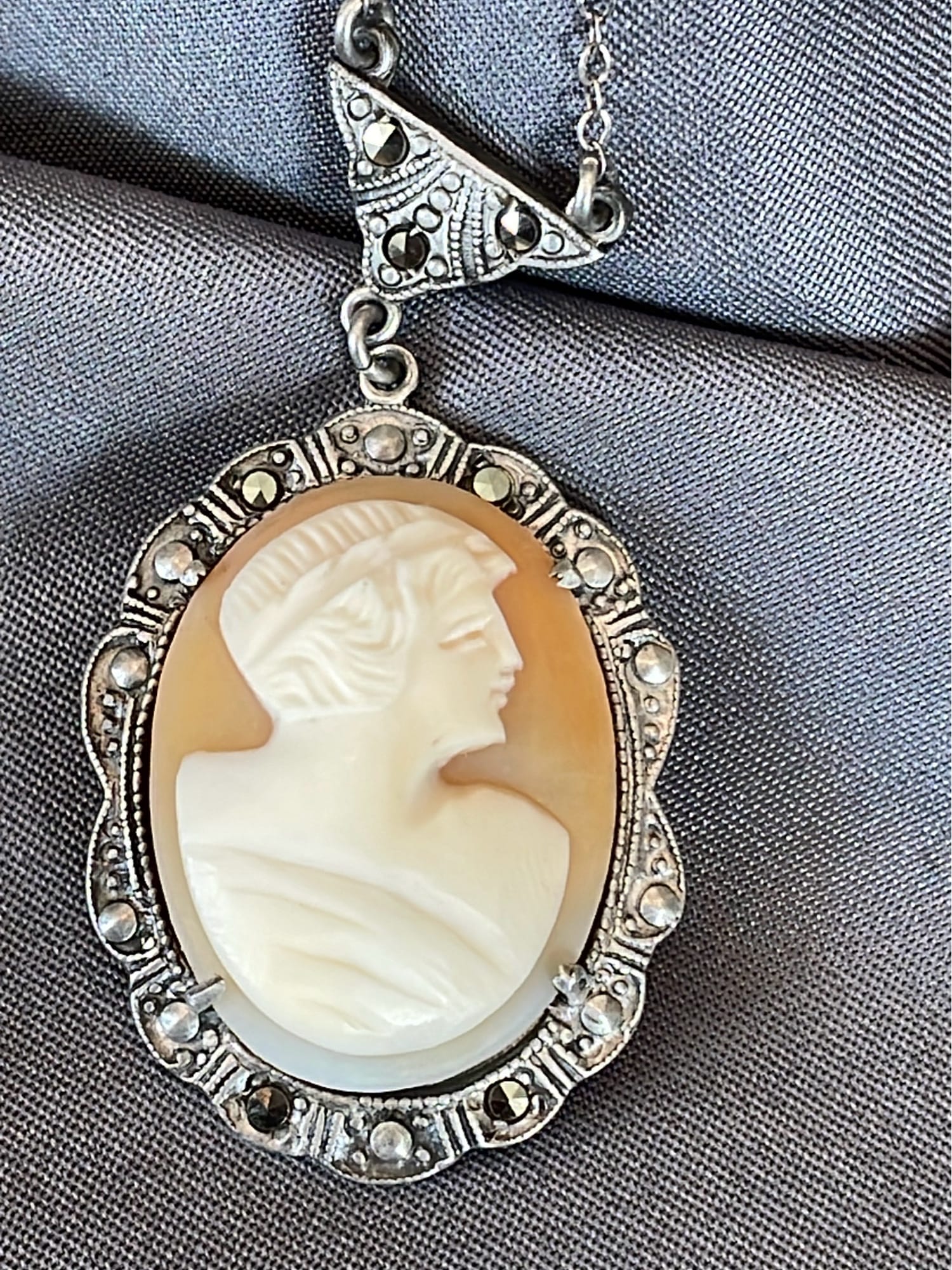 1141 1800s .925 Silver Carved Shell Cameo Pendant with Marcasite and .925 Silver Chain