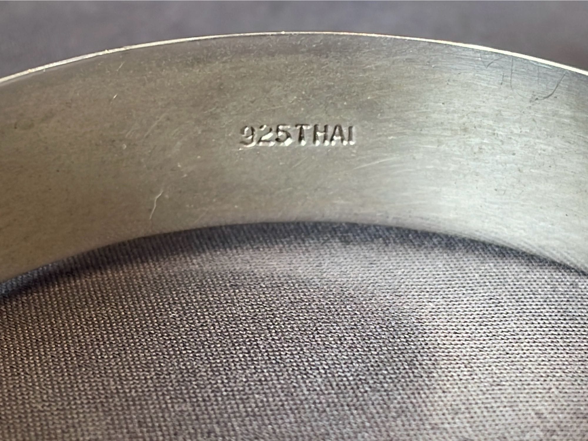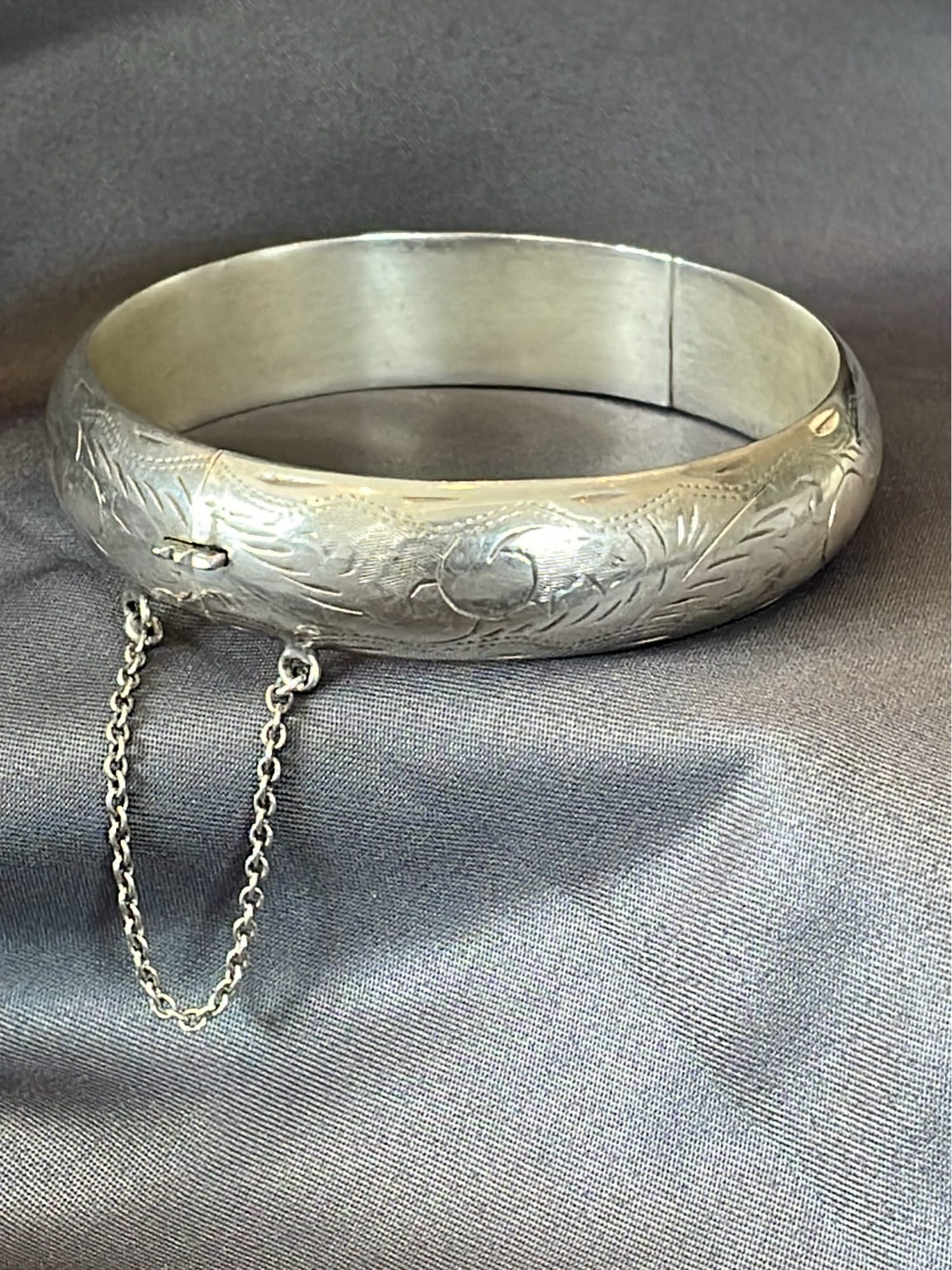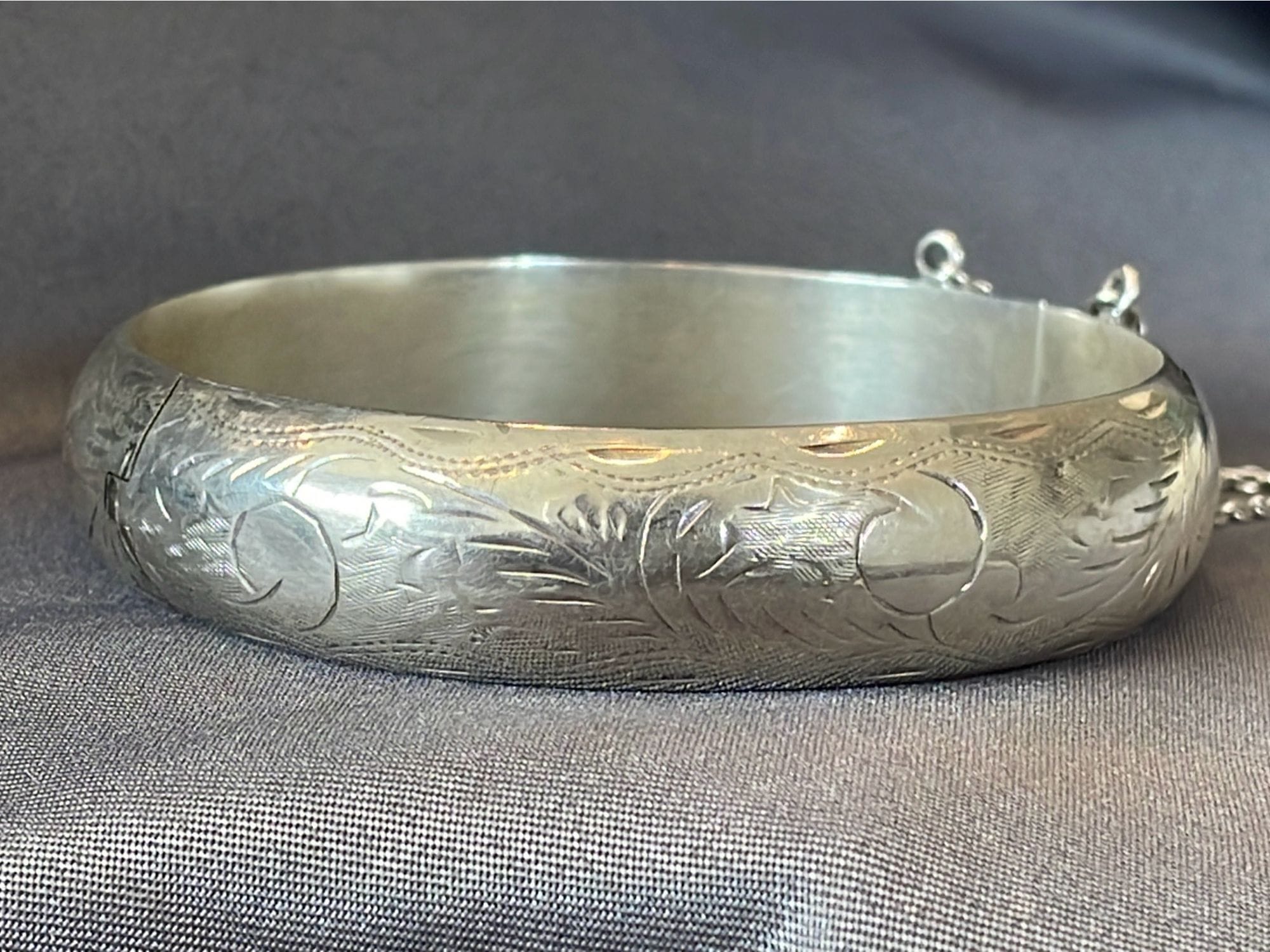 1145 1860s Etched .925 THAI Silver Bangle Bracelet with Safety Chain Lock