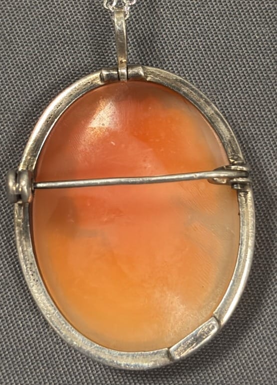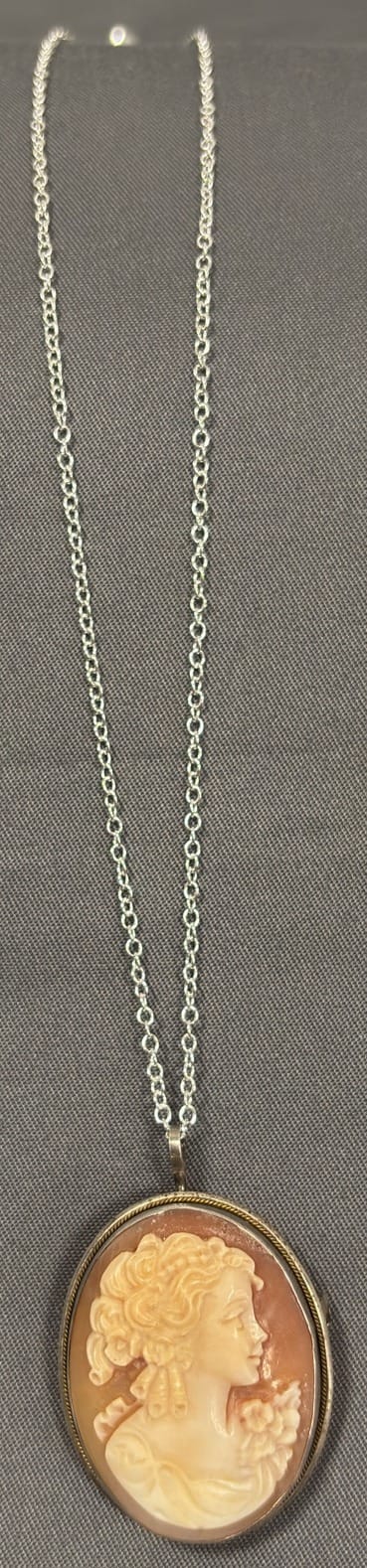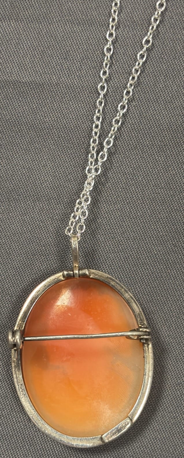 1149 1940s Sterling and Carved Shell Cameo Pin/Pendant on 16 inch .925 Silver Chain