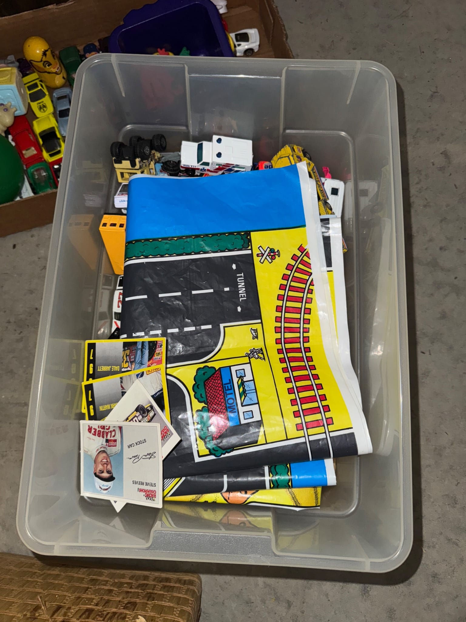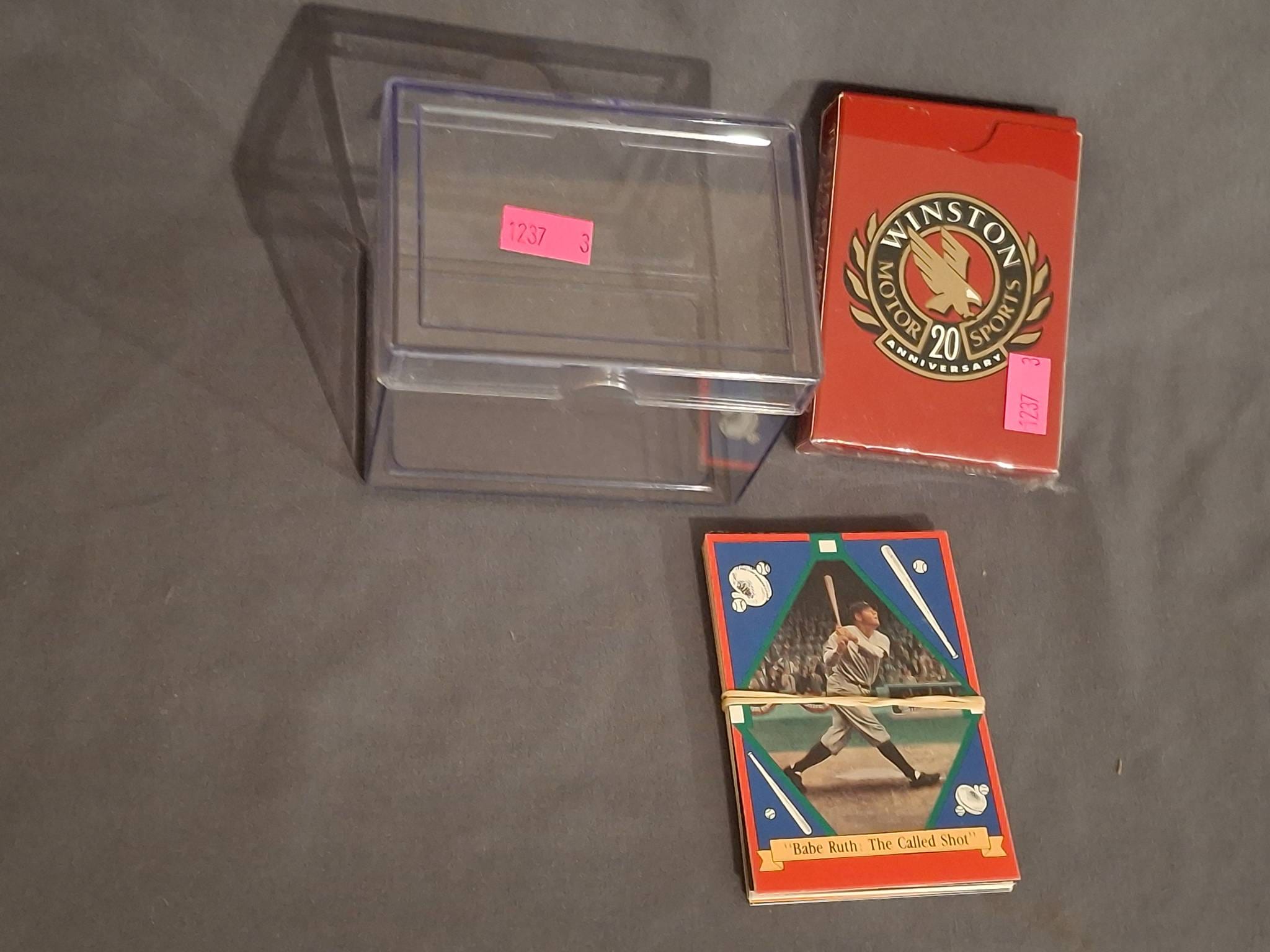 1237 Group of Sports Trading Cards, Clear Storage Box, and Winston Motor Sports Anniversary Playing Cards
