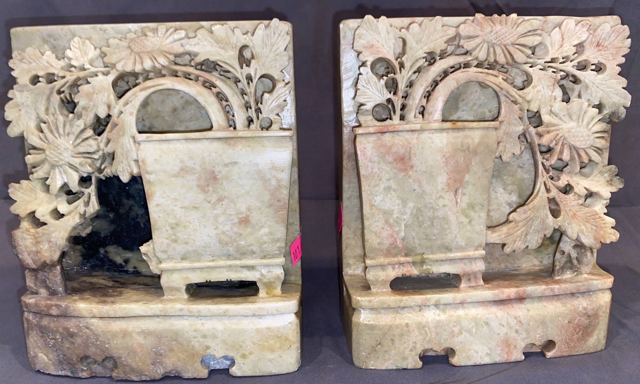 101 Carved Stone Bookends with Floral Basket Motif