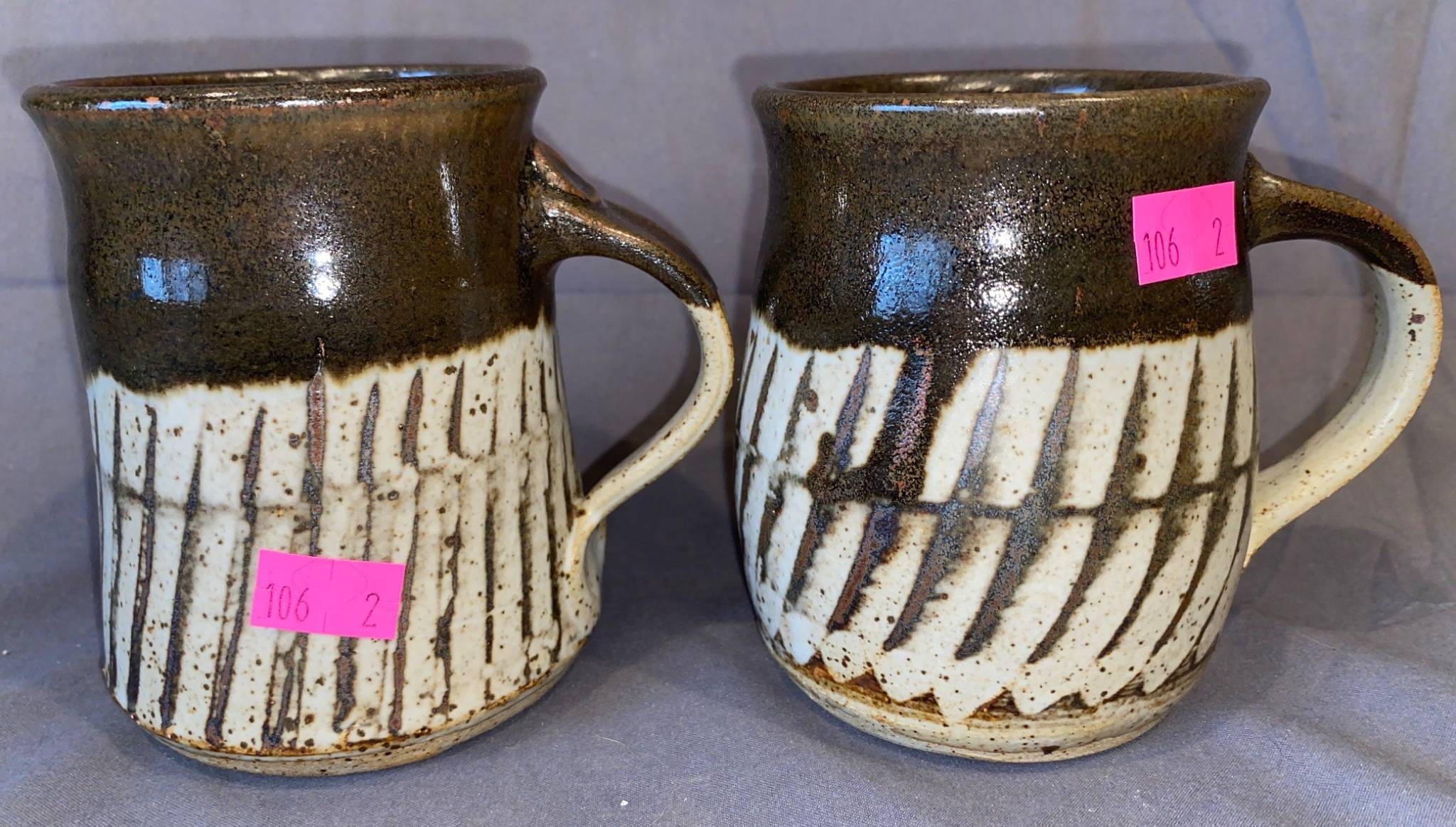 106 Stoneware Mugs with Brown and White Glaze, Signed on Base