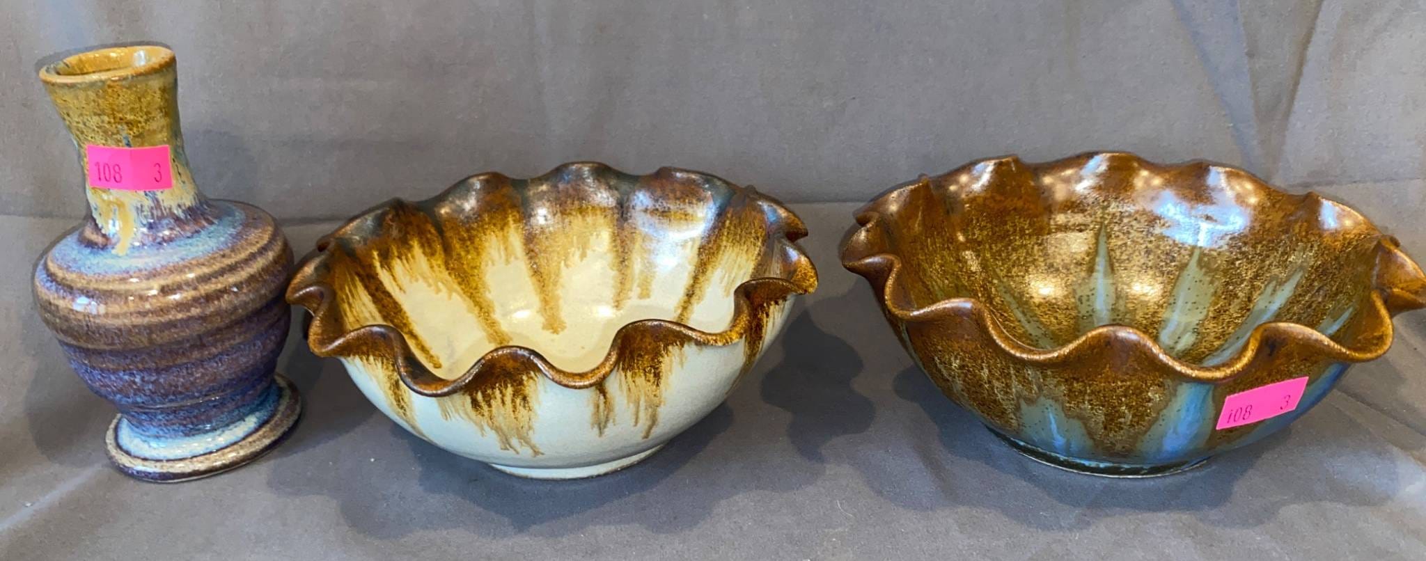 108 Pigeon Forge Pottery Pieces with Glazed Ruffled-Edge Bowls and Vase