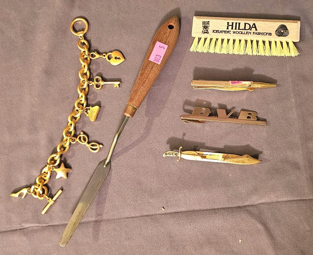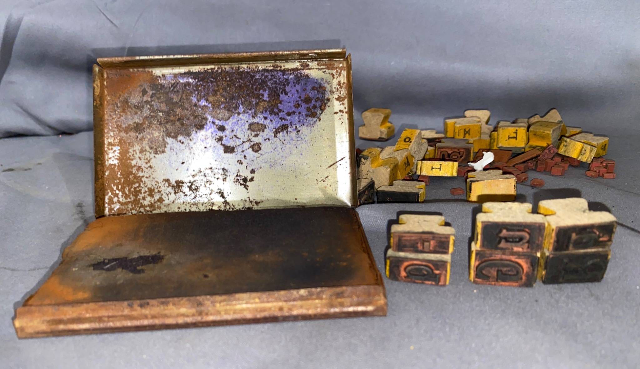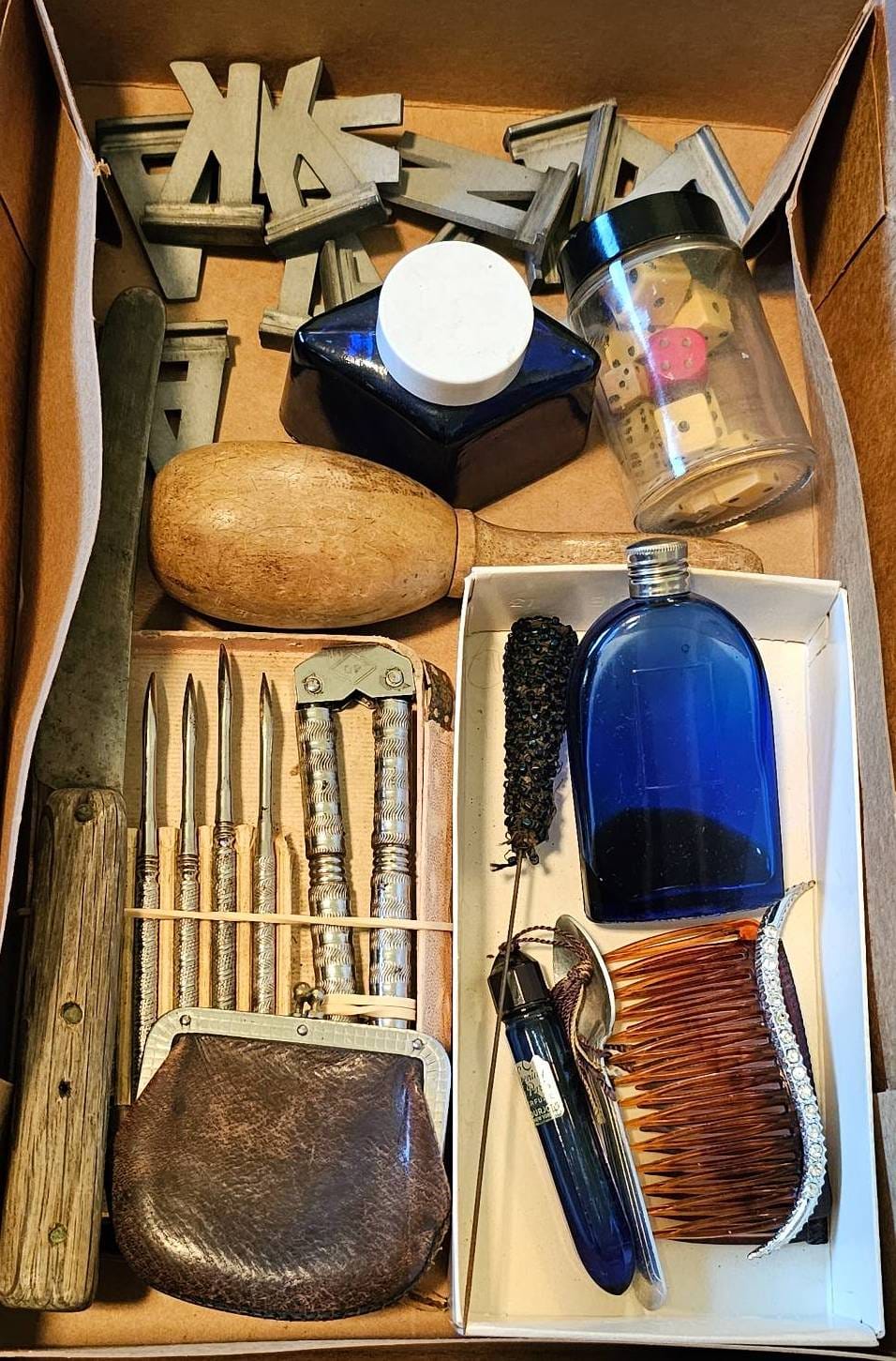 413 Metal Letters, Blue Glass Ink Bottle, Nut Cracker Set, Dice & Misc.