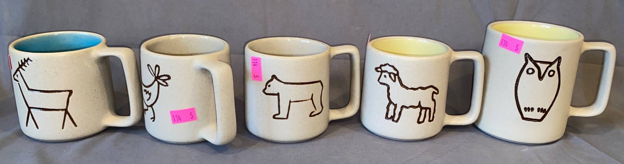 114 Set of Five Pigeon Forge Pottery Mugs with Hand-Drawn Animal Designs